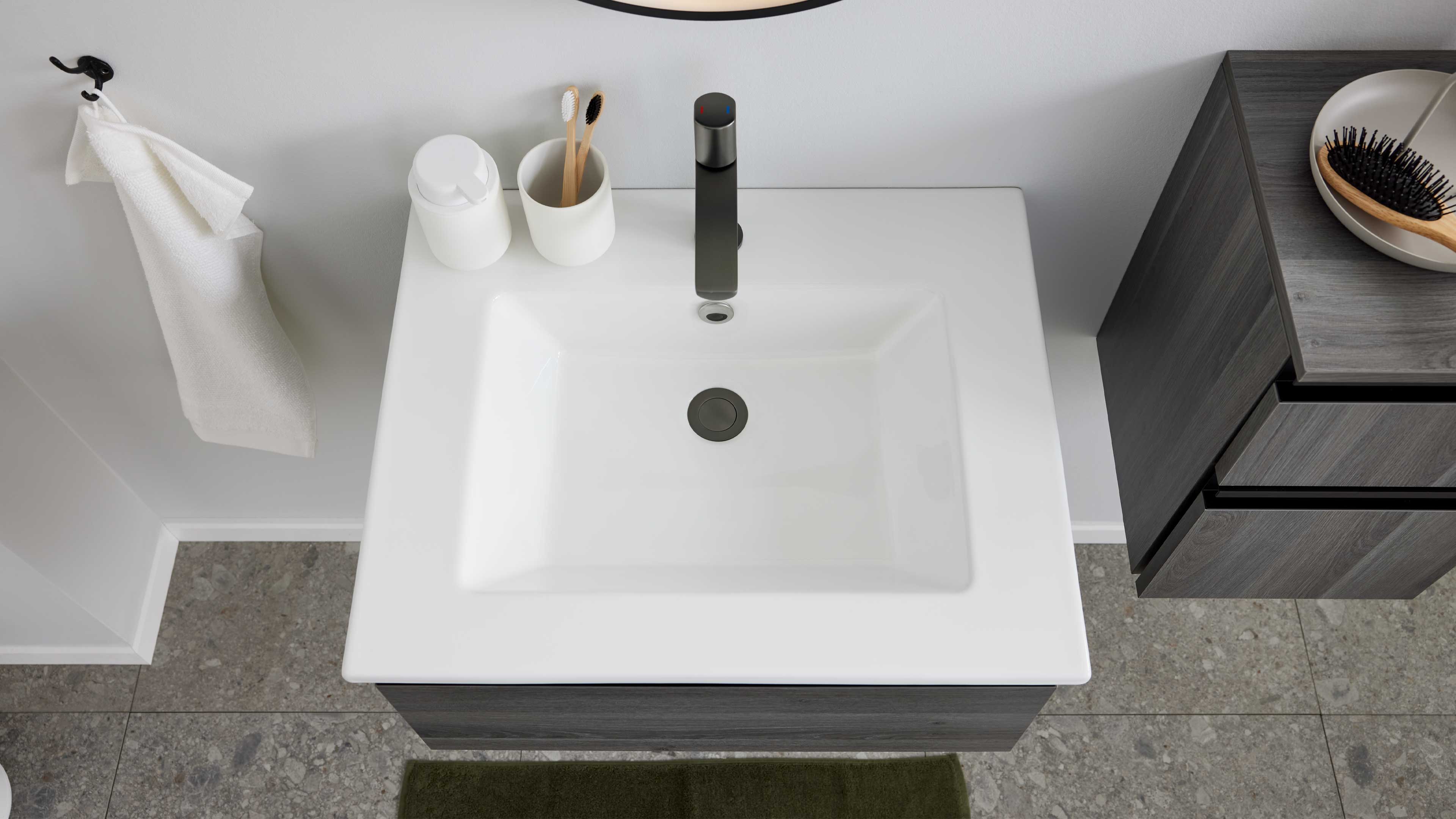 Der Waschtischunterschrank mit einem großzügigen Auszug bietet durchdachten Stauraum für deine Pflegeprodukte. Die hochwertige Metallschublade mit Glasreling ist mit Premium-Dämpfungstechnik ausgestattet, die ein leises, sanftes Schließen ermöglicht. Eine Antirutschmatte sorgt für Ordnung, während der integrierte Siphonausschnitt die Montage erleichtert. Maße: ca. 60 x 38 x 47 cm (B/LxHxT).