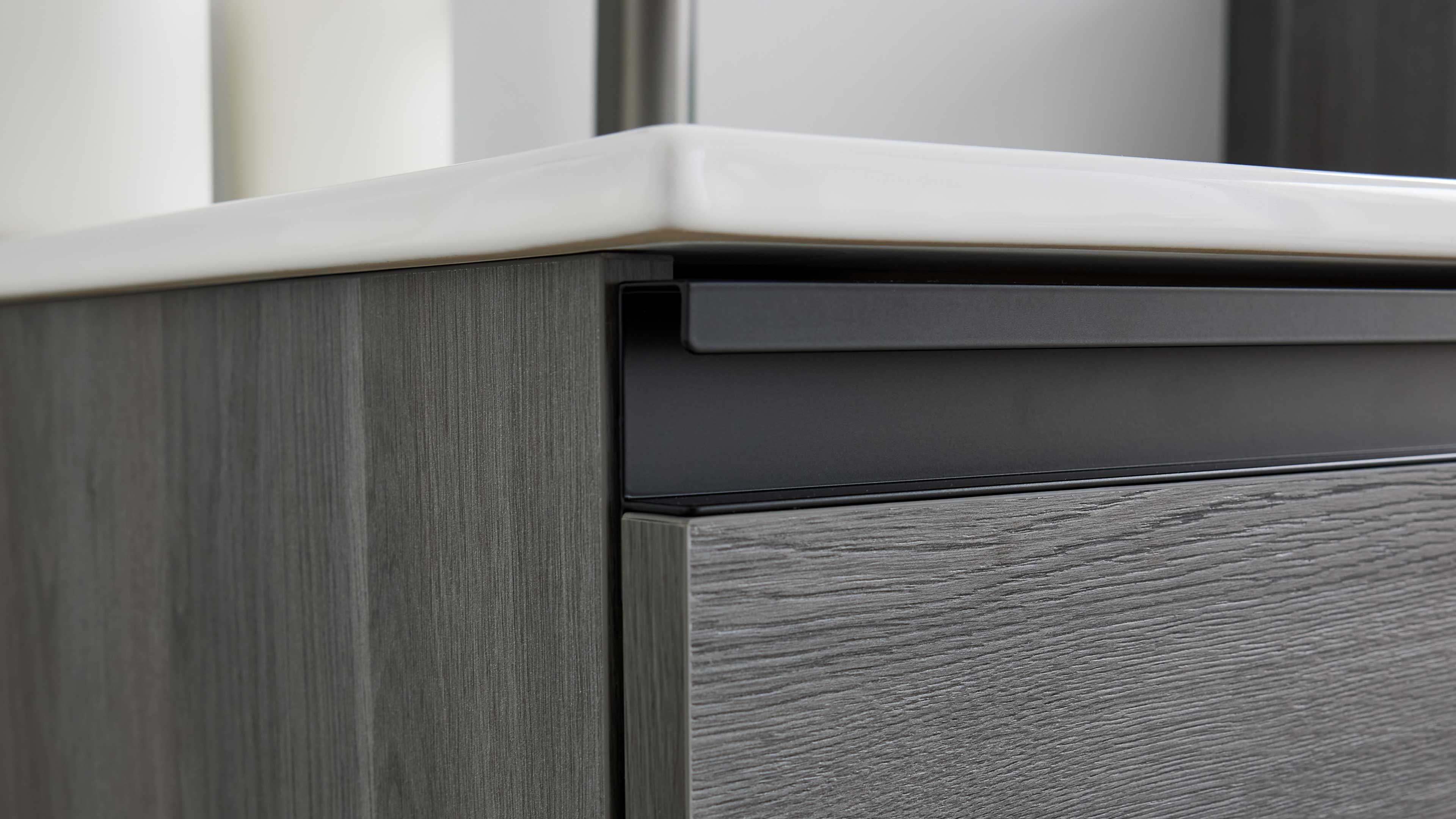 Das dreiteilige Badmöbel-Set (7698) aus der Interliving Bad Serie 3702 vereint modernes Design, hochwertige Materialien und clevere Funktionalität – perfekt für dein stilvolles Badezimmer. In grauer Cuneo Eiche-Nachbildung mit mattschwarzen Griffleisten sorgt das Ensemble für ein elegantes, harmonisches Gesamtbild mit natürlichem Charme.