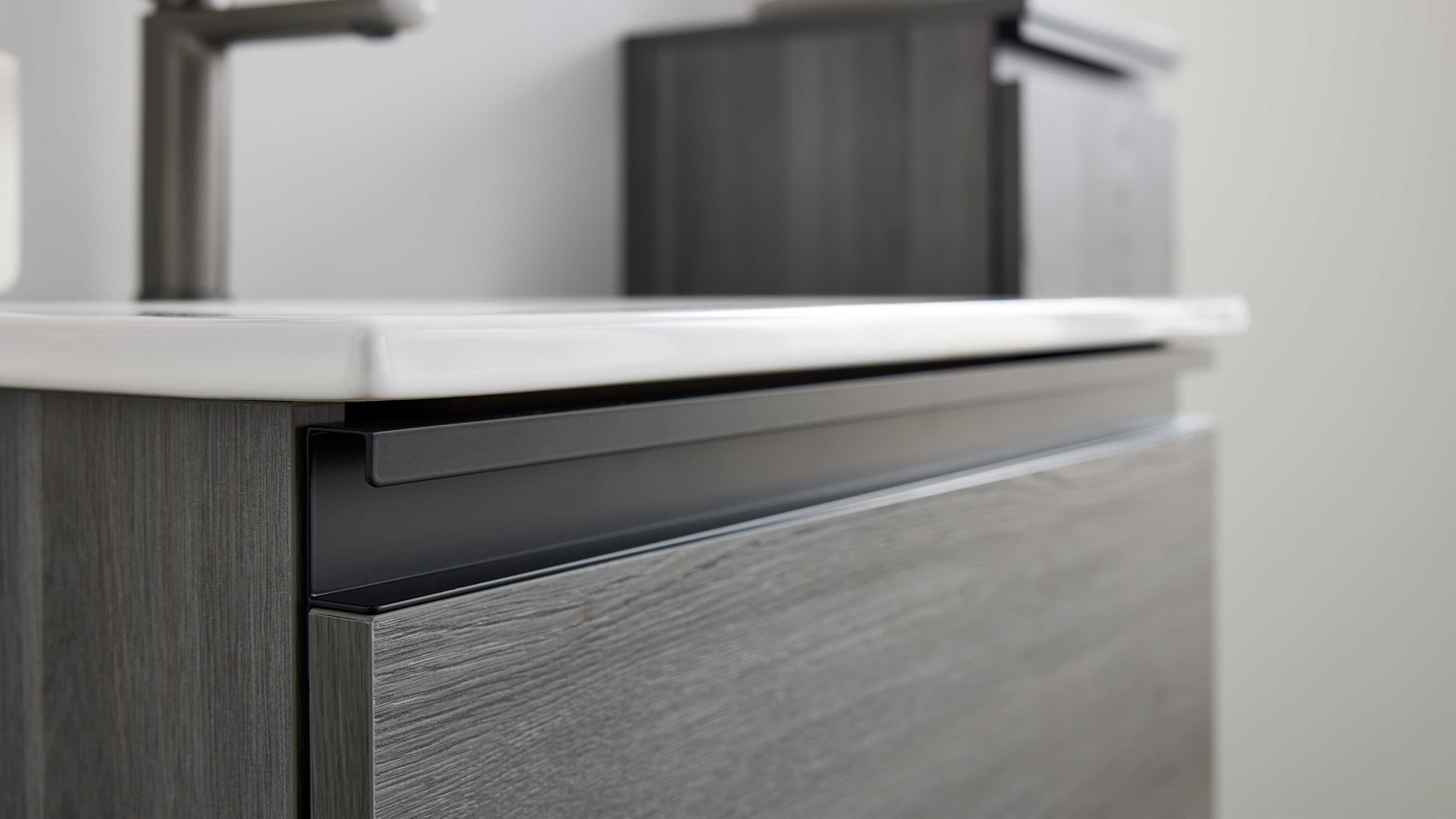 Modernes Badmöbel-Set in grauer Holzoptik und abgerundetem Spiegel