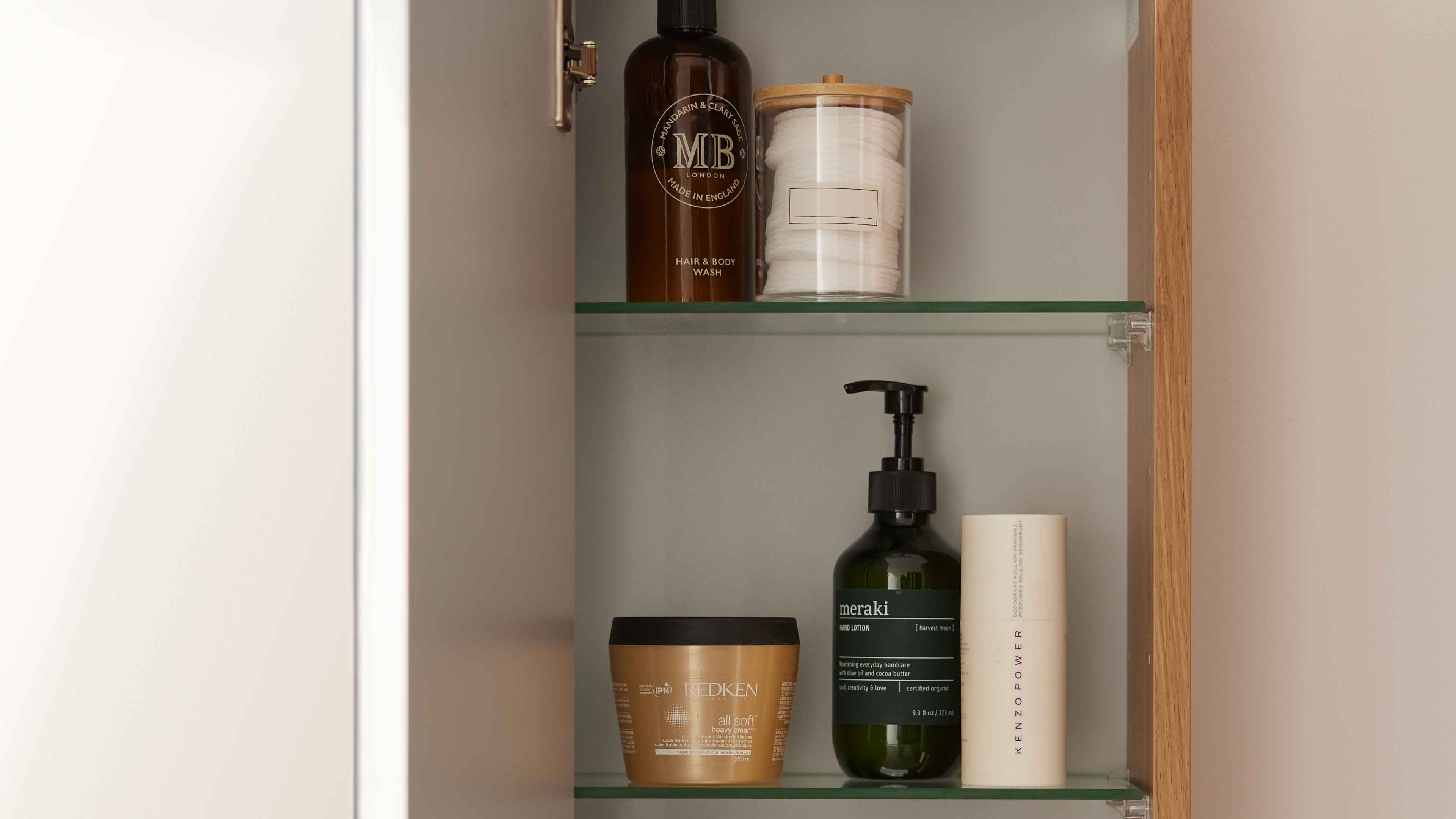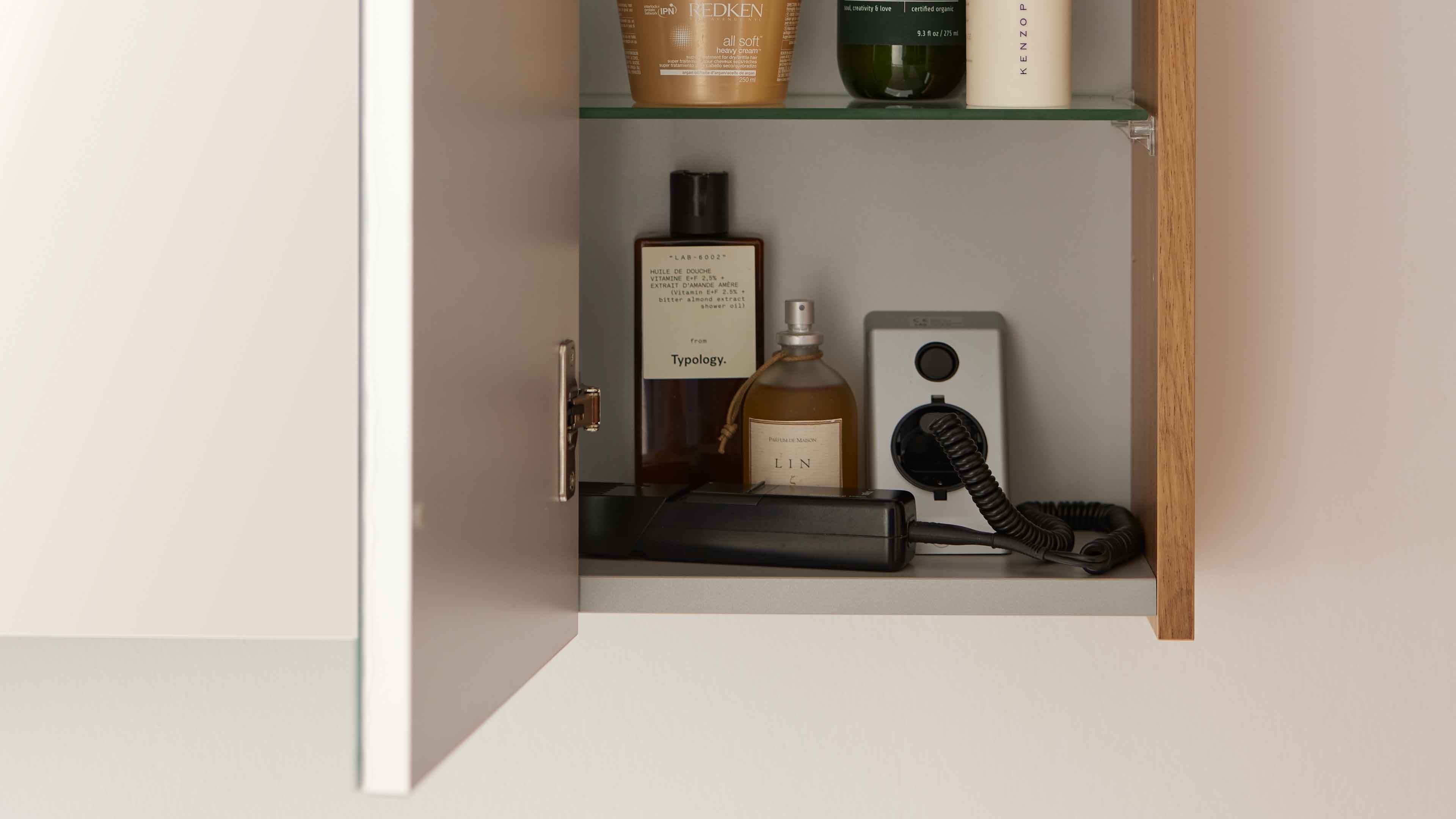 Der Spiegelschrank bietet mit drei Spiegeltüren mit Schließdämpfung, zwei Mittelwänden und sechs höhenverstellbaren Glasfachböden jede Menge Platz für alles, was du täglich brauchst. Das integrierte Schalter-Steckdosenelement inklusive LED-Converter mit 30 Watt ist die optimale Vorbereitung für ergänzende Beleuchtung. Die schwarzen Spiegelschrankgriffe runden das harmonische Gesamtbild ab. Maße: ca. 100 x 64 x 15 cm (B/LxHxT).