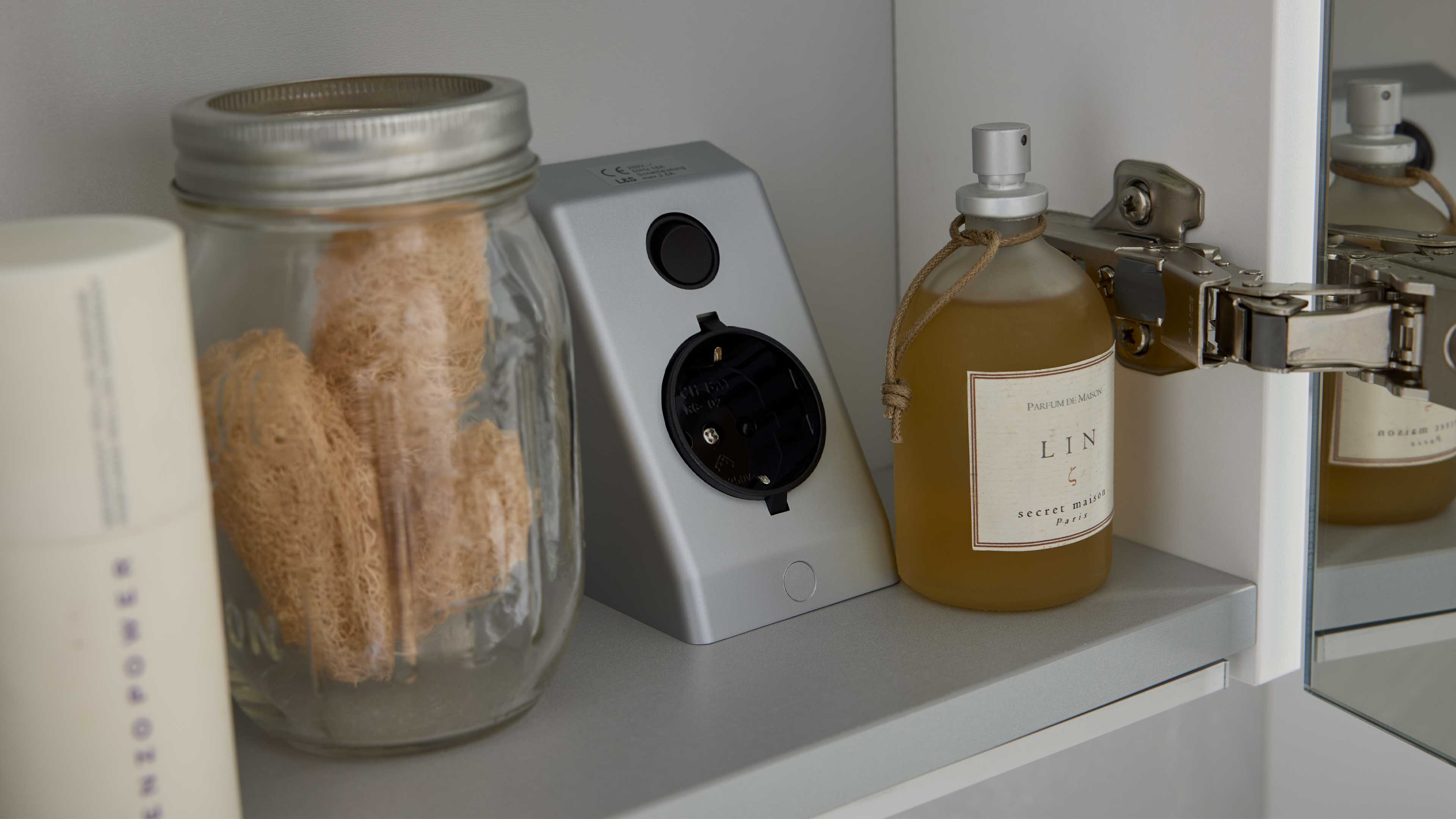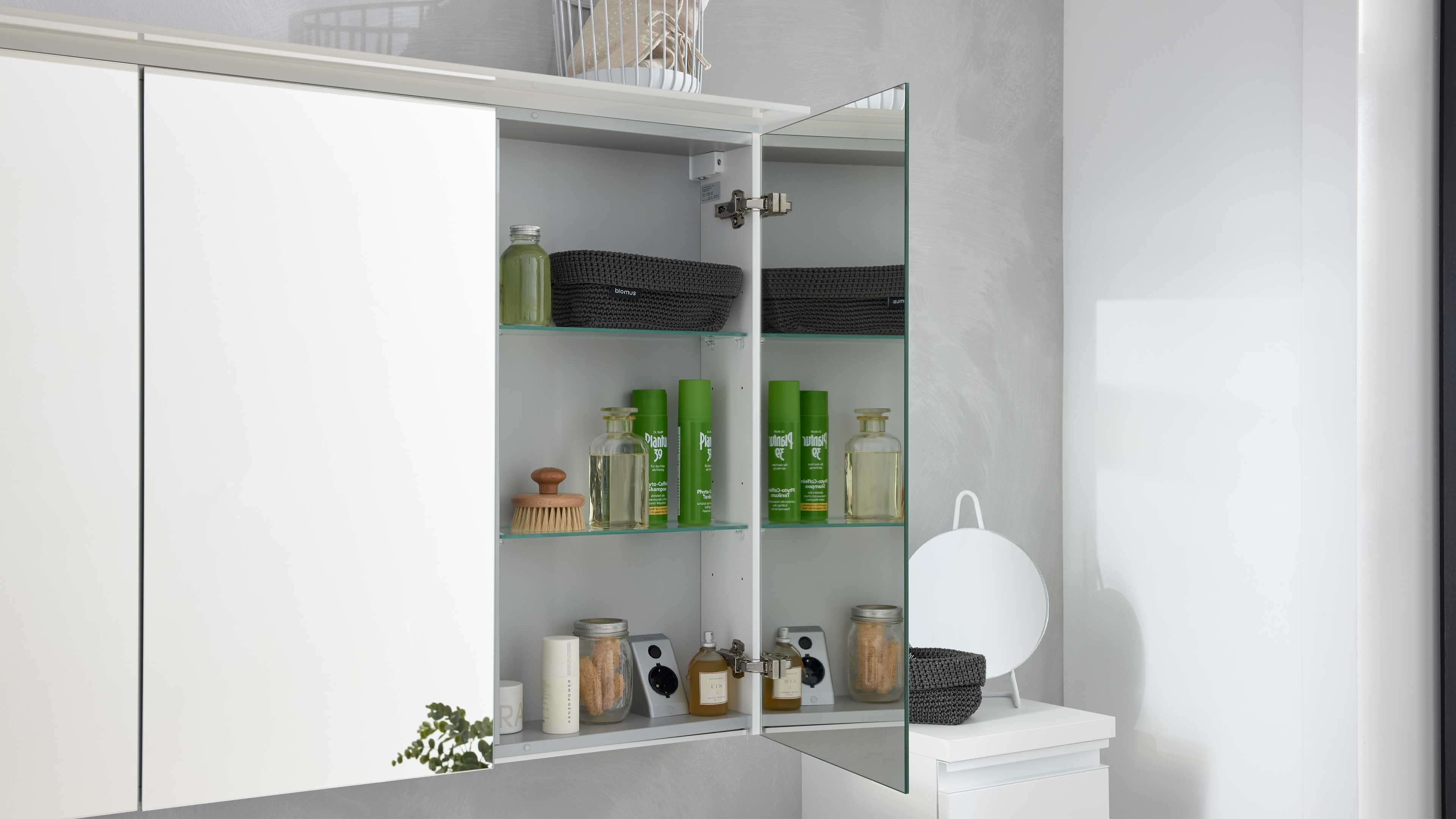 Der dreitürige Spiegelschrank rundet das Set perfekt ab. Drei doppelseitig verspiegelte Holztüren und sechs höhenverstellbare Glasböden sorgen für Ordnung und Flexibilität. Das integrierte Steckdosen-Schalterelement auf der linken Seite ist ideal für Rasierer, Föhn oder elektrische Zahnbürsten. Ein 30-Watt-LED-Converter ist bereits enthalten und lässt sich mit einer passenden LED-Flächenleuchte kombinieren.