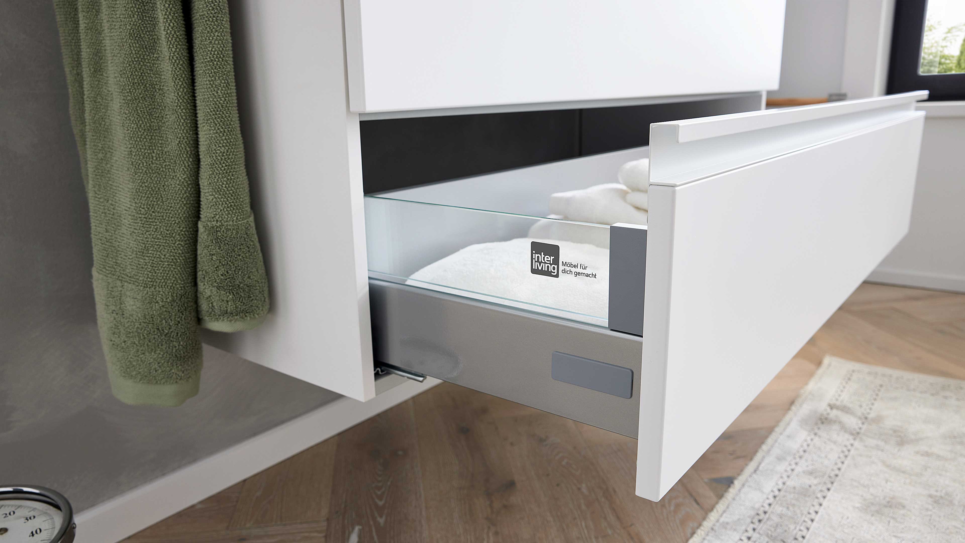 Wie alle Möbel der Interliving Bad Serie 3702 ist auch dieses Set individuell planbar. Im Möbelhaus kannst du es mit passenden Schränken, Innenausstattungen oder Armaturen erweitern – für eine Badezimmergestaltung, die perfekt auf deine Bedürfnisse abgestimmt ist.