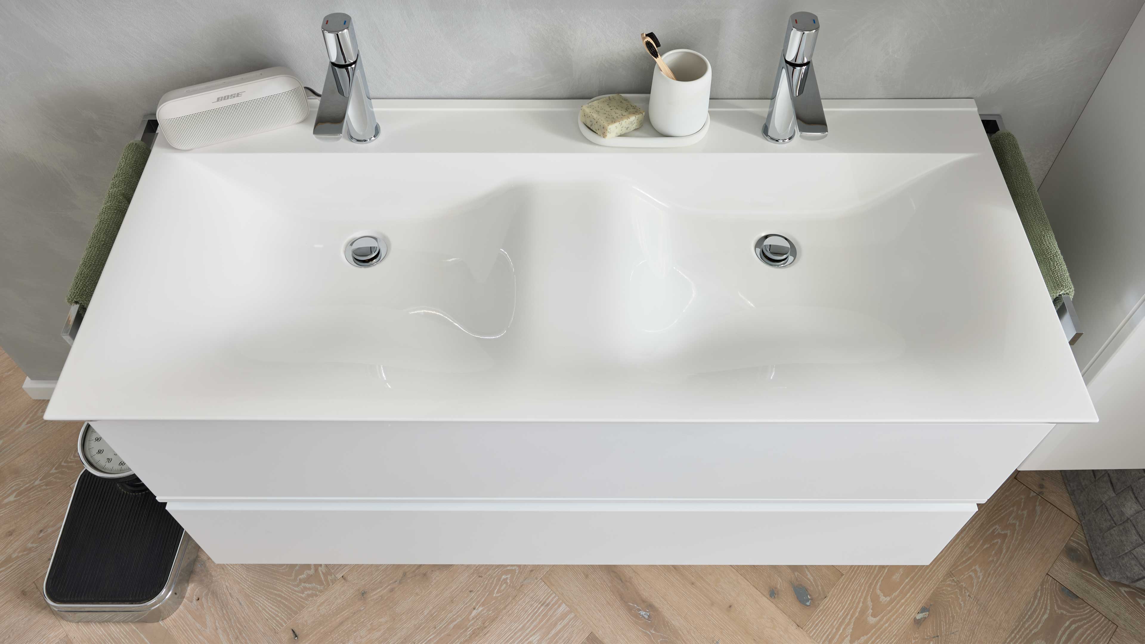 Der dazugehörige Doppelwaschtisch aus weißem evermite® überzeugt durch seine kratzunempfindliche, verfärbungsresistente und besonders pflegeleichte Oberfläche. Mit zwei Hahnlochbohrungen und einem verchromten CLOU Ab- und Überlaufsystem bietet er höchsten Komfort und elegantes Design in einem. Armaturen lassen sich individuell ergänzen – ganz nach deinem Geschmack.