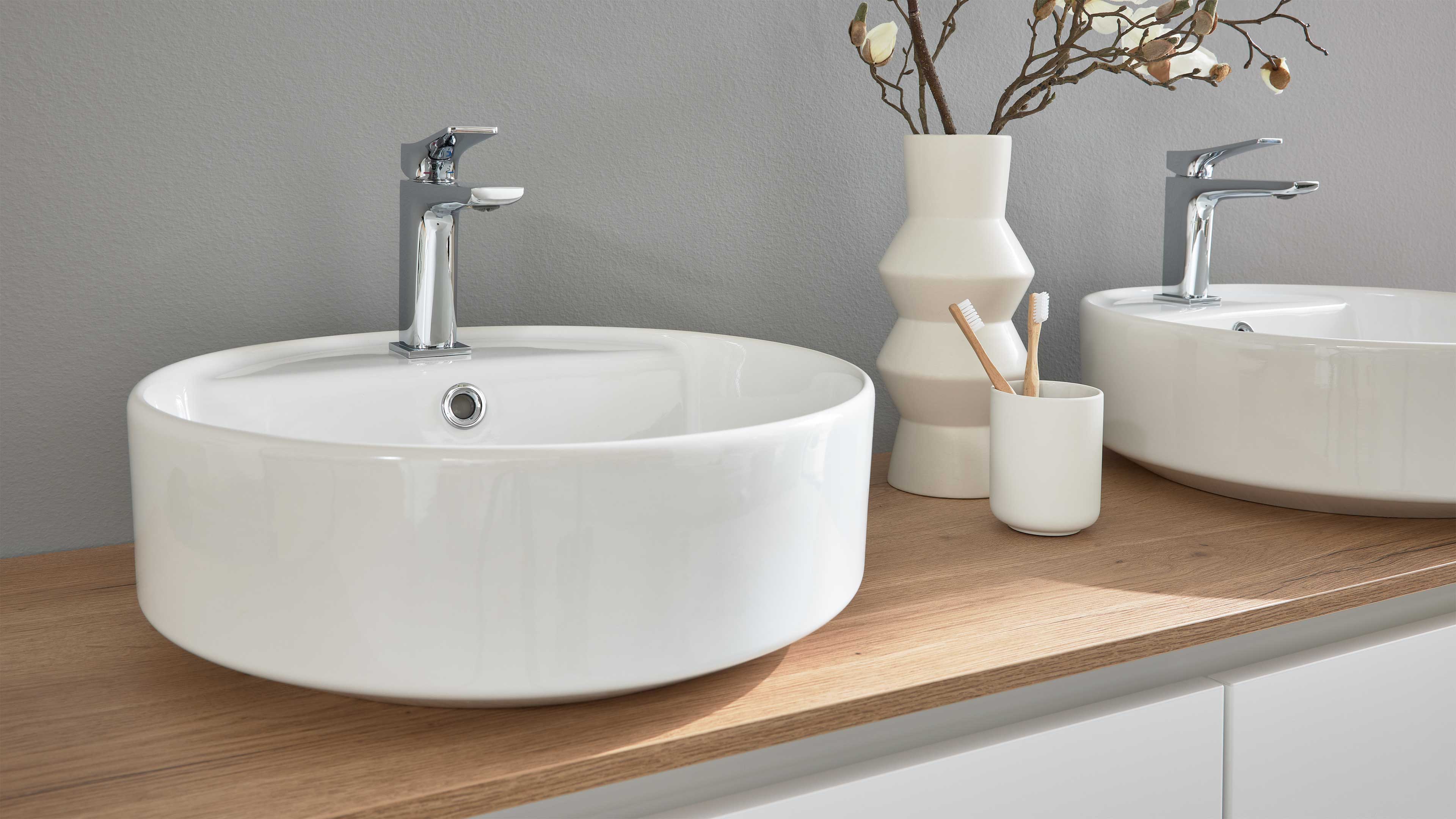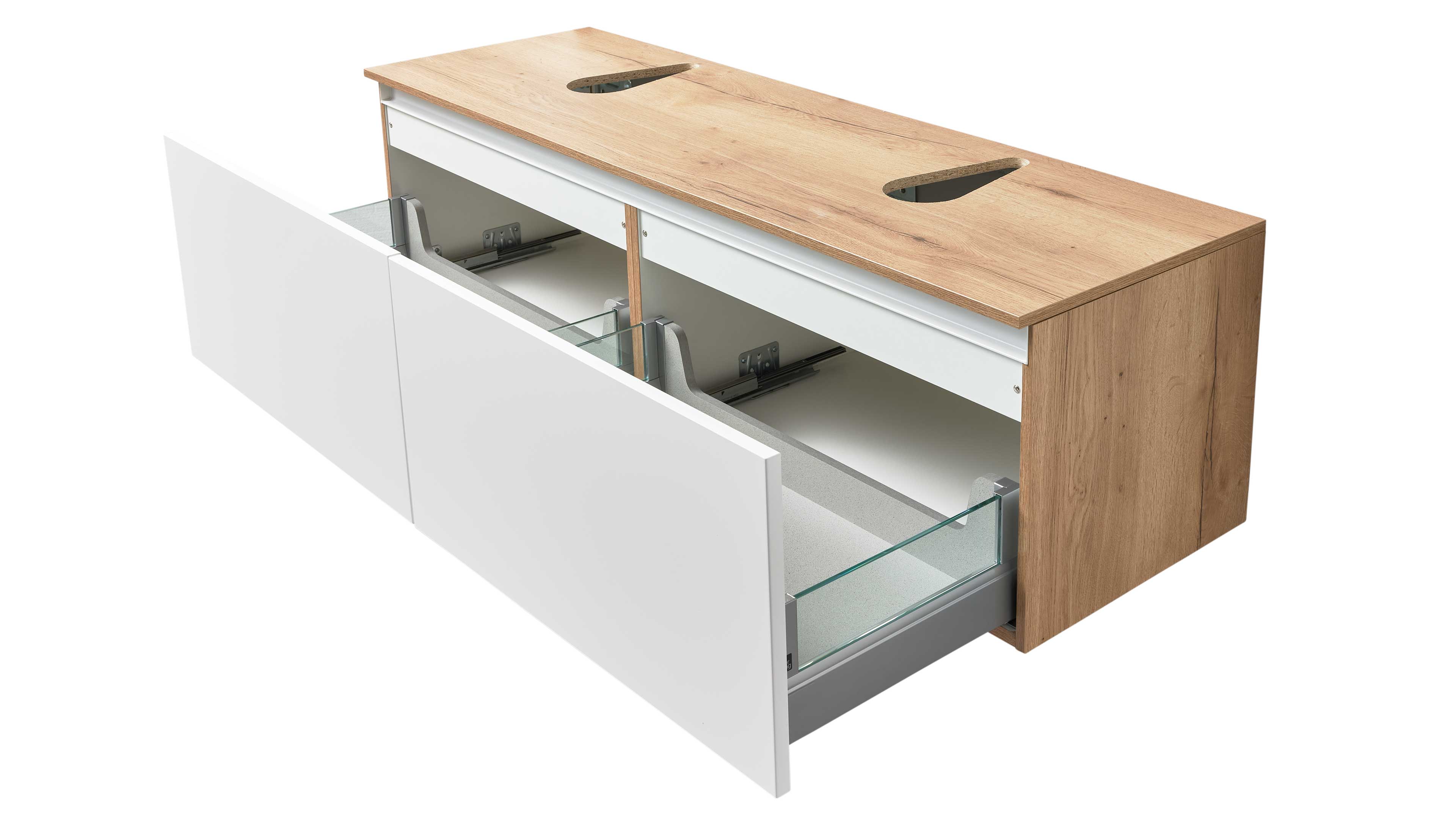 Zum Set gehören zwei Waschtischschränke (Typ 67447, je ca. 80 x 43 x 46 cm, B/LxHxT), ausgestattet mit je einer Innenblende, einem Auszug und einer Holzrückwand. Beide Auszüge verfügen über Soft-Close und Selbsteinzug für komfortables Handling. Glas-Seitenwände sind gegen Mehrpreis erhältlich. Ergänzt werden die Schränke durch zwei runde Aufsatzwaschbecken (Typ 87732) aus weißer Keramik mit Hahnlochbohrung und Überlauf (Ø ca. 45 cm, Höhe ca. 15 cm). Ein holzfarbener Abdeckboden (Typ 16849) mit Ausschnitten für die Waschbecken (ca. 160 x 1,6 x 49 cm, B/LxHxT) ist im Set enthalten und rundet das Gesamtbild ab.