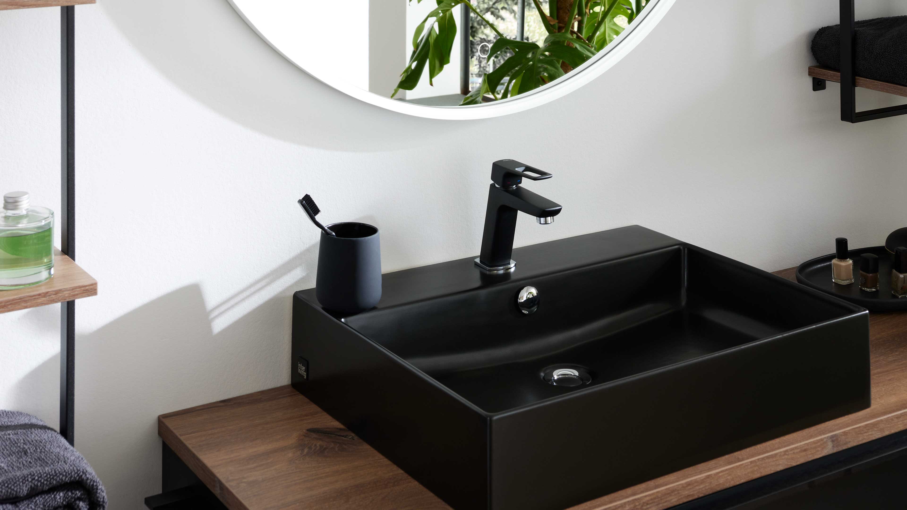 Schwarzer Waschtisch mit Kontrasten in Holz und Metall