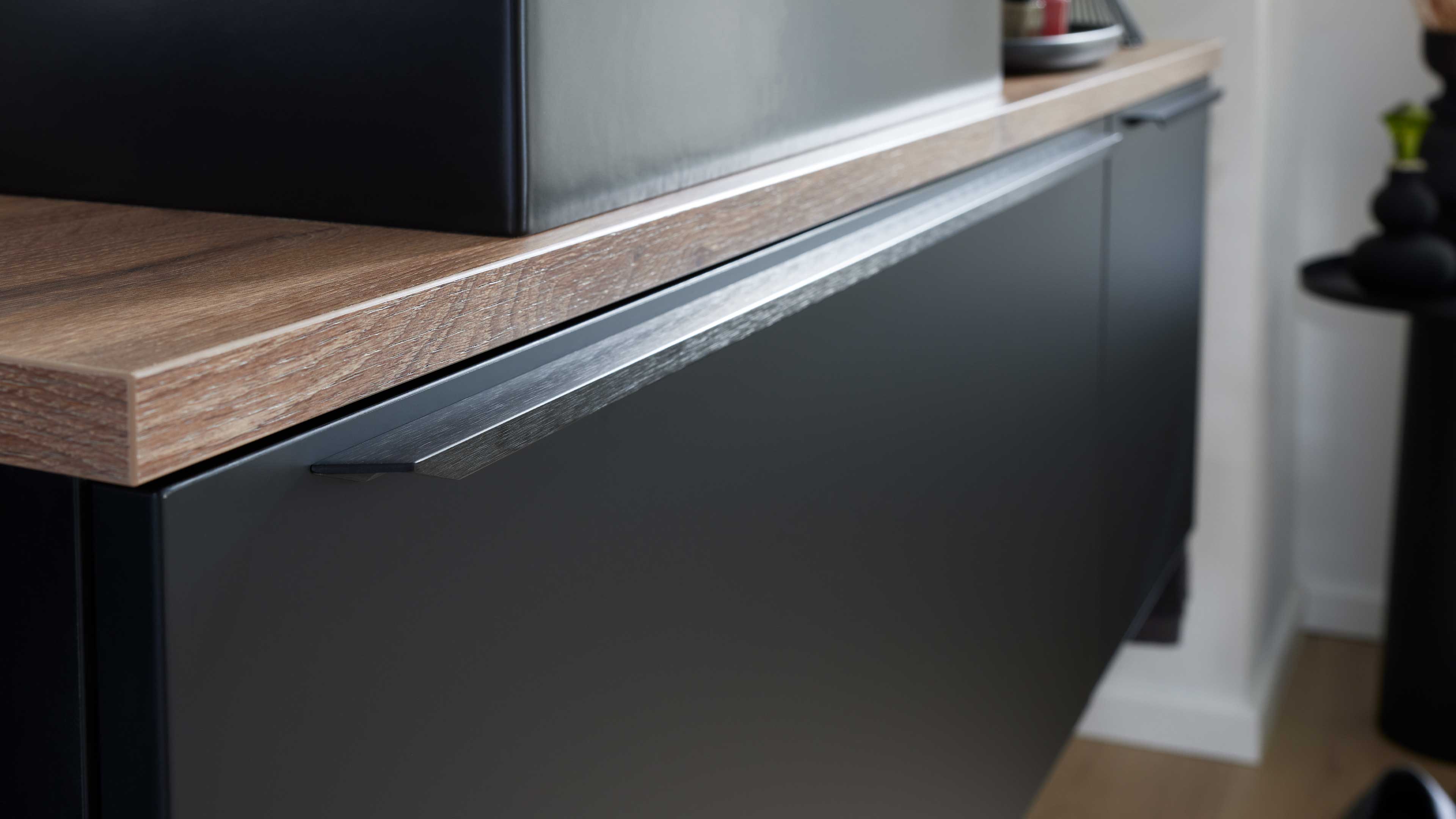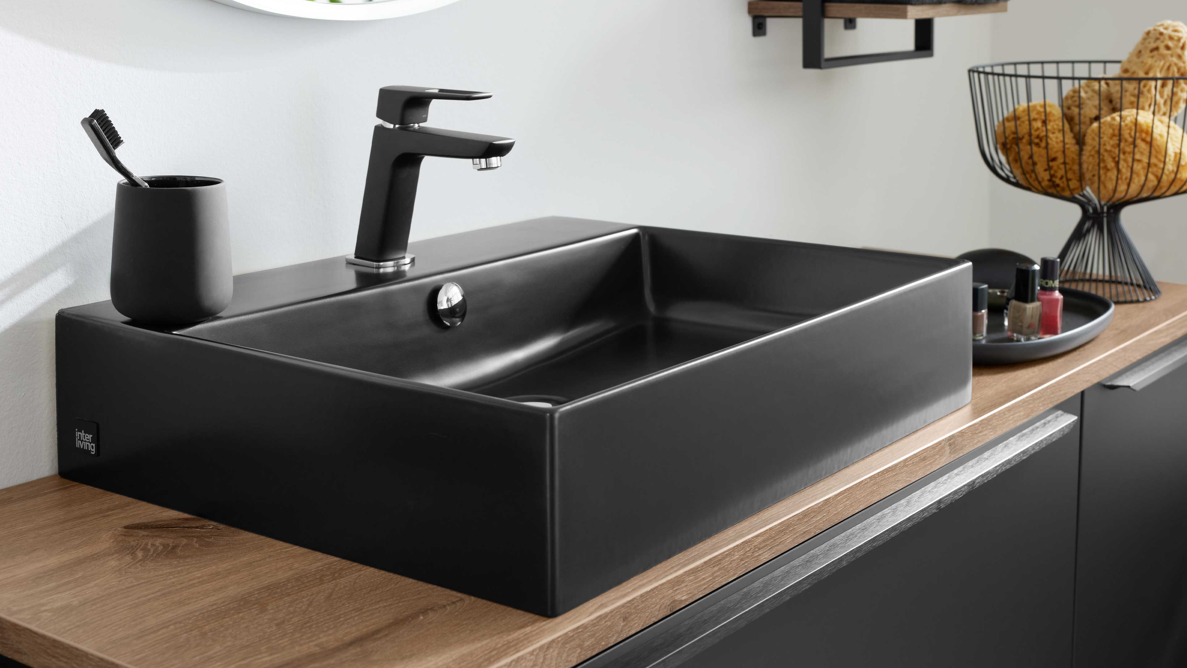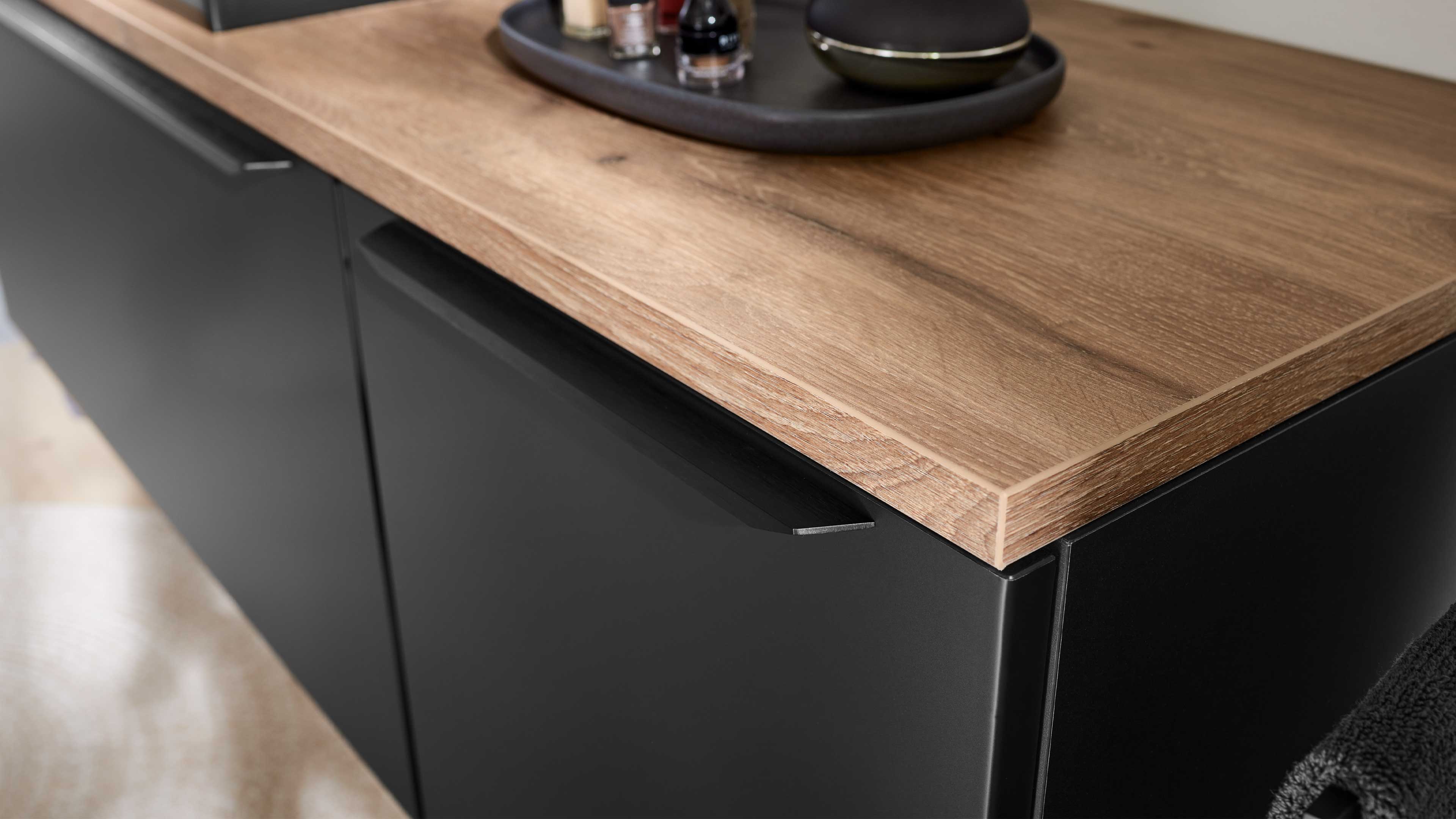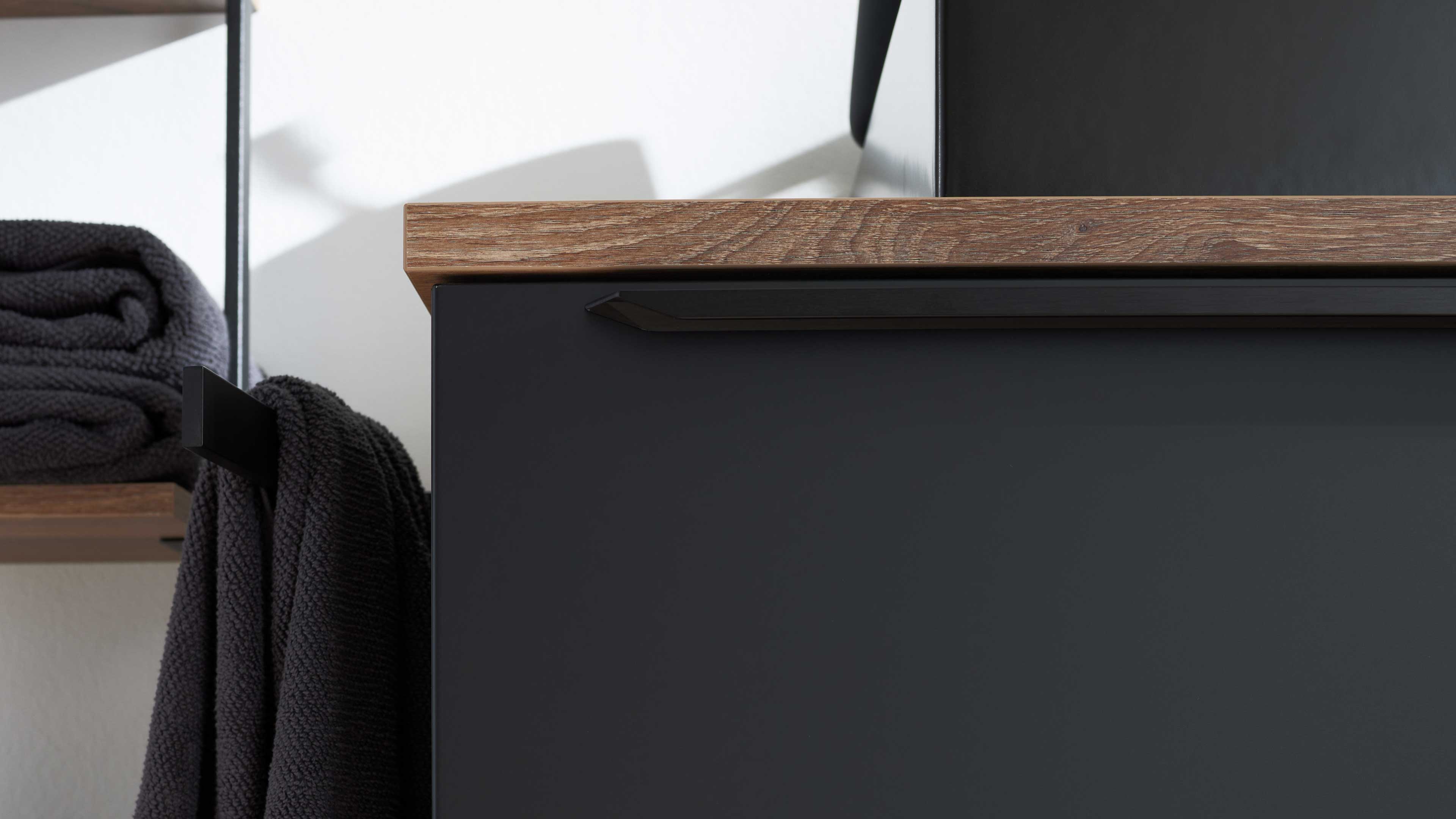 Die Interliving Bad Serie 7340 begeistert mit einem modernen, urbanen Look und durchdachten Funktionen. Die supermatte schwarze Lacklaminatfront mit schwarzem Relinggriff (Typ 7945) trifft auf einen mattschwarzen Korpus und eine elegante Vikings Oak Nachbildung – ein markanter Materialmix, der deinem Badezimmer Charakter und Tiefe verleiht.