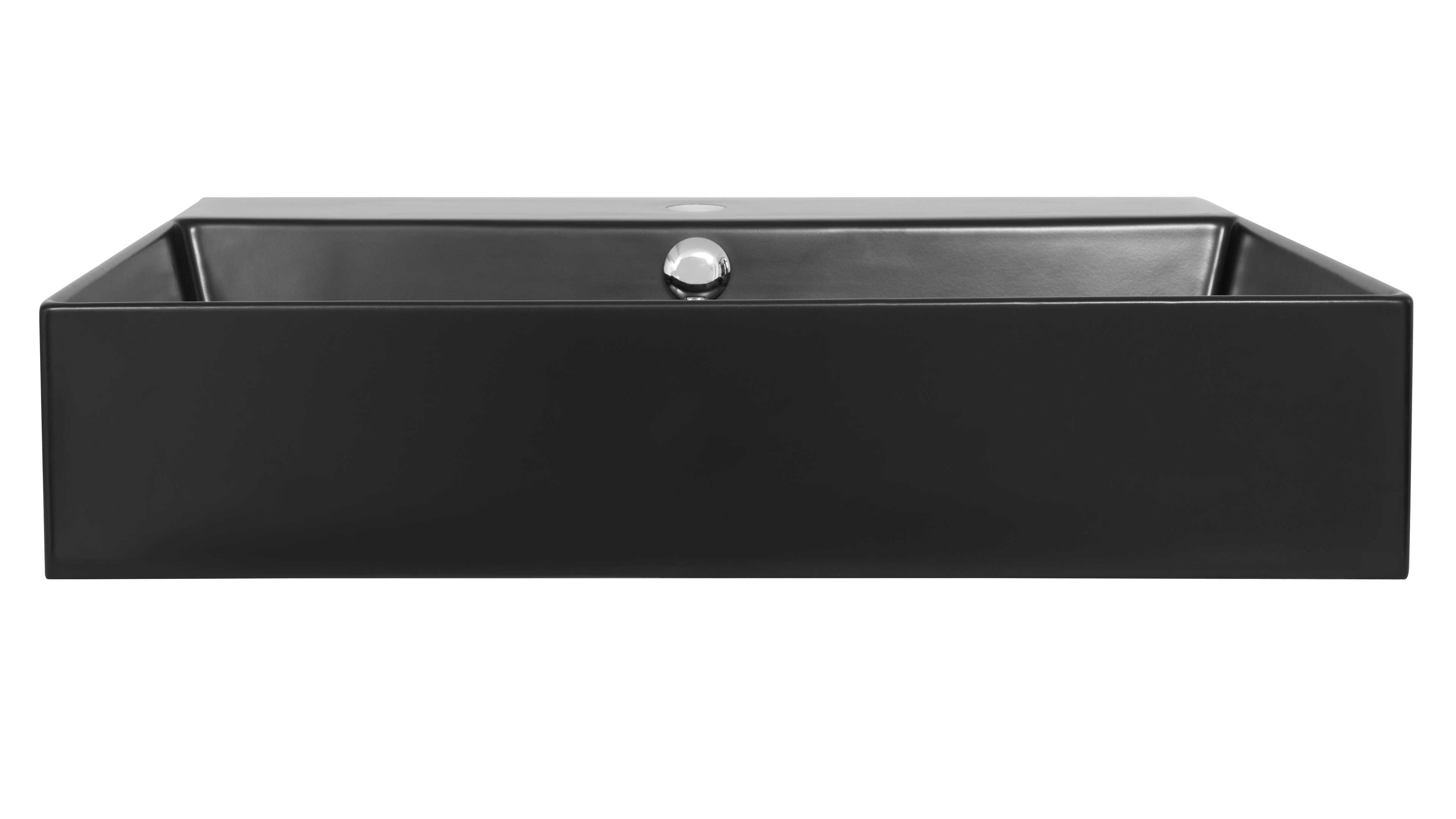 Dazu passt der mattschwarze Keramik-Aufsatzwaschtisch (Typ 87756), der durch seine edle, pflegeleichte Oberfläche und klare Formensprache besticht. Er ist mit einer Hahnlochbohrung und einem Überlauf ausgestattet und misst ca. 60 x 12 x 46 cm (B/LxHxT).