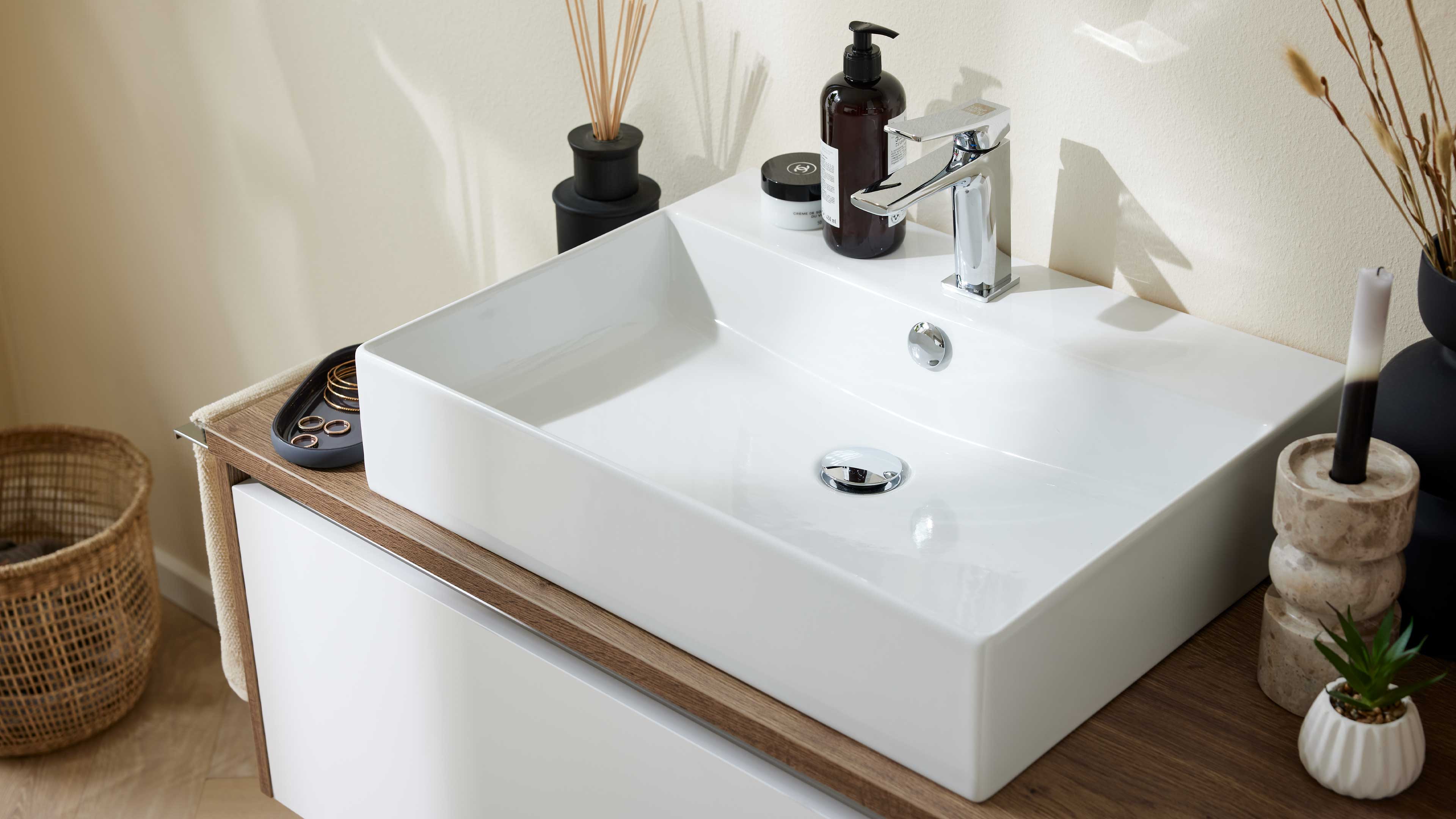 Der Aufsatz-Waschtisch (Typ 87755) aus hochglänzender, weißer Keramik überzeugt durch klare Linien und hochwertige Verarbeitung. Mit Maßen von ca. 60 x 12 x 46 cm (B/LxHxT) und einer Hahnlochbohrung passt er ideal auf die Waschtischplatte. Die verchromte Hochdruck-Mischbatterie (Typ 17707) mit Pop-up-Ventil, Anschlüssen für Warm- und Kaltwasser, 27 mm Luftsprudler und flexiblen Anschlussschläuchen ergänzt das Set perfekt – kompakt in ca. 11 x 16 cm (B/LxH).
