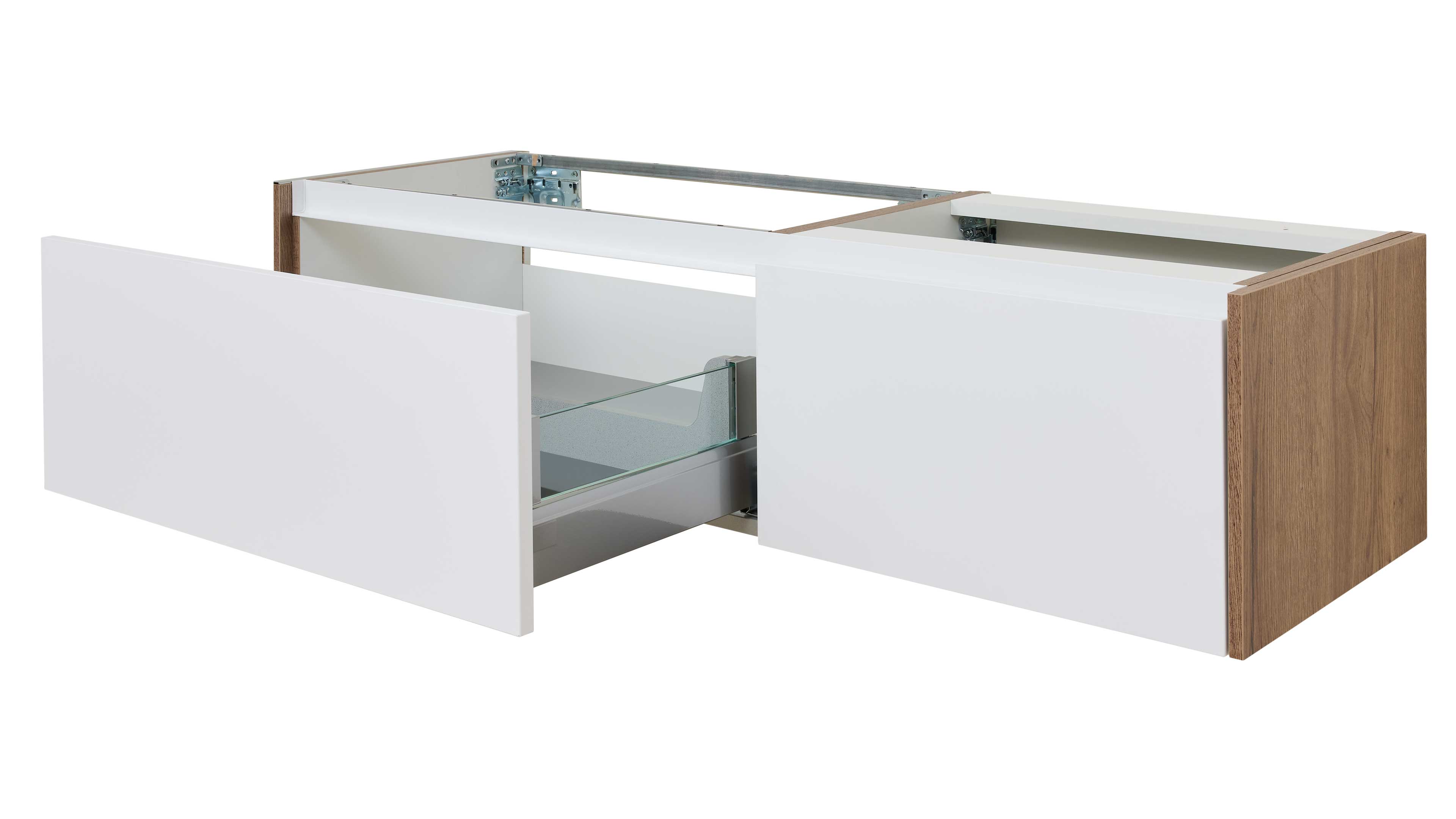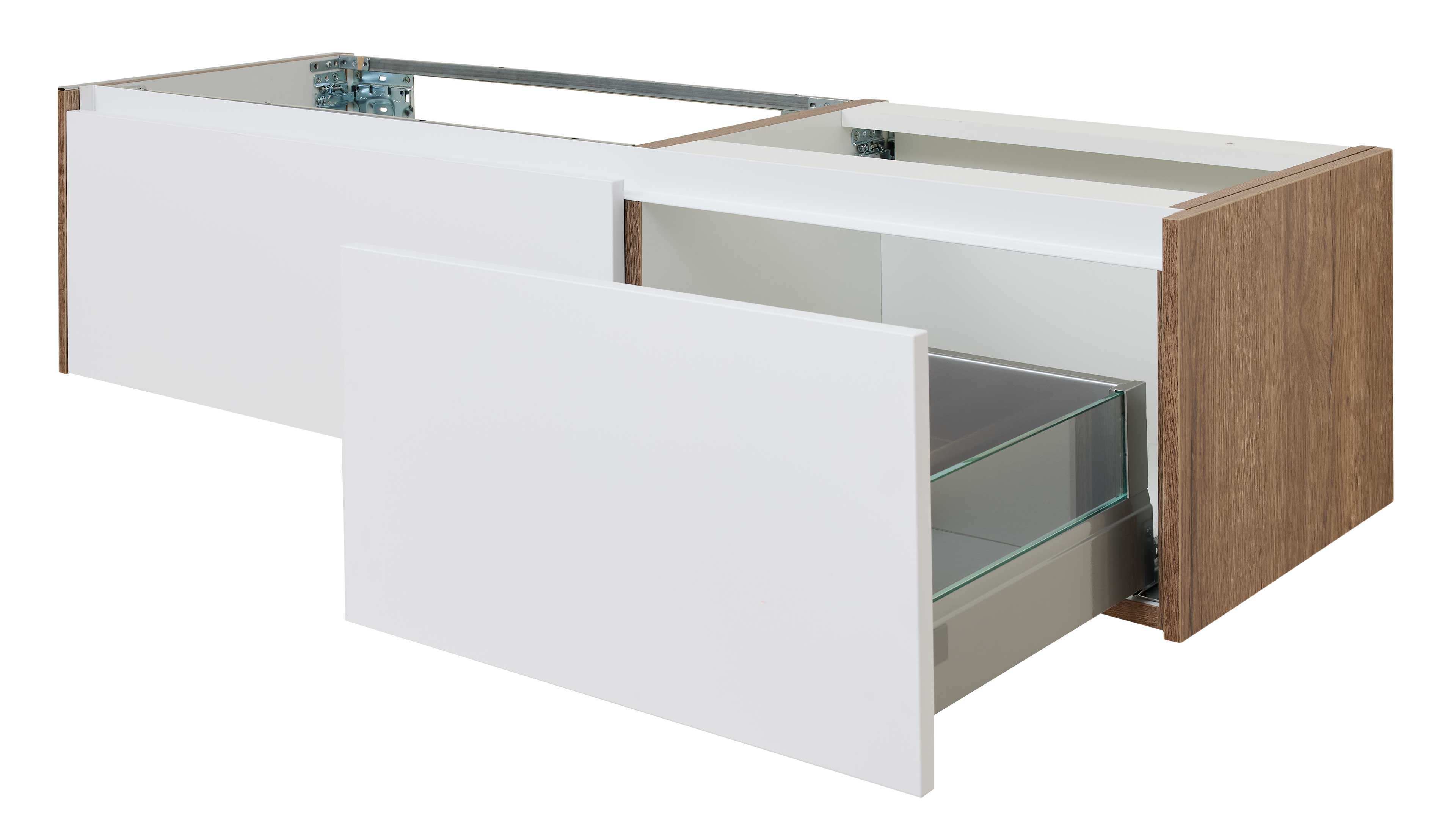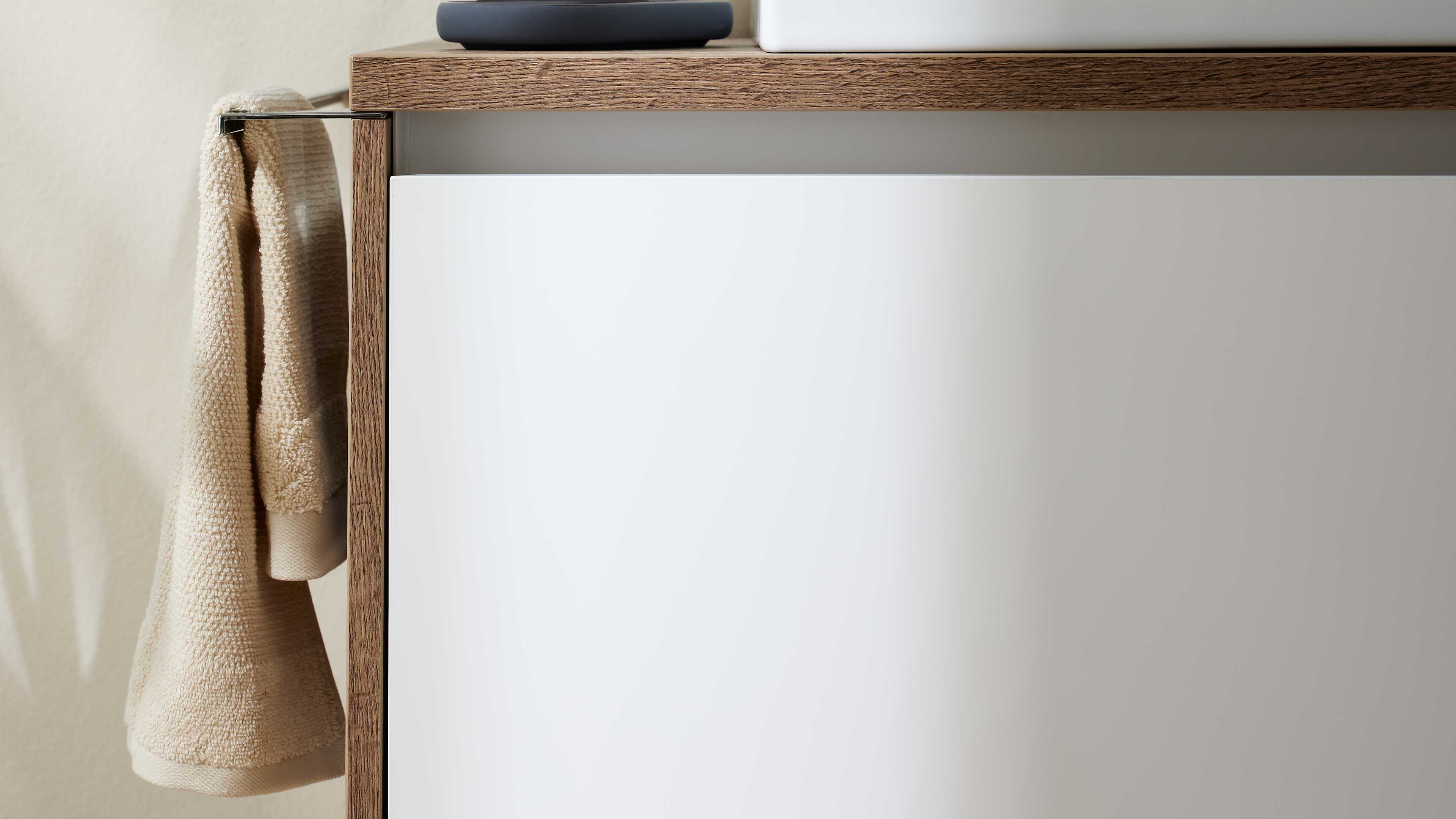 Der Auszugschrank (Typ 67355) bietet zusätzlichen Stauraum bei kompakten Maßen von ca. 60 x 36 x 46 cm (B/LxHxT). Er ist inklusive Abschlusswange (Typ 16786) ausgestattet, Glas-Seitenverblendungen sind optional erhältlich. Die Waschtischplatte (Typ 16849) mit passendem Waschtischausschnitt (Typ 9352) rundet das Möbelensemble ab.