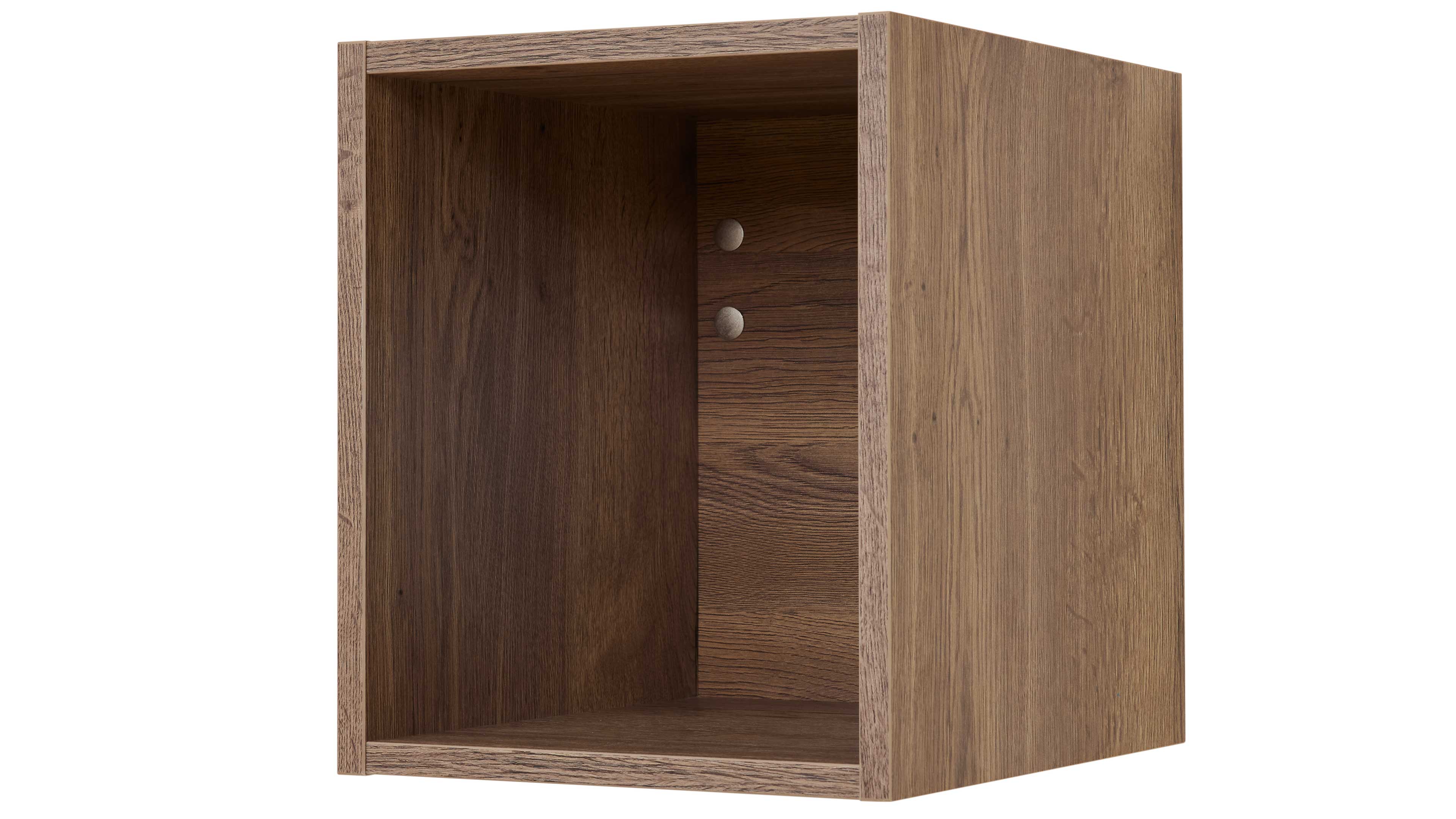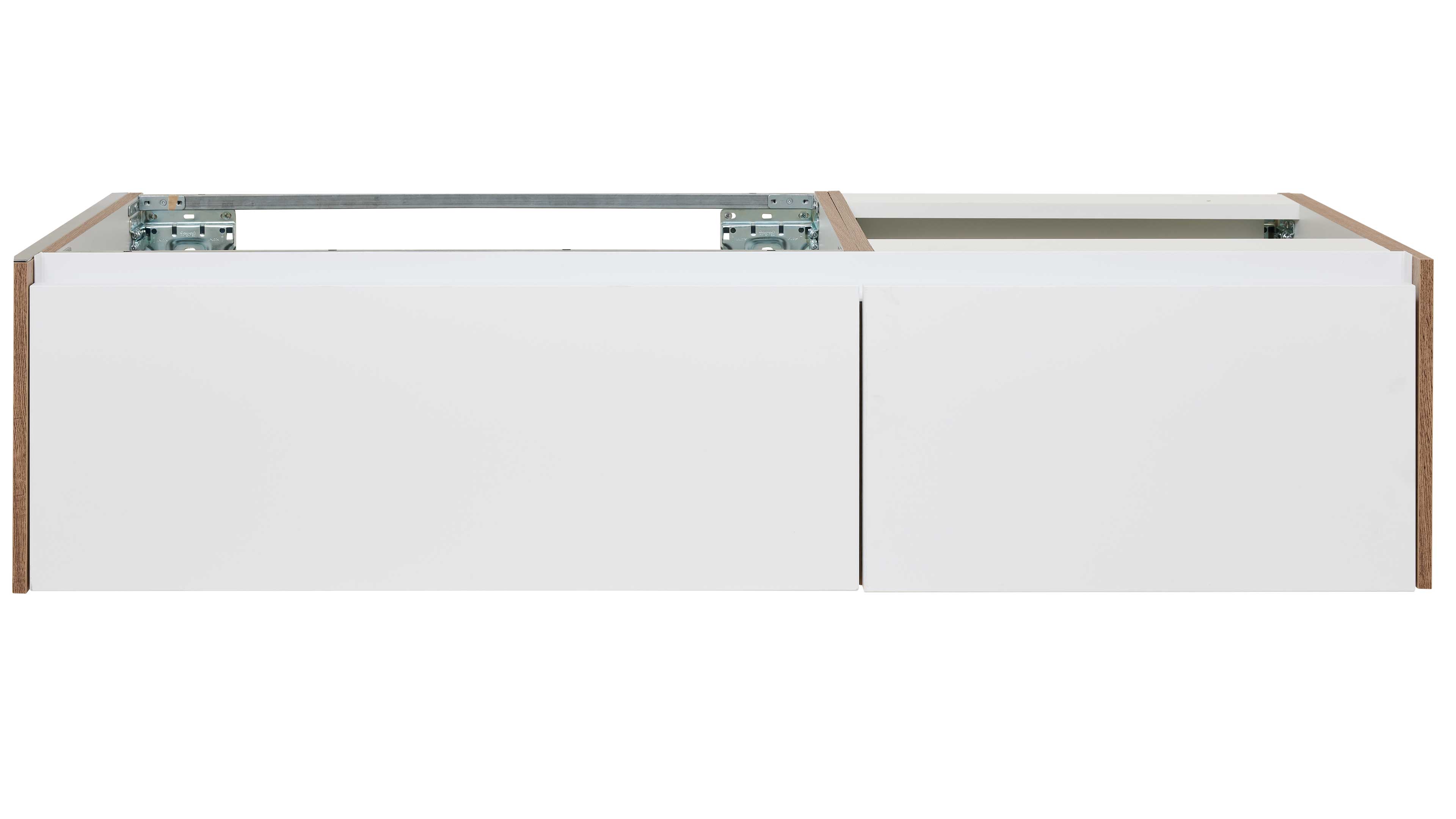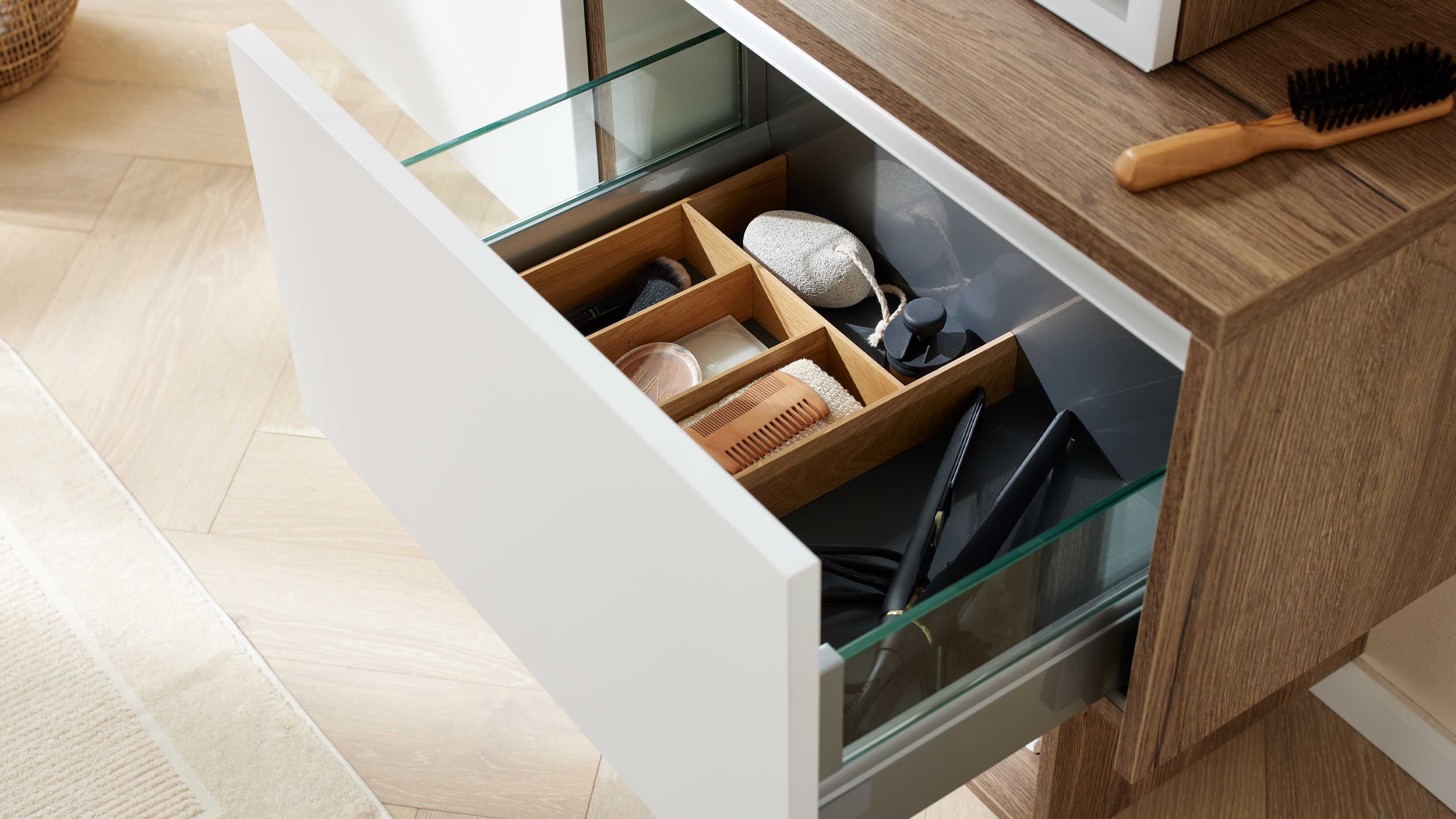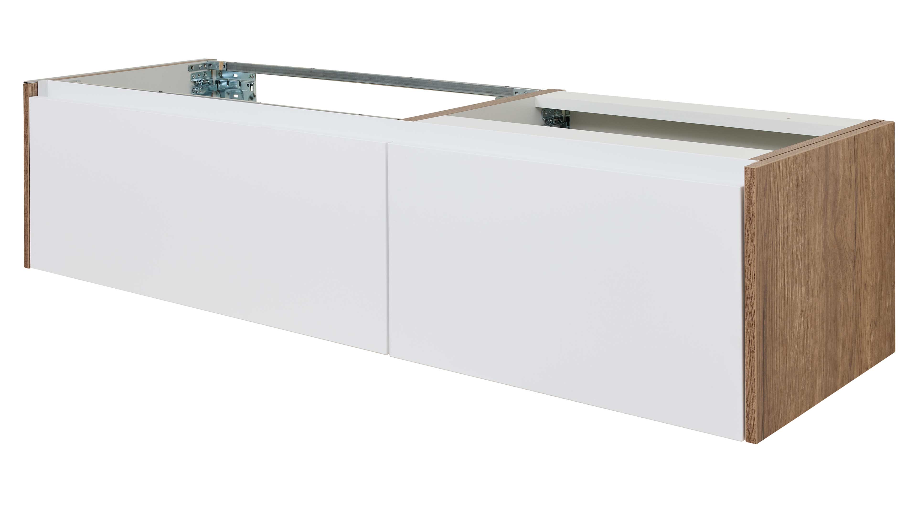 Der Auszugschrank (Typ 67355) bietet zusätzlichen Stauraum bei kompakten Maßen von ca. 60 x 36 x 46 cm (B/LxHxT). Er ist inklusive Abschlusswange (Typ 16786) ausgestattet, Glas-Seitenverblendungen sind optional erhältlich. Die Waschtischplatte (Typ 16849) mit passendem Waschtischausschnitt (Typ 9352) rundet das Möbelensemble ab.