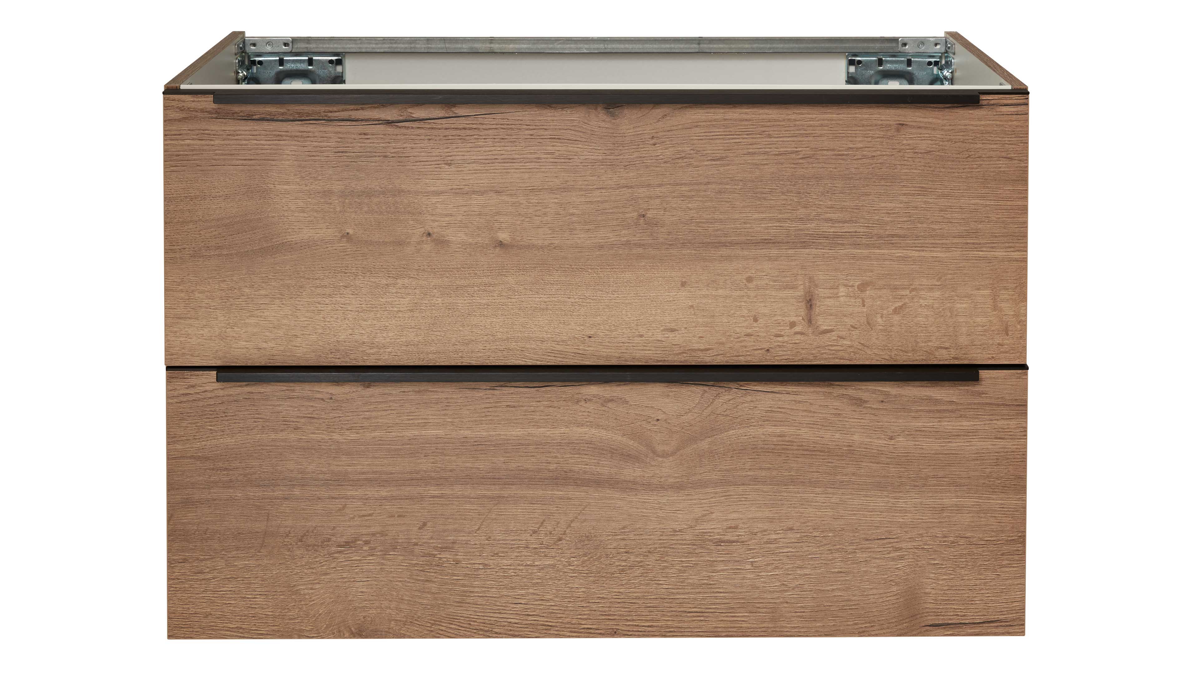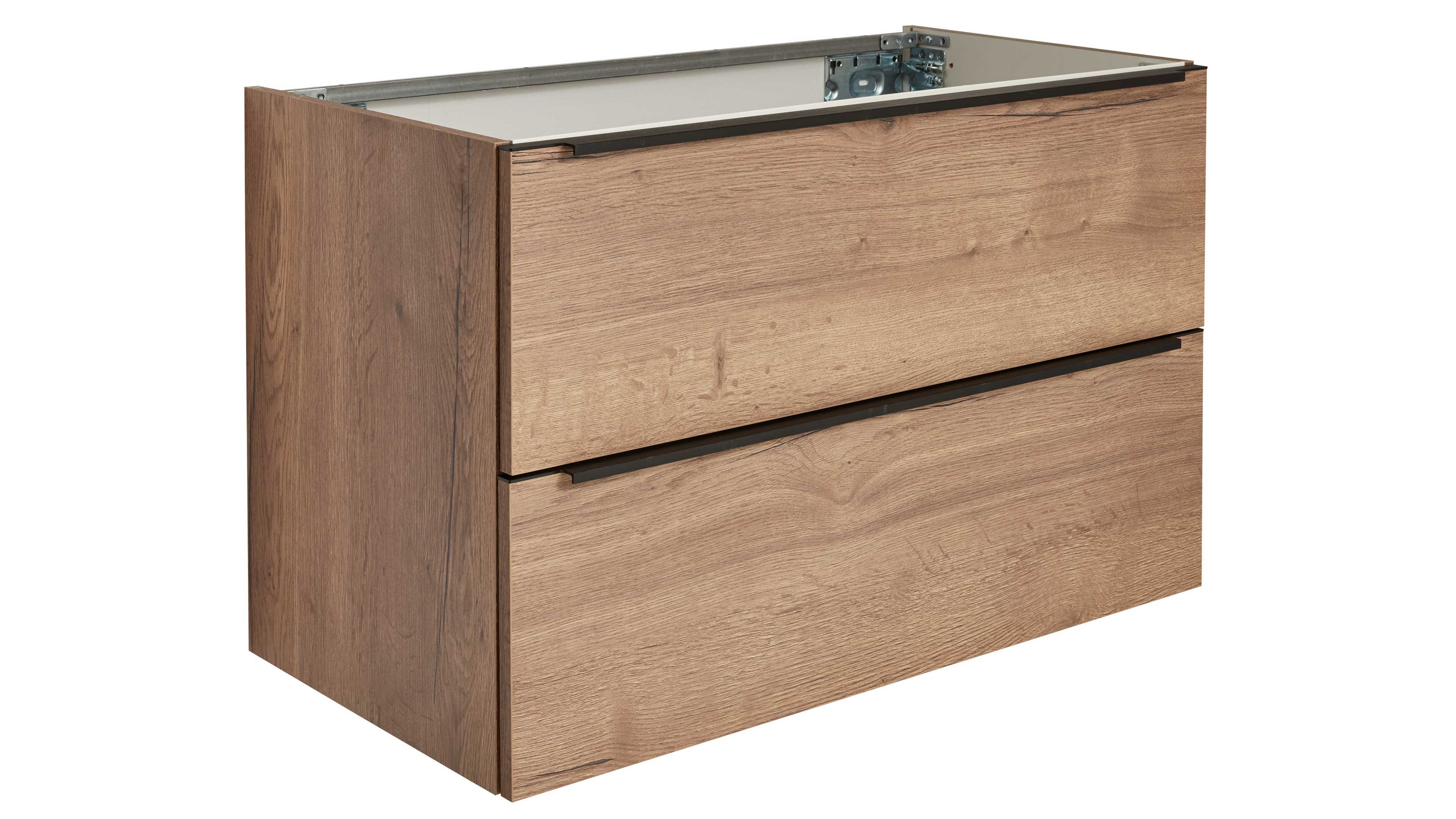 Die Korpusse und Fronten des Unterschranks (Typ 2837) sind in Havanna Eiche-Nachbildung gefertigt, mit umlaufenden eichefarbenen Kanten und mattschwarzen Griffleisten. Im Inneren sorgt die damastweiße Ausführung für eine helle, freundliche Optik. Der Siphon Ausschnitt (Typ 9381) für das Waschbecken ist bereits enthalten. Das weiße Keramik-Waschbecken (Typ 87737) bildet dazu einen modernen Kontrast und setzt klare Akzente.