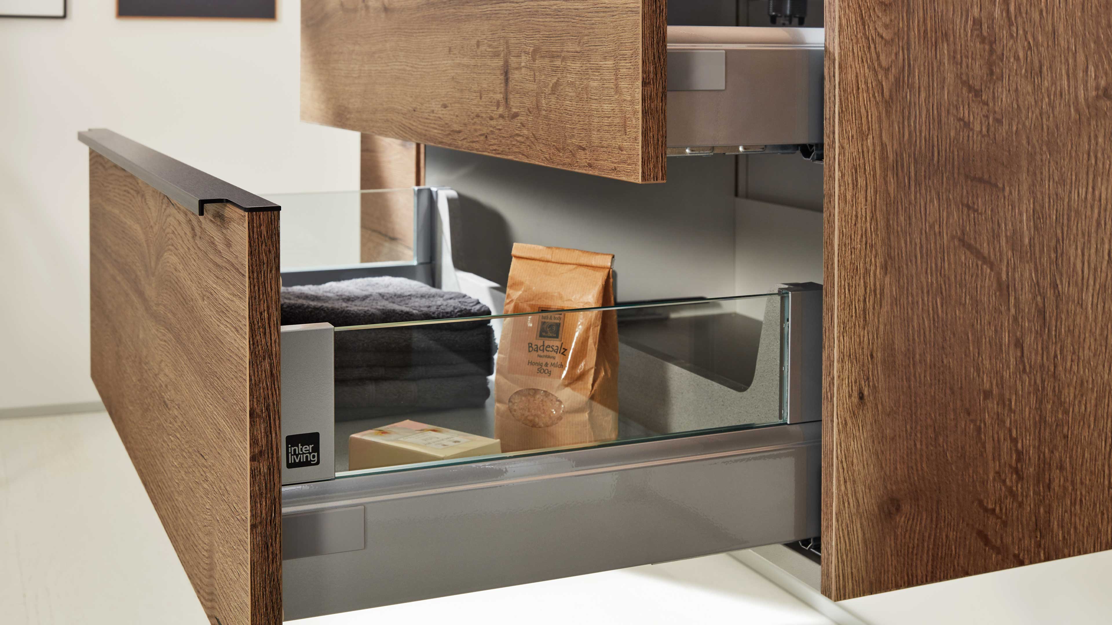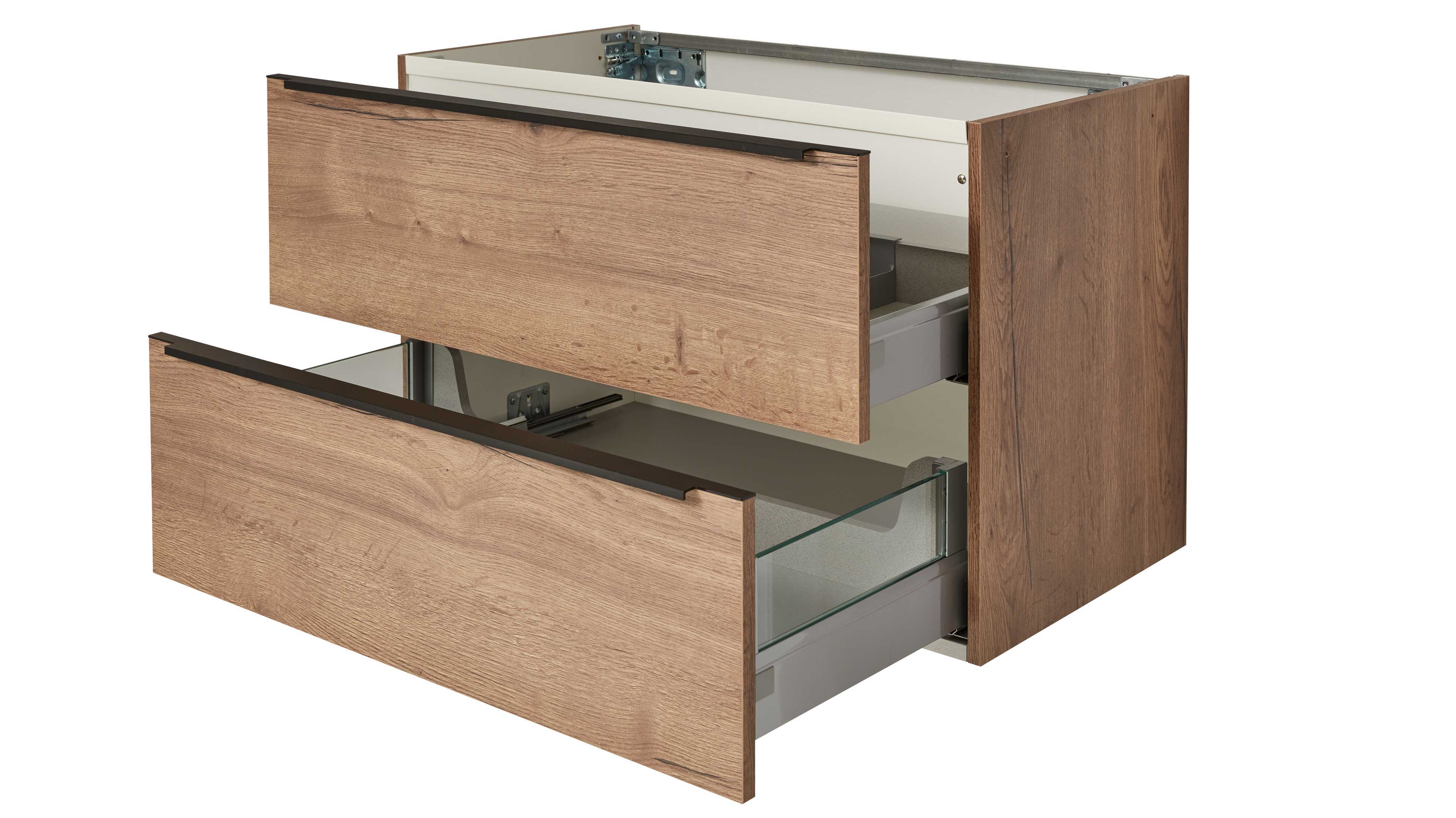 Der Waschtischschrank bietet eine Schublade und einen Auszug, beide ausgestattet mit Soft-Close und Selbsteinzug. So schließen sie sanft und leise, selbst bei hoher Belastung bis zu 30 kg. Gegen Mehrpreis sind seitliche Glaseinsätze erhältlich, die das moderne Design noch mehr unterstreichen.