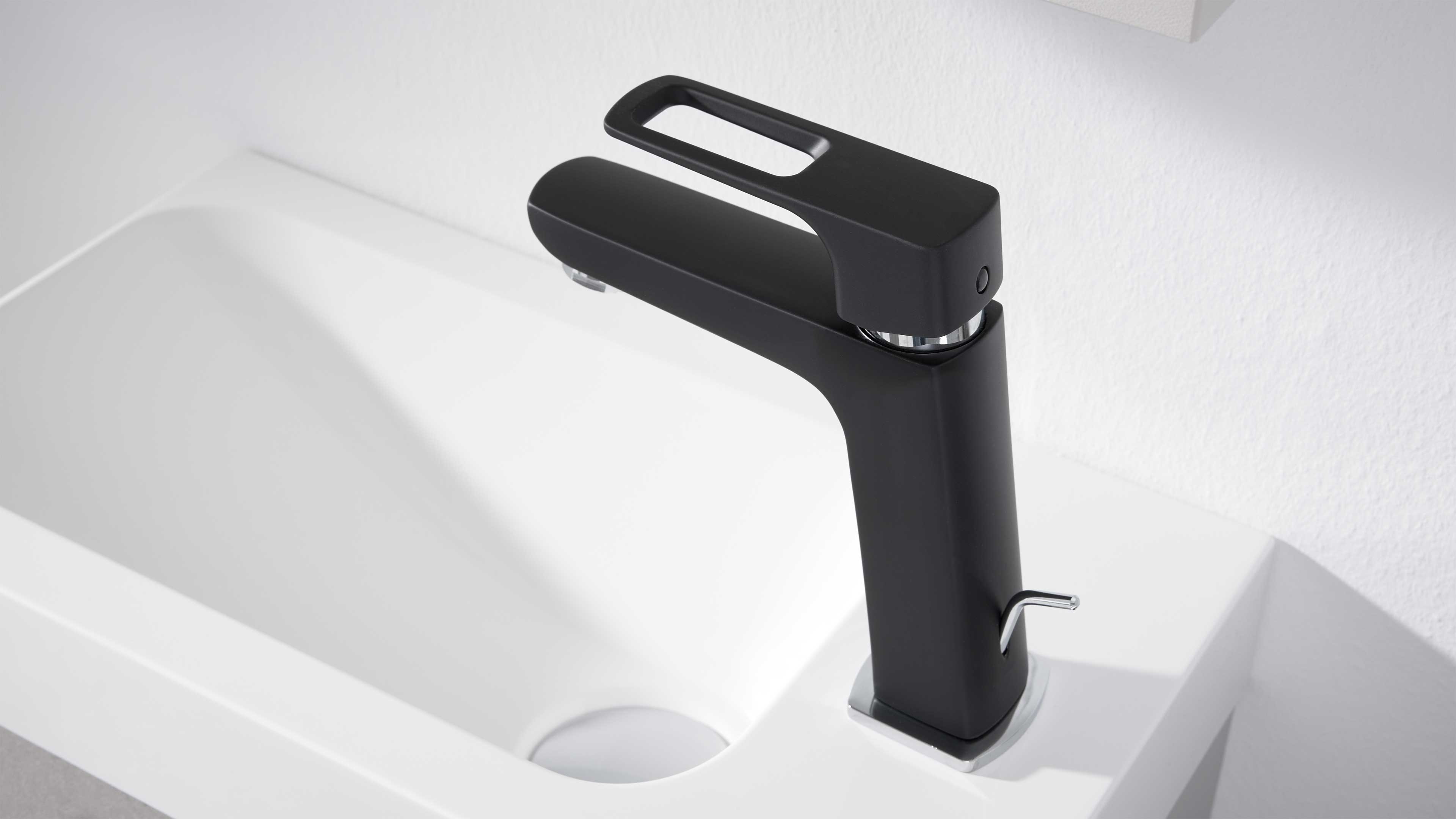 Die schwarze Einhand-Mischbatterie (Typ 17718) überzeugt mit hochwertiger Verarbeitung und cleverer Ausstattung. Sie verfügt über eine Zugstangen-Ablaufgarnitur, Anschlüsse für Warm- und Kaltwasser und einen integrierten Luftsprudler (24 mm Durchmesser), der für einen angenehm weichen Wasserstrahl sorgt. Flexible Anschlussschläuche machen die Installation besonders einfach. Mit Maßen von ca. 12 x 15 cm (BxH) passt sie ideal in eine Hahnlochbohrung von 35 mm Durchmesser – kompakt, funktional und optisch ein echtes Statement.
