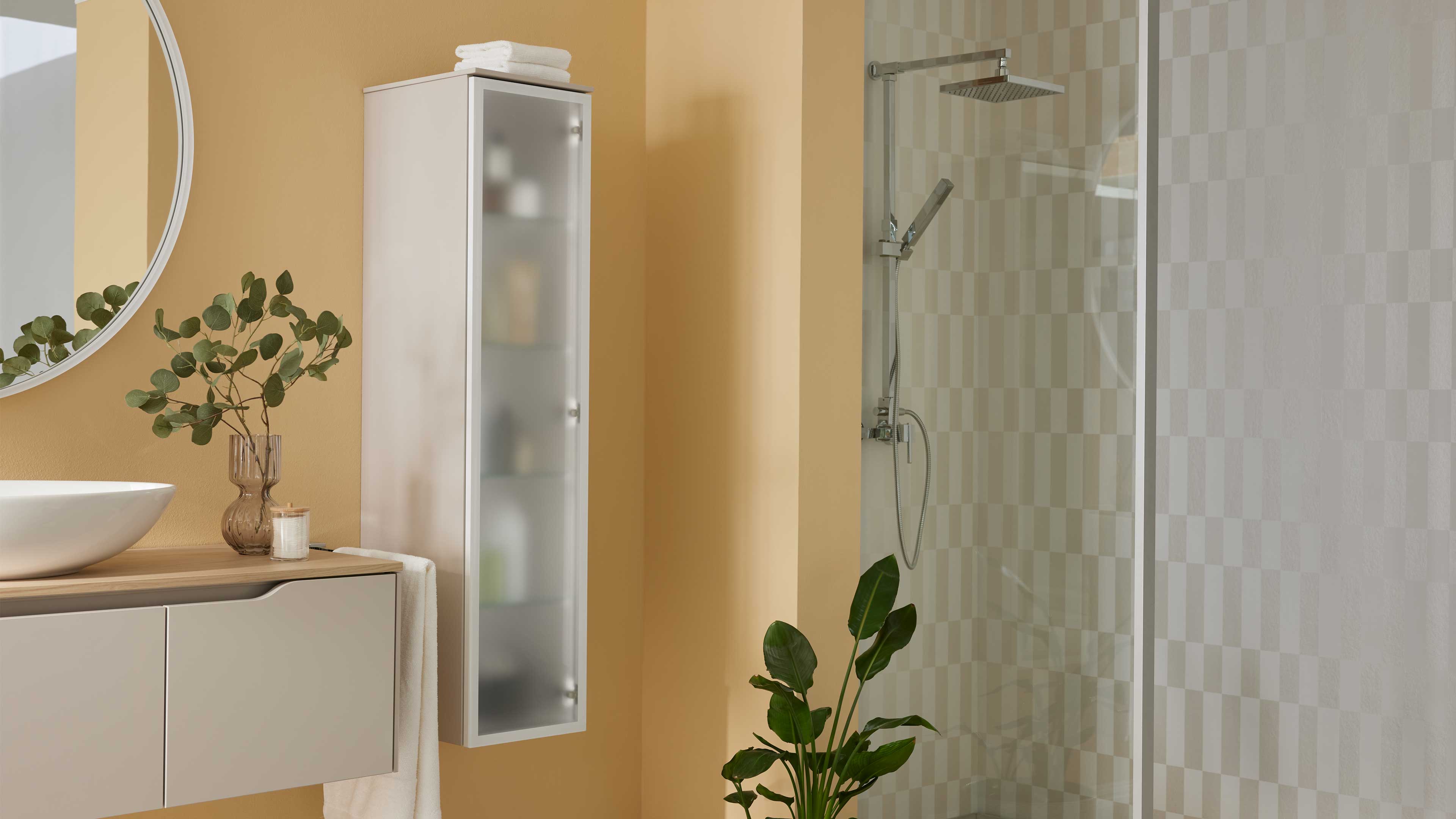Der Midischrank kombiniert einen alpinweißen Aluminiumrahmen mit Mattglas und einen matt sandfarbenen Korpus – ein harmonisches Zusammenspiel, das deinem Bad eine wohnlich-moderne Atmosphäre verleiht. Die grifflos gestaltete Rahmentür öffnest du bequem über die push-to-open-Funktion mit Öffnungsunterstützung. Innen findest du vier höhenverstellbare Klarglasböden, die dir flexible Ordnung ermöglichen. Mit Maßen von ca. 30 x 130 x 35 cm (B/LxHxT) ist der Schrank kompakt, aber erstaunlich geräumig. Der passende Abdeckboden misst ca. 30 x 1 x 35 cm (B/LxHxT). Für stilvolle Lichtakzente sorgt die integrierte Innenbeleuchtung inklusive Starter-Set.