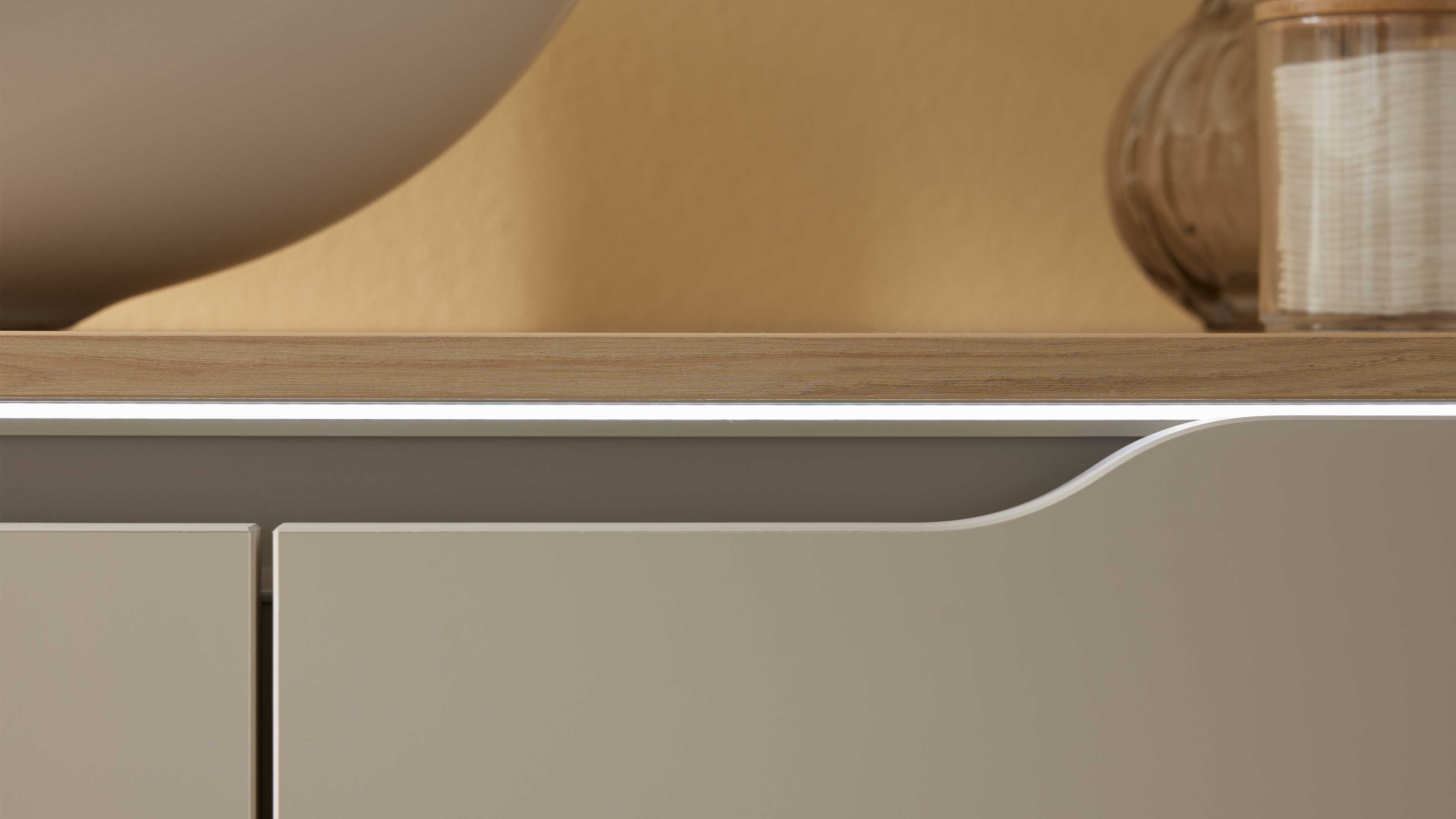 Die Unterschränke sind mit einer LED-Beleuchtung für die Griffmulden ausgestattet und werden inklusive Starter-Set (Typ 15049, 36 Watt) geliefert – das sorgt für stimmungsvolle Lichtakzente und ein modernes Ambiente. Der passende Abdeckboden mit Ausschnitt für das Waschbecken misst ca. 137 x 1,6 x 49 cm (B/LxHxT) und bietet eine großzügige Ablagefläche für alles, was du täglich griffbereit haben möchtest.