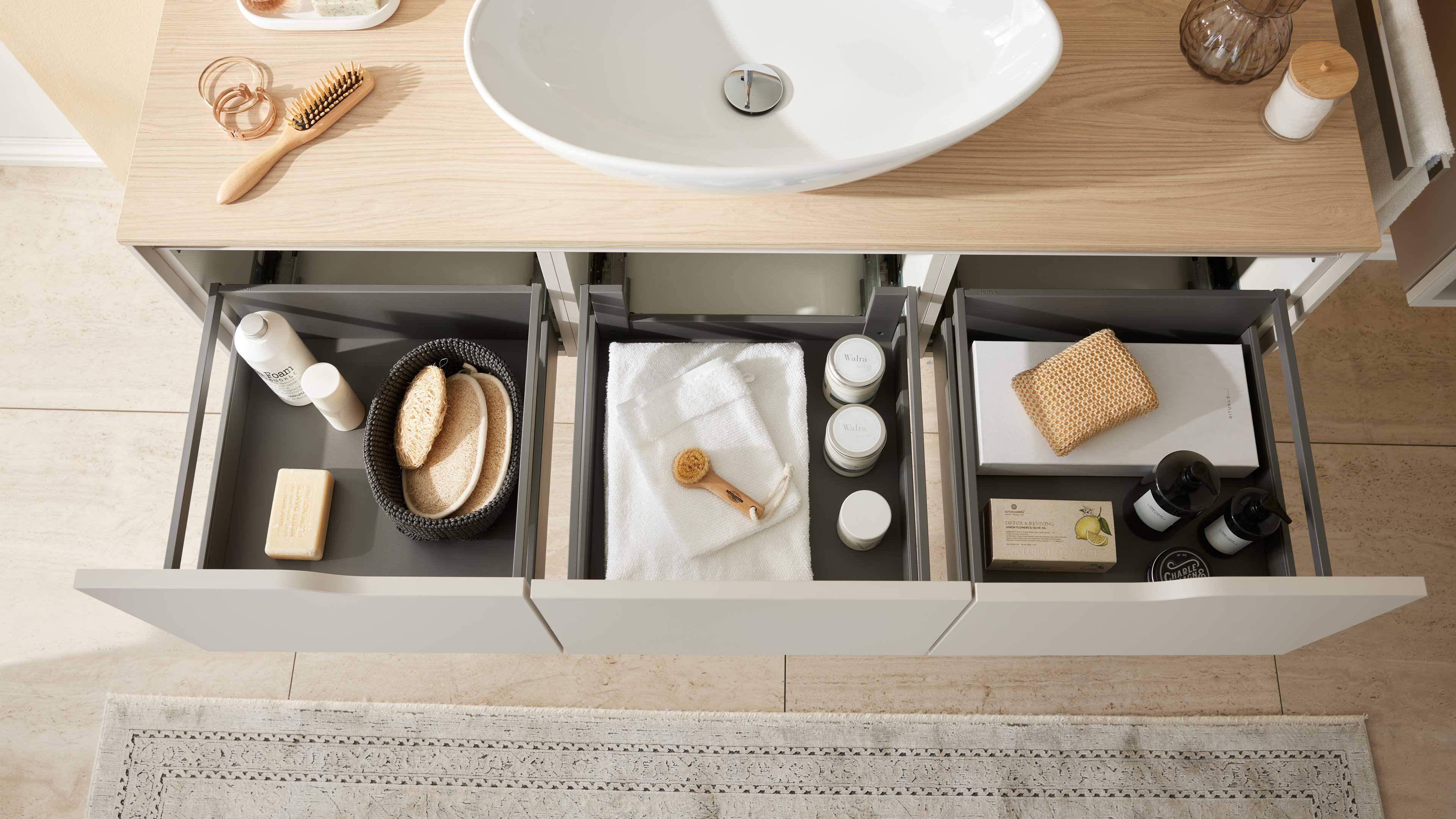 Das Möbelensemble überzeugt mit klaren Linien, smarter Aufteilung und eleganter Beleuchtung. Der linke Abschlussschrank mit einem Auszug bietet Platz für Pflegeprodukte und misst ca. 45 x 36 x 46 cm (B/LxHxT). Eine holzfarbene Abschlusswange rahmt ihn perfekt ein. Der Waschtischunterschrank mit großer Schublade und Rückwand ist ideal für Badutensilien und besitzt dieselben Maße. Auf der rechten Seite rundet der identische Abschlussschrank mit der Abschlusswange das Gesamtbild harmonisch ab.