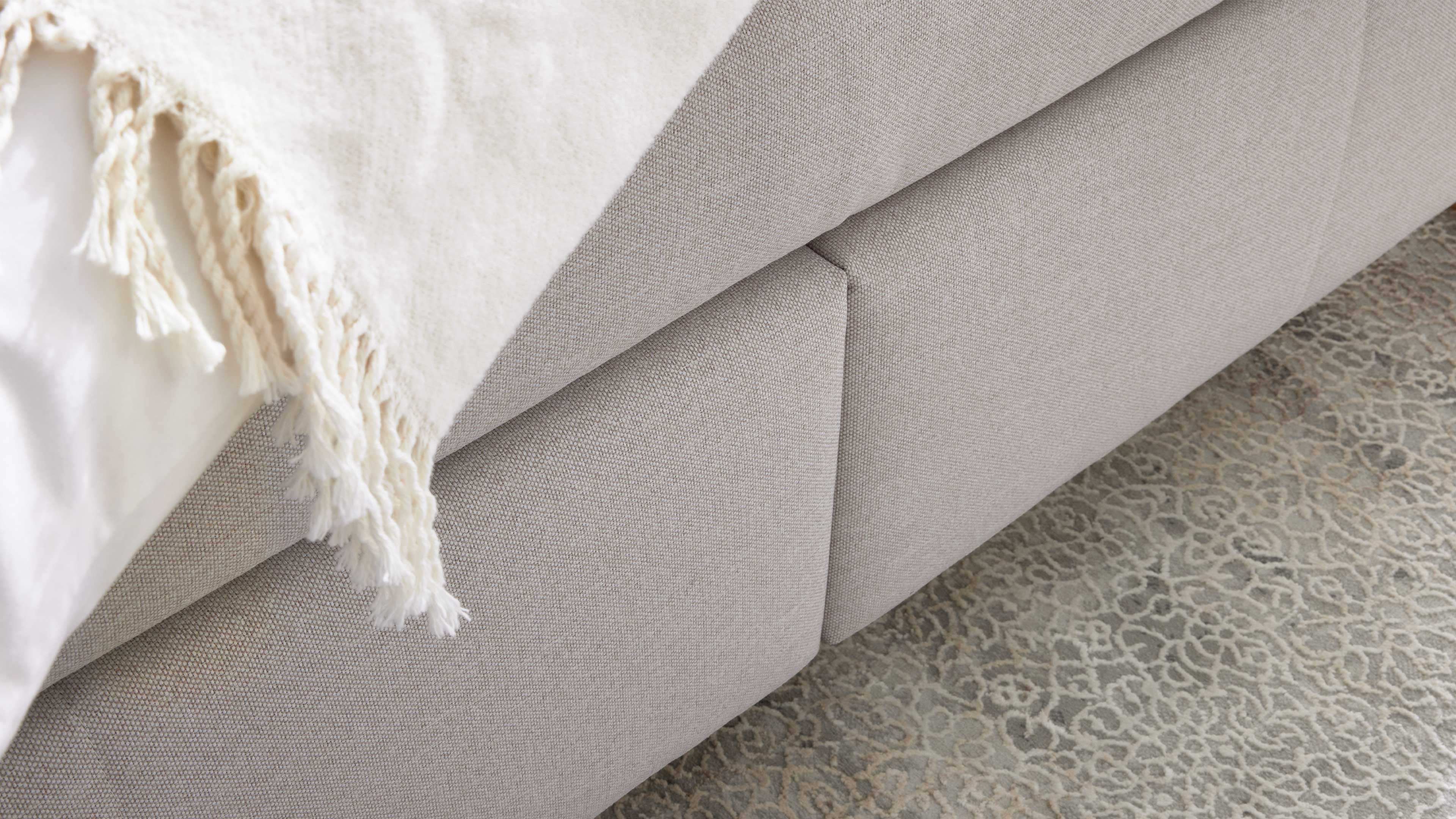 Der dreiseitig stoffbezogene Boxunterbau mit massiven Holzfüßen bildet die stabile Grundlage des Boxspringbettes. Im Inneren sorgen zwei separate 7-Zonen-Tonnentaschenfederkernmatratzen für zusätzliche Federung und ein besonders komfortables Liegegefühl.
