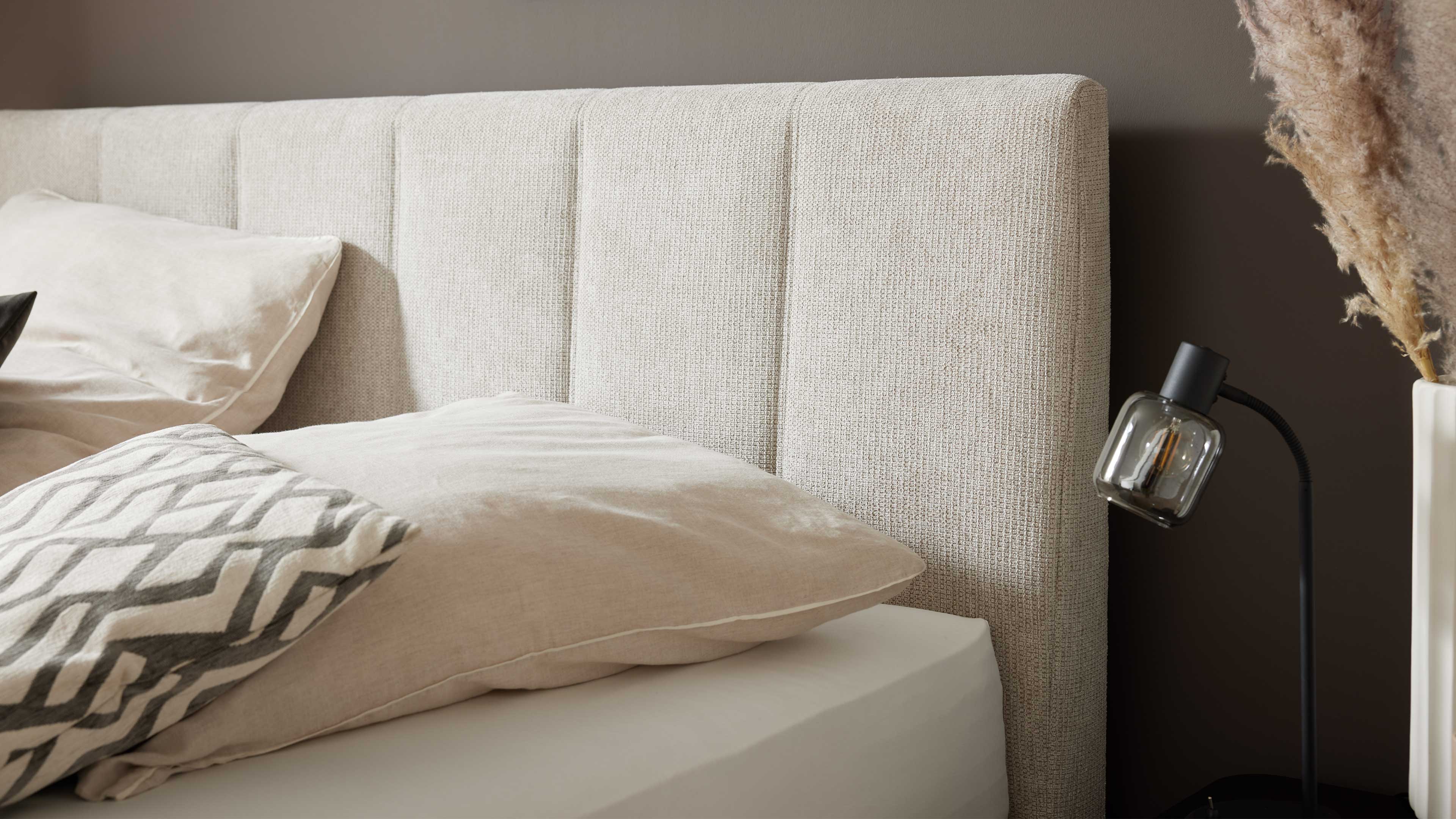 Boxspringbett in hellem Beige mit breiter Rechtecksteppung im Kopfteil
