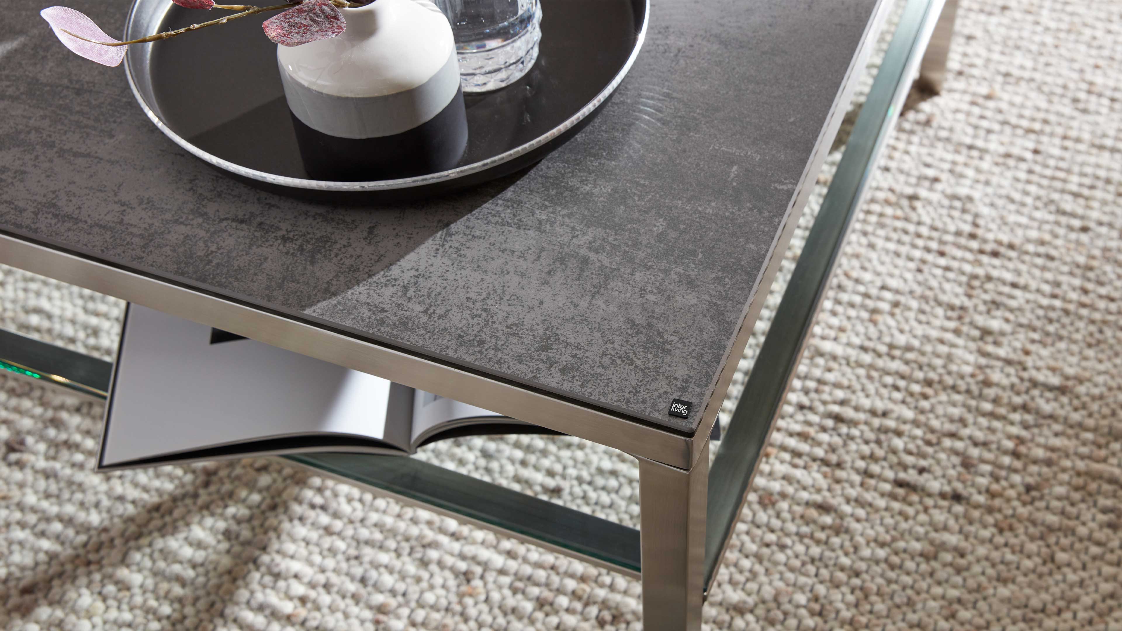 Quadratischer Couchtisch mit dunkler Keramikplatte, Edelstahlgestell und Glasebene
