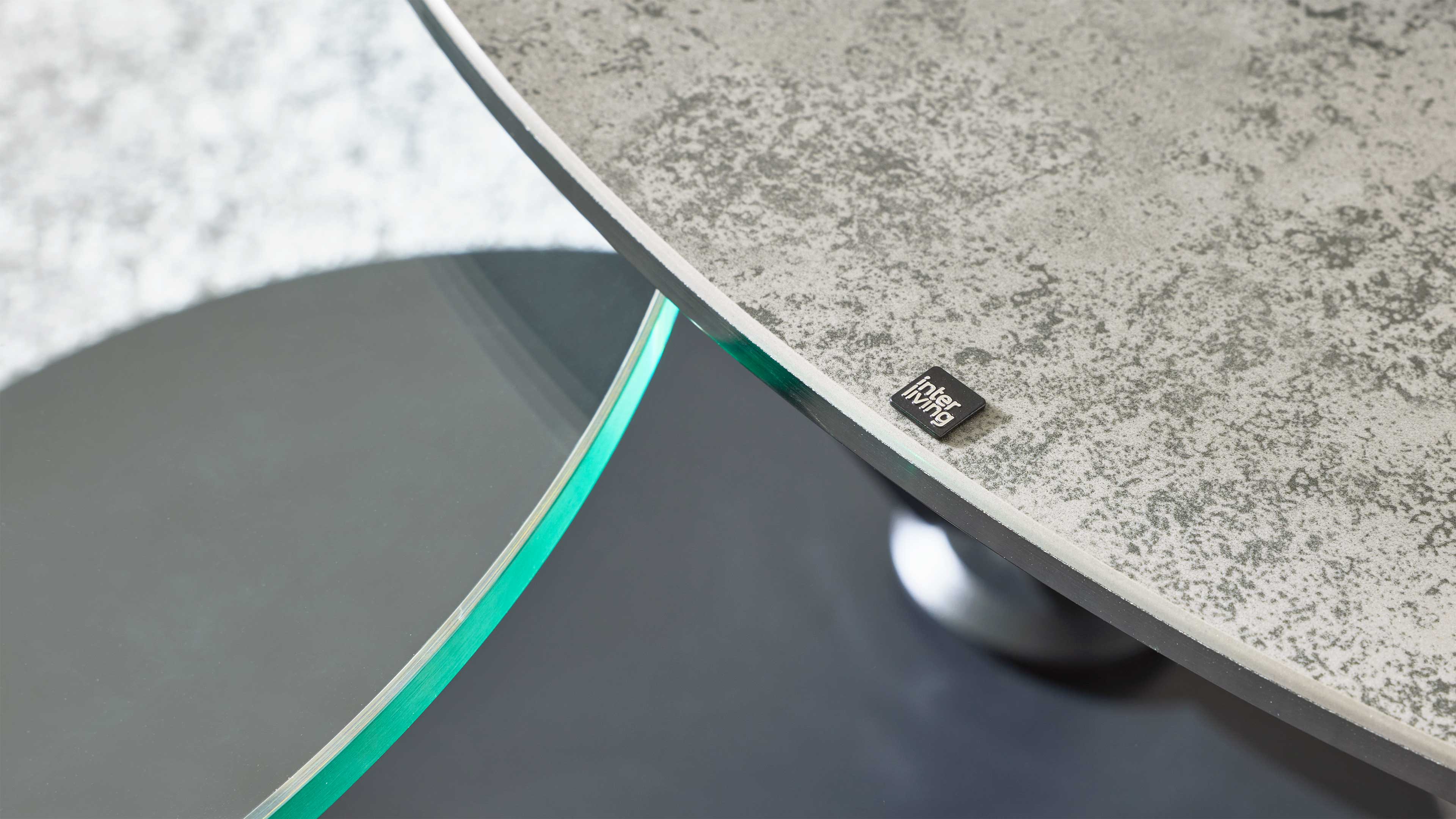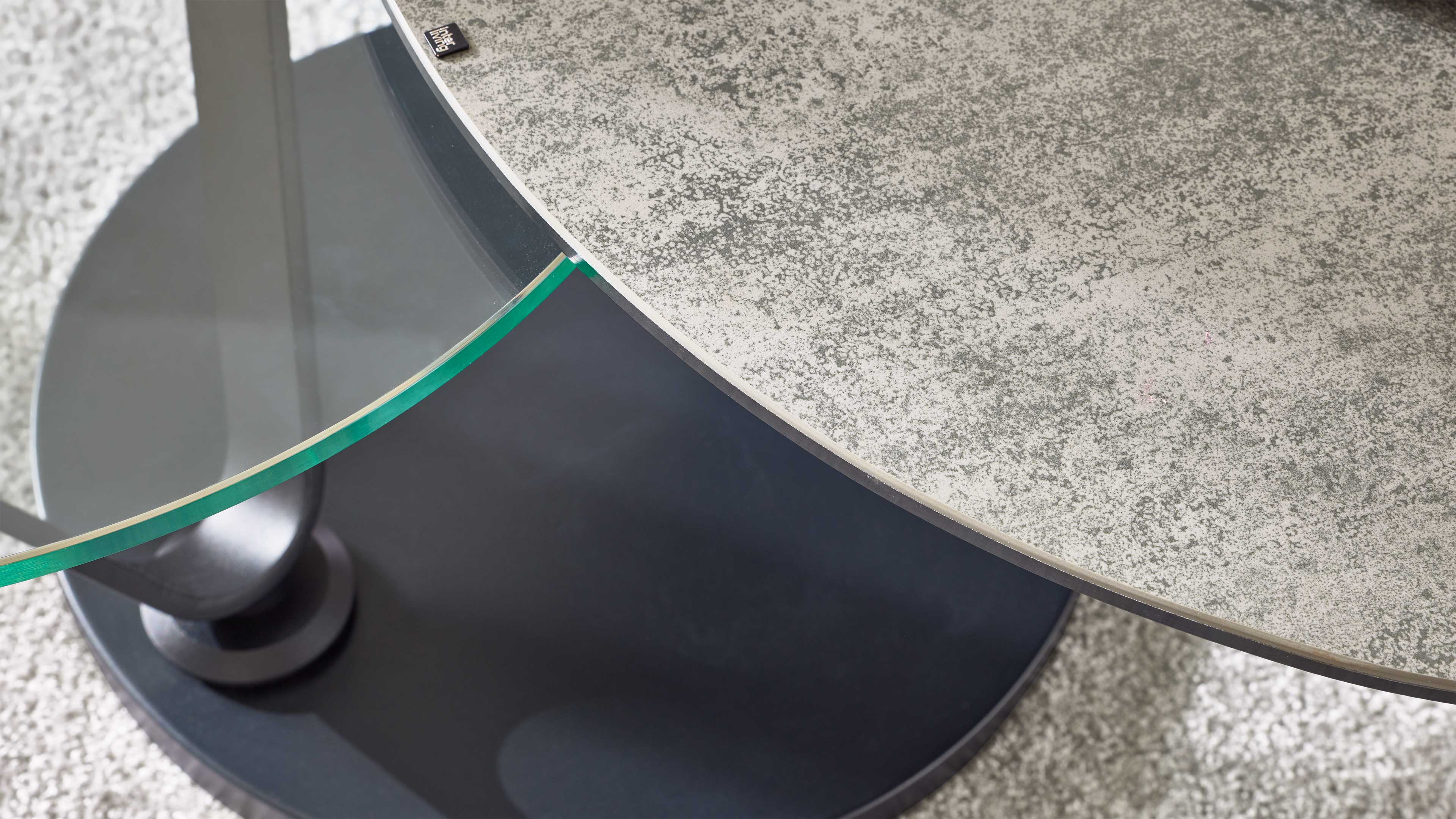 Couchtisch mit runder Keramik- und Glasplatte auf schwenkbaren Metallarmen