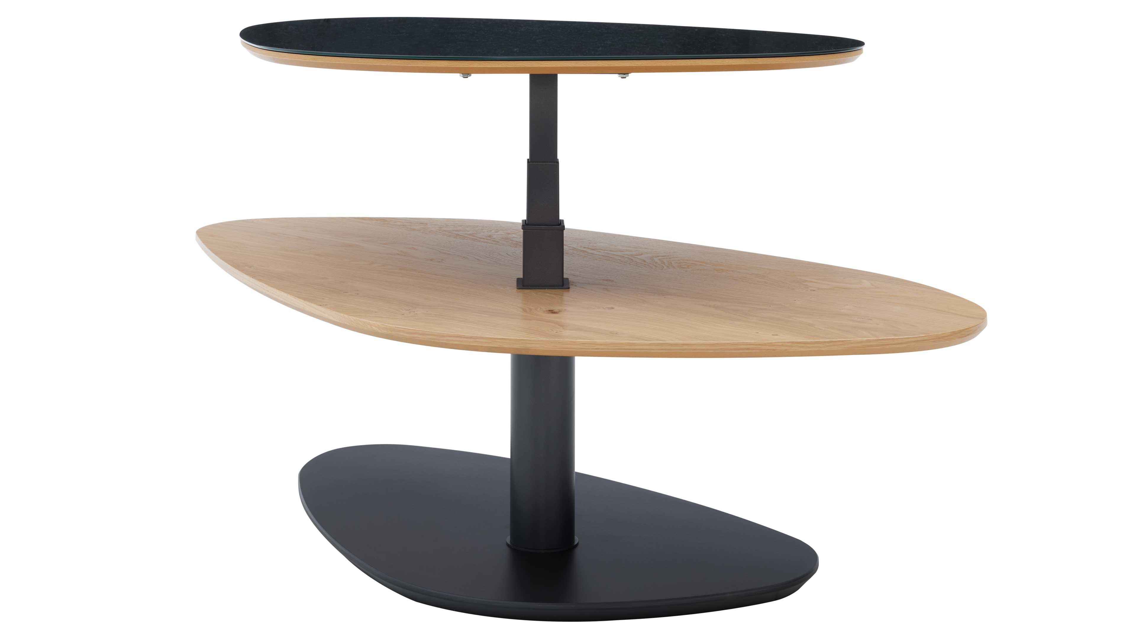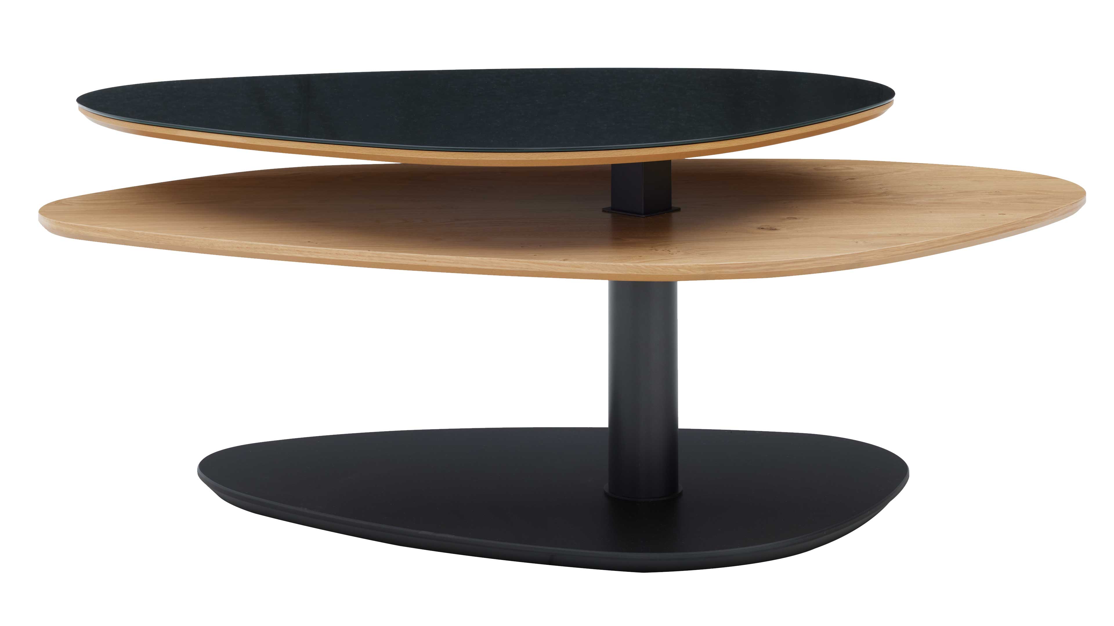 Organisch geformter Couchtisch mit drehbarer Glasplatte und Ablage in Eiche-Optik