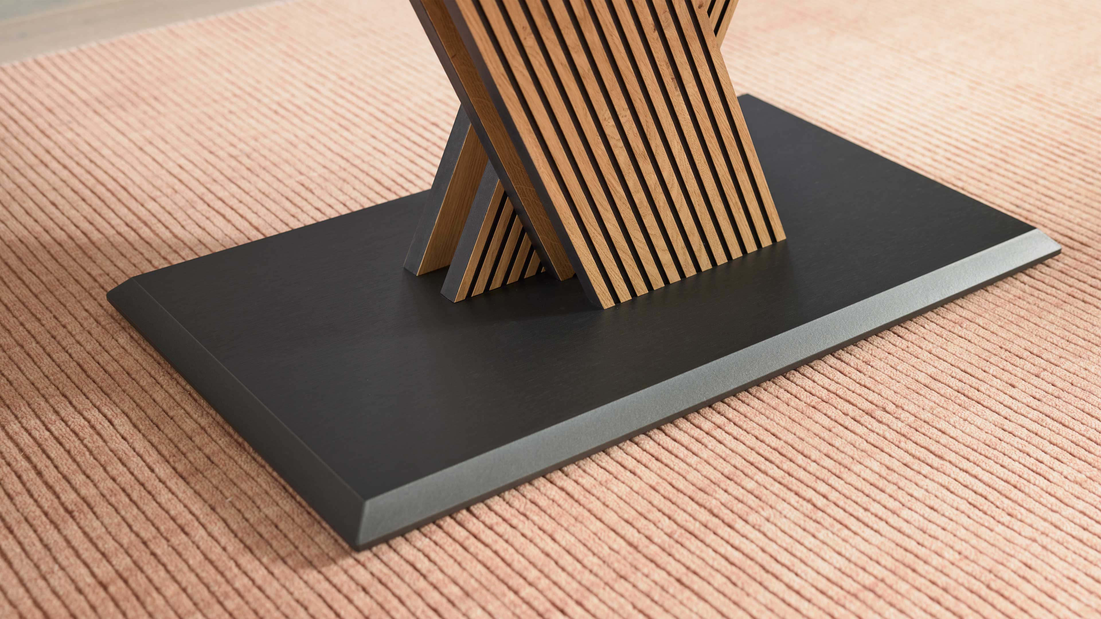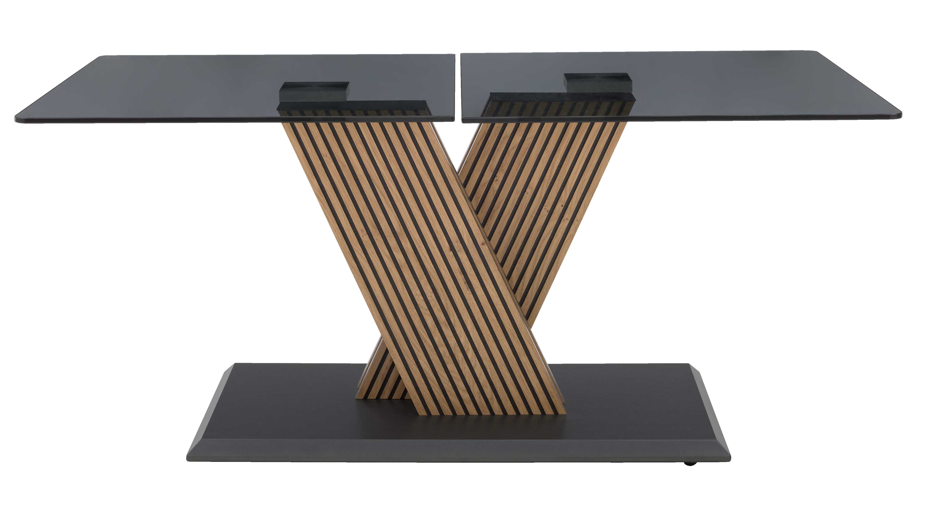 Couchtisch mit schwenkbaren Glasplatten und auffälligem X-Gestell aus Holzlamellen
