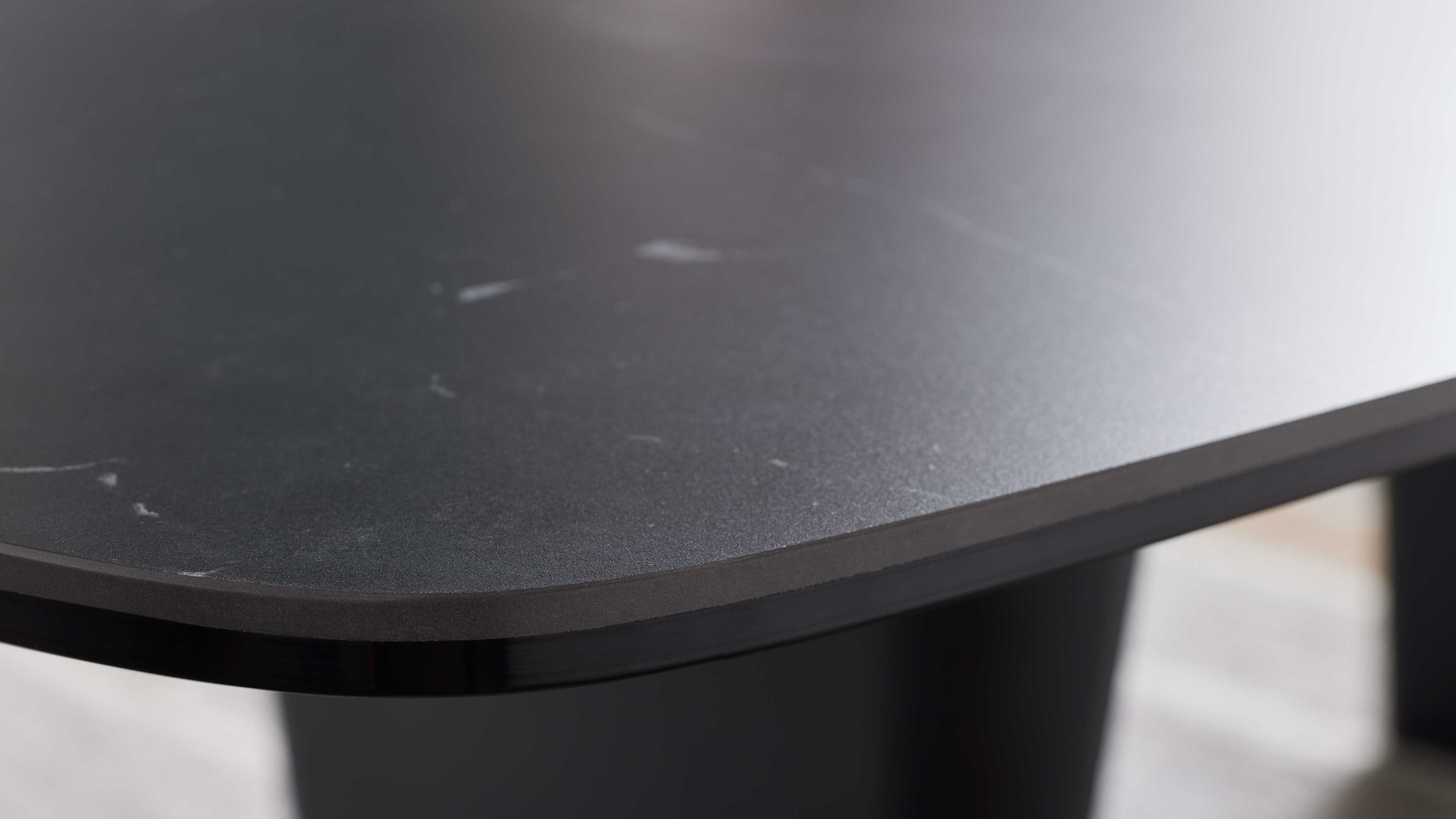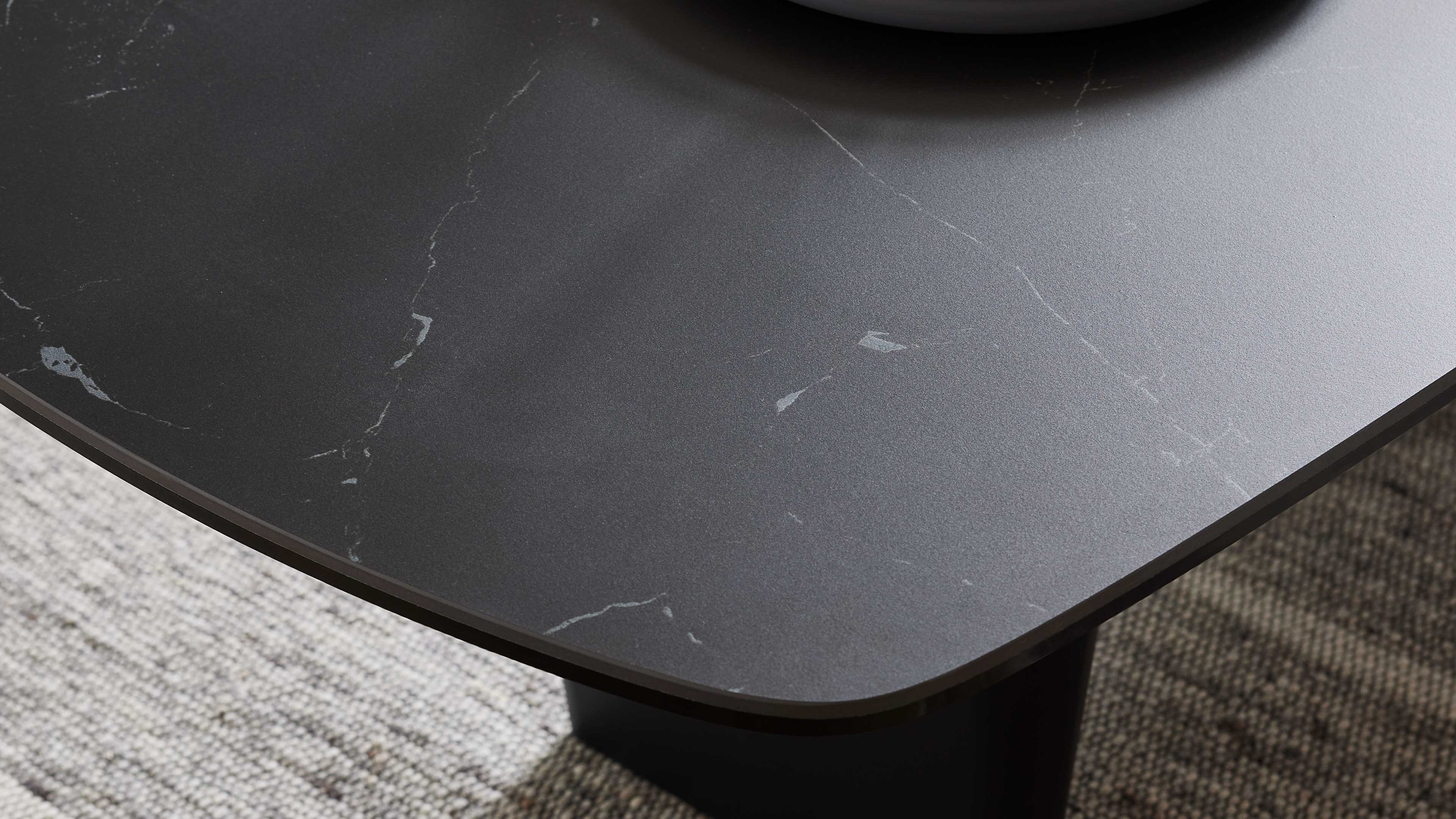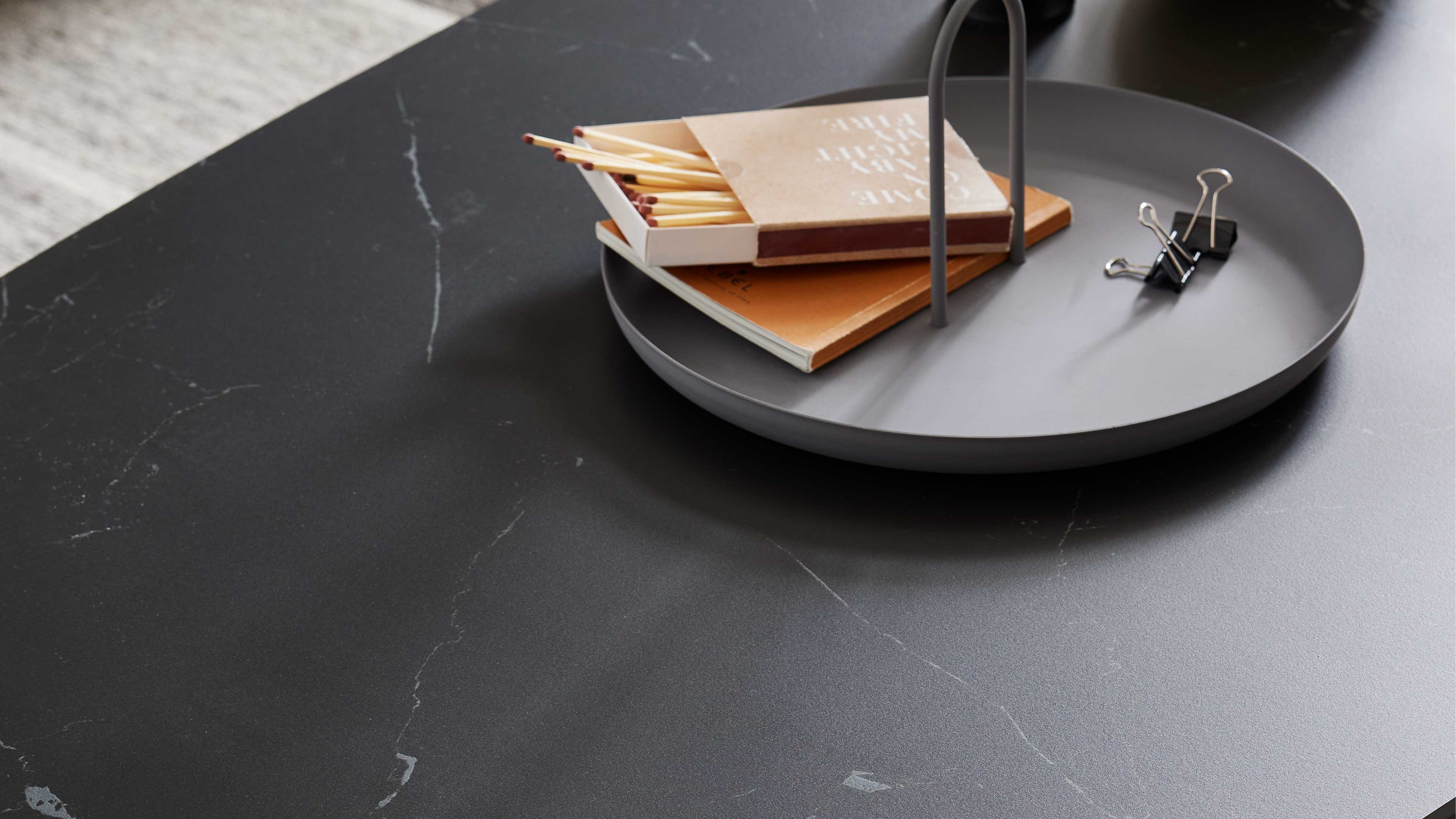 Die Tischplatte ist in drei verschiedenen Ausführungen und zwei Größen erhältlich, sodass du den Tisch ganz nach deinem Stil und Raumkonzept wählen kannst. Das mattschwarz lackierte Stahlgestell sorgt für Stabilität und setzt einen modernen Akzent – perfekt für ein harmonisches, stilbewusstes Wohnambiente.