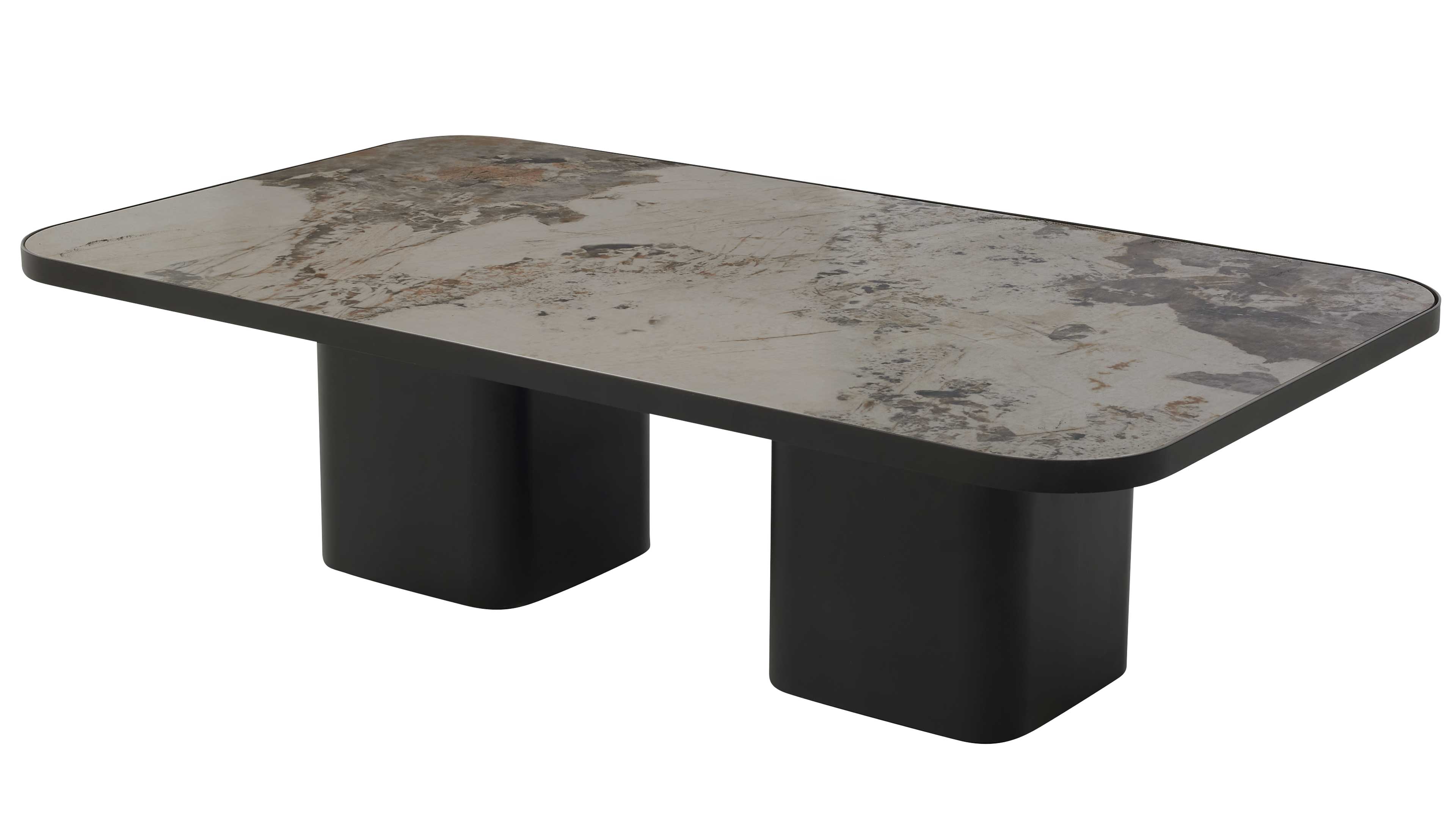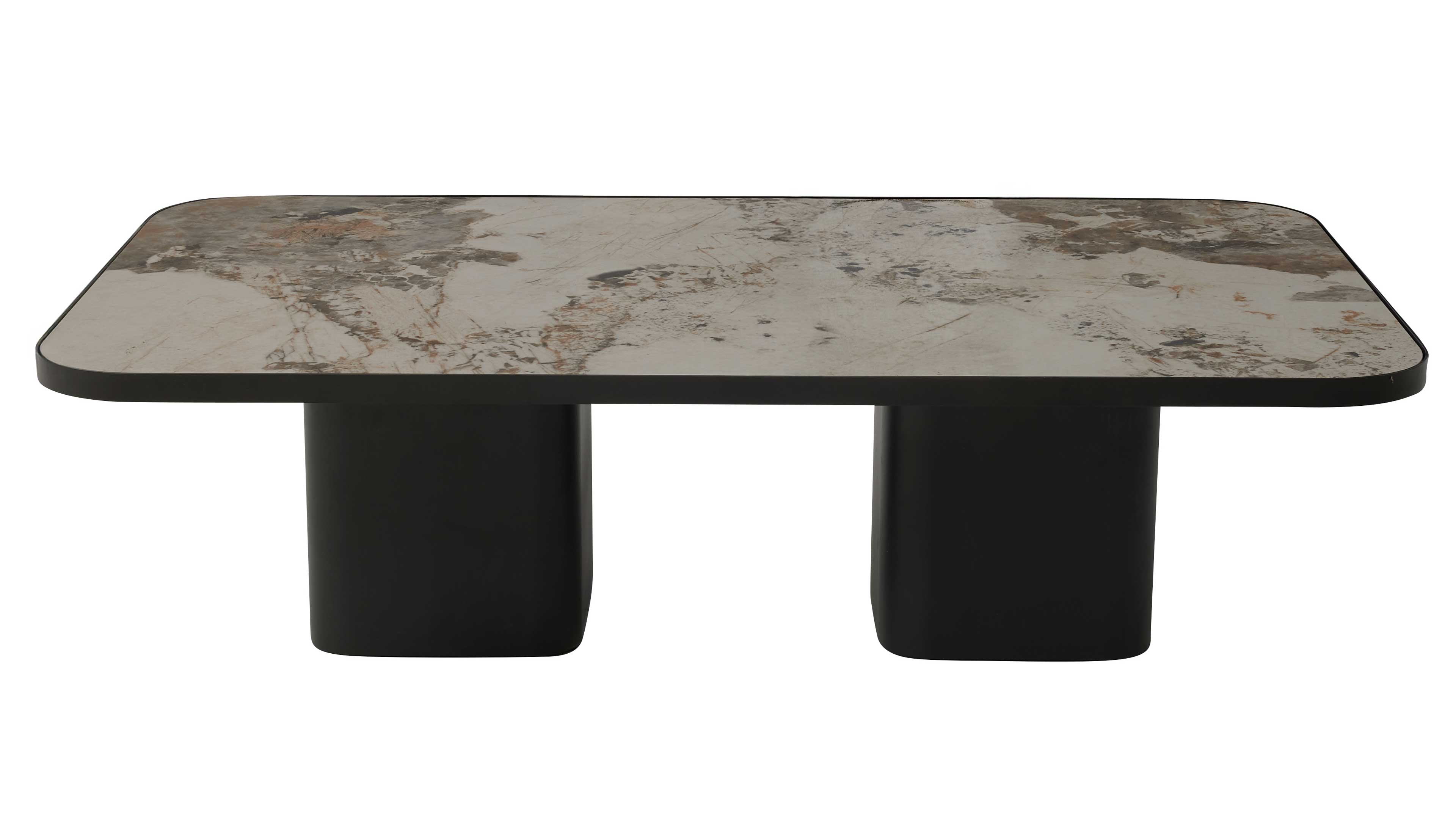 Moderner Couchtisch mit marmorierter Keramikplatte und schwarzem Sockel