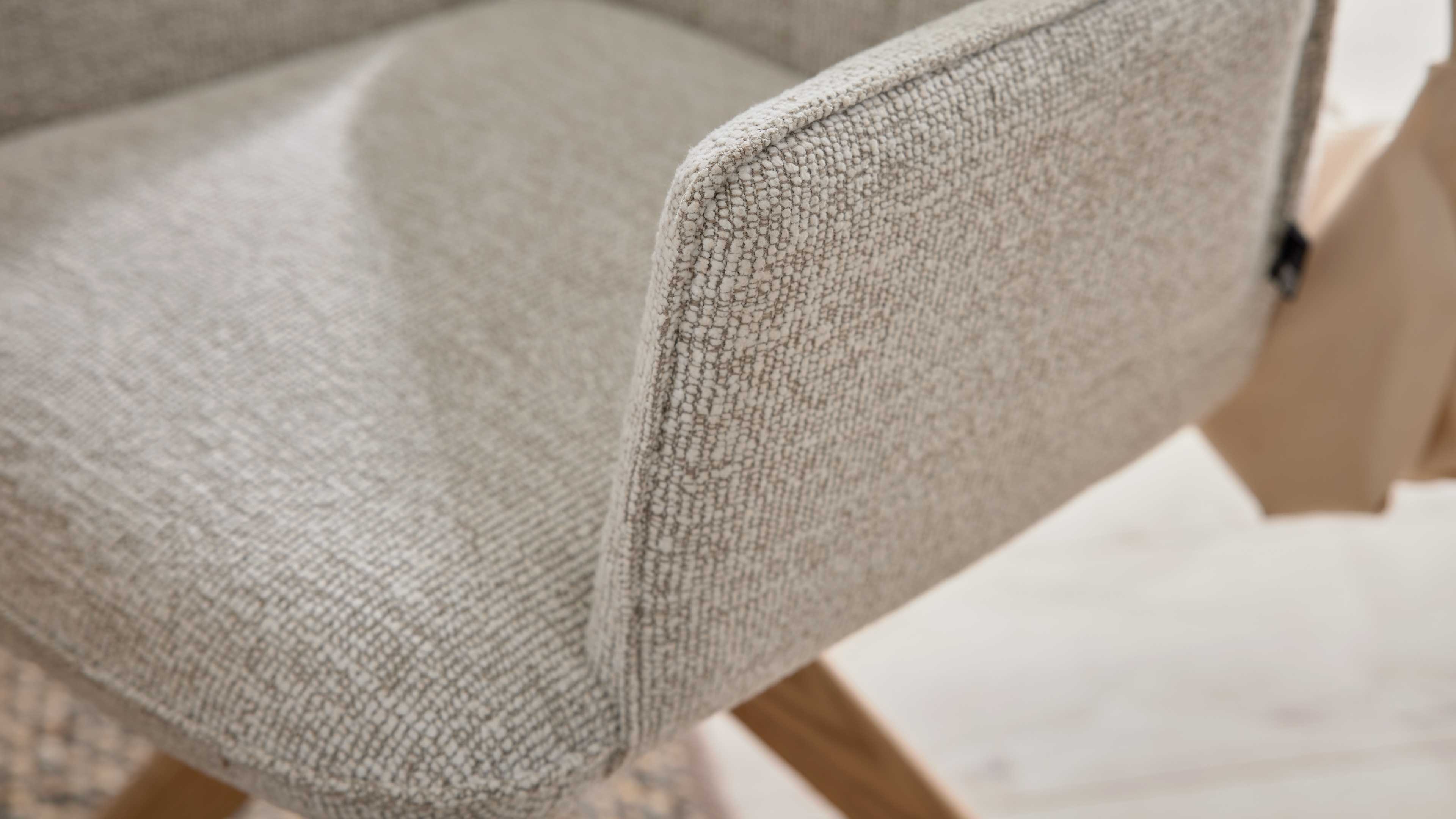 Moderner Drehstuhl mit hellgrauem Stoffbezug und stilvollem 4-Fuß-Gestell aus massiver Eiche