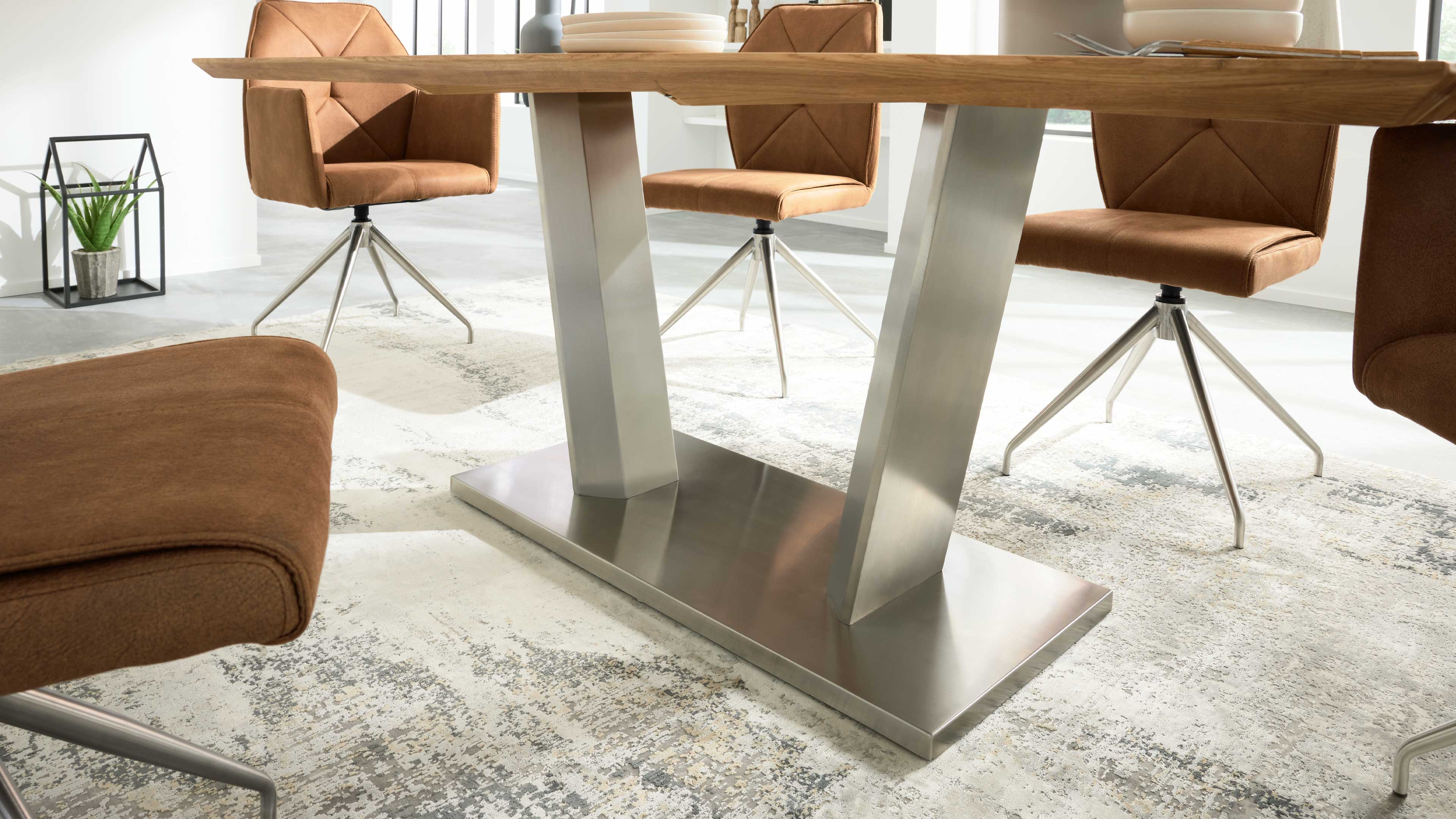 Esstisch mit massiver Holzplatte und V-Gestell aus Edelstahl
