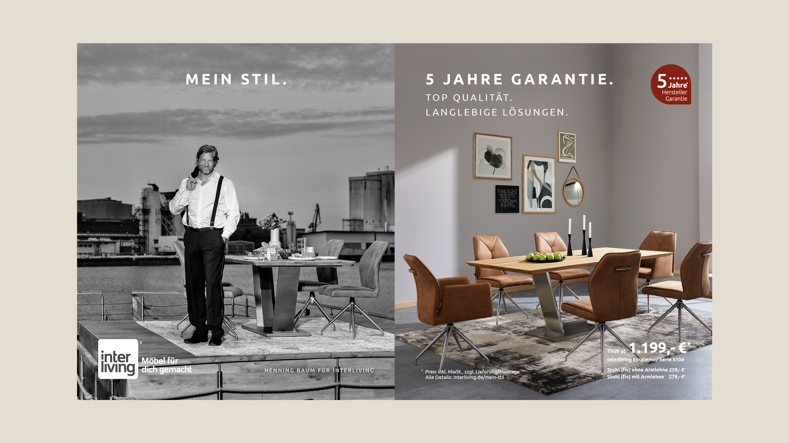 Alle Möbel der Interliving Esszimmer Serie 5104 – einschließlich des Barstuhls BL57 – werden mit höchstem Anspruch an Verarbeitung und Materialien gefertigt. Der Hersteller gewährt dir eine 5 Jahre Herstellergarantie – für nachhaltige Qualität, geprüfte Langlebigkeit und ein sicheres Gefühl beim Möbelkauf.