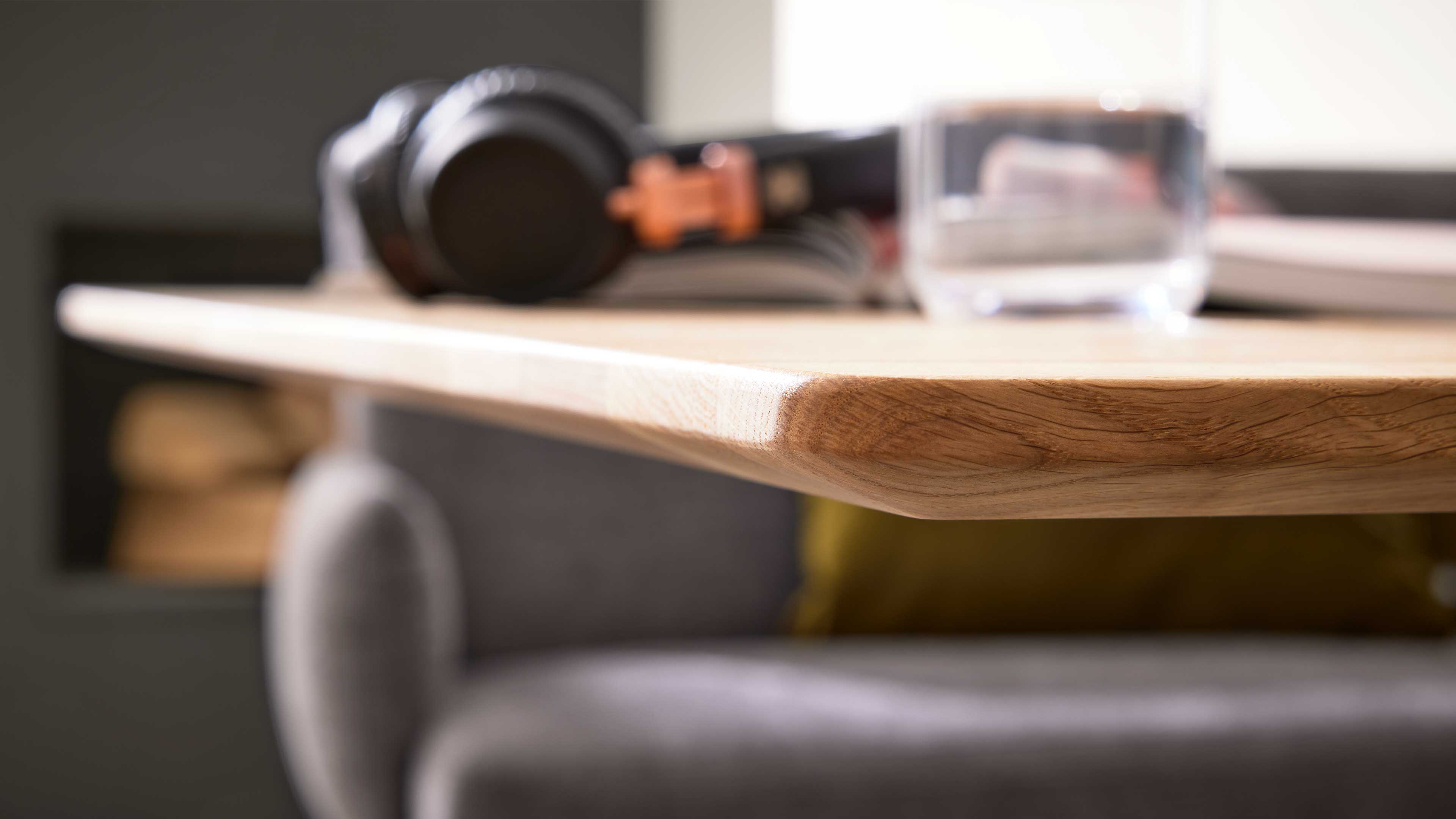 Die Tischplatte aus massiver Charakter-Eiche zeichnet sich durch ihre markante Maserung und warme Ausstrahlung aus. Mit einer Plattenstärke von ca. 13 mm wirkt sie elegant schlank und modern, während die Facettenkante für ein feines, hochwertiges Finish sorgt. Massivholz ist nicht nur optisch ein Highlight, sondern auch besonders langlebig und pflegeleicht. Die Oberfläche ist robust, widerstandsfähig und behält ihren natürlichen Charme über viele Jahre hinweg – perfekt für ein Möbelstück, das täglich genutzt wird.
