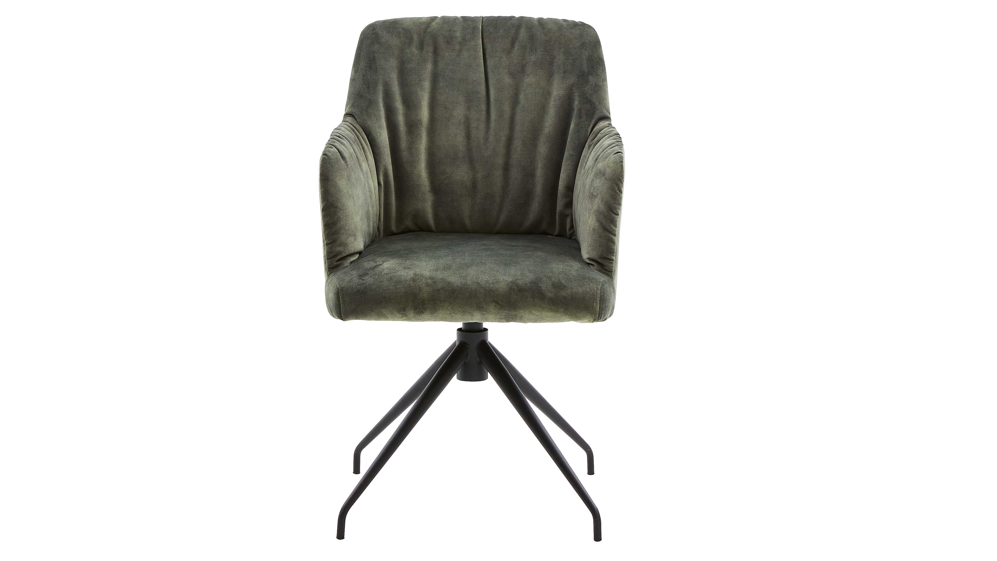 Drehbarer Polstersessel mit Armlehnen, samtigem grünen Bezug und schwarzen Metallbeinen