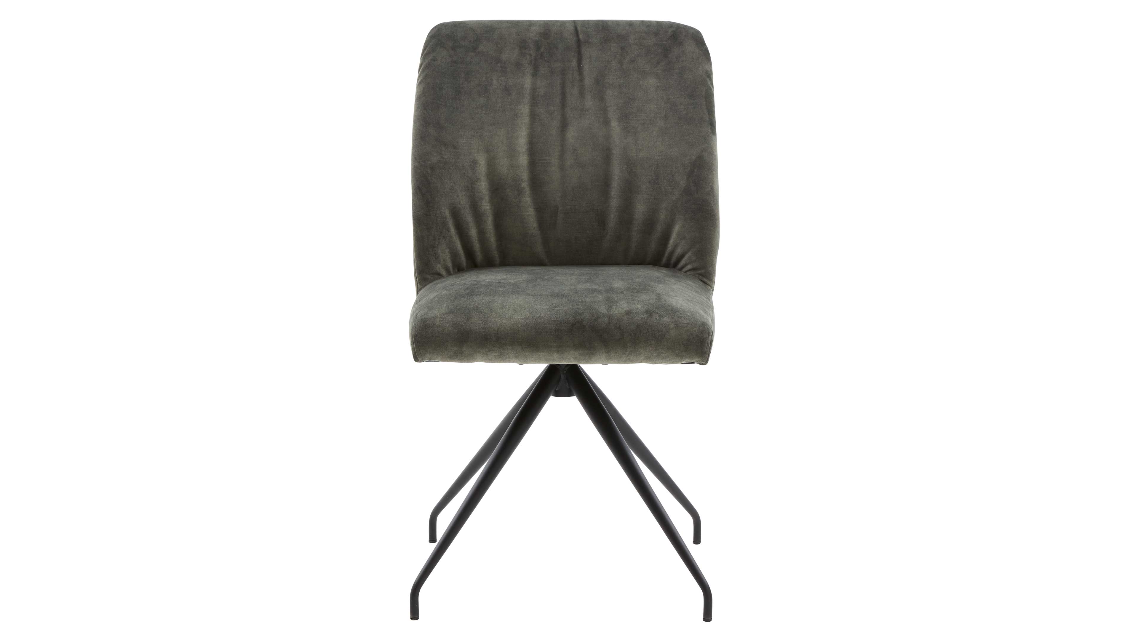 Drehbarer Polsterstuhl mit samtig grünem Bezug und modernen schwarzen Metallbeinen