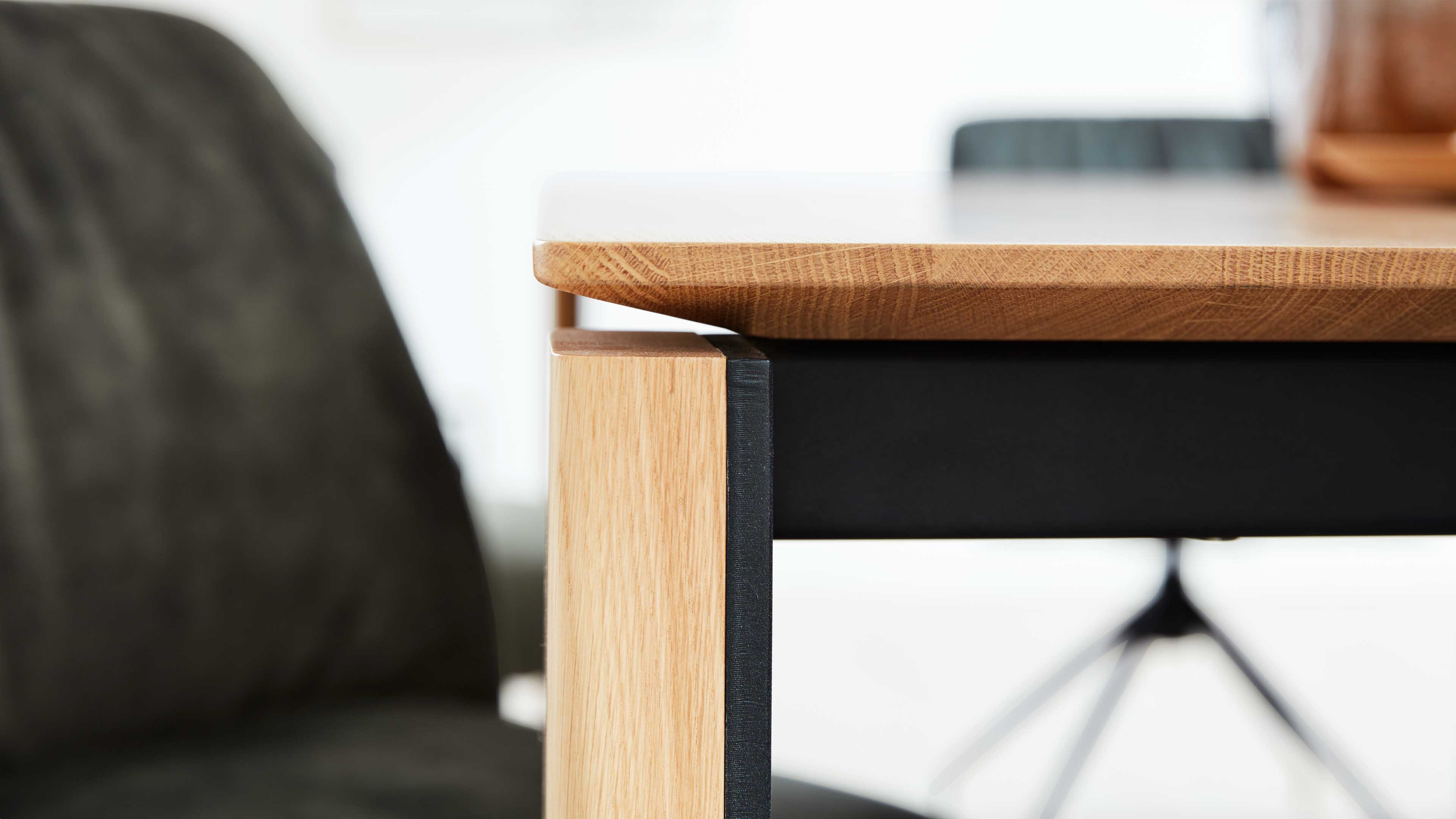 Der Esstisch aus der Interliving Esszimmer Serie 5110 bringt dir natürlichen Charme und modernes Design in einem Möbelstück an den Esstisch. Die natur geölte Tischplatte aus Eichenholz mit markanter Schweizer Kante und 24 mm starker Ausführung zeigt die Maserung des Holzes besonders schön und sorgt für eine warme, wohnliche Atmosphäre. Die Füße aus mattschwarz lackiertem Metall sind zusätzlich mit Eichenholz ummantelt – so entsteht ein harmonischer Mix aus Holz und Metall, der gleichzeitig modern und zeitlos wirkt. Mit Maßen von ca. 160 x 76 x 90 cm (B/LxHxT) ist der Massivholztisch ideal, wenn du dir einen großzügigen Mittelpunkt für deinen Essbereich wünschst.