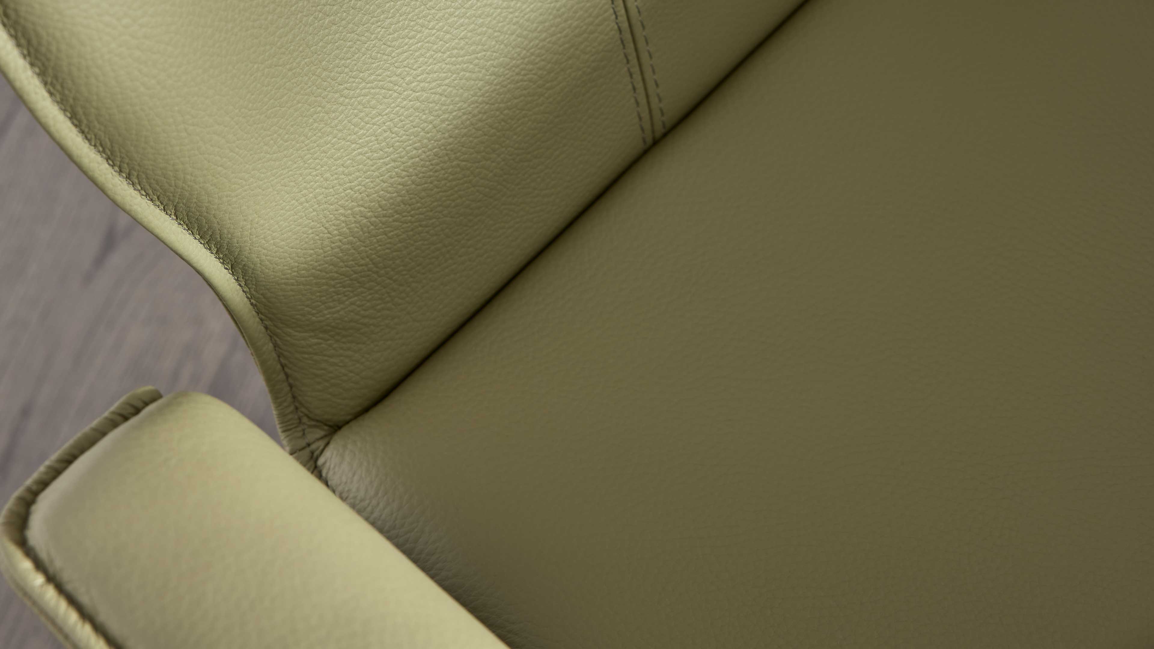 Das filigrane Vierfußgestell aus umbragrau pulverbeschichtetem Metall bildet eine stilvolle Ergänzung zum feinen Lederbezug. Die schlanke Silhouette und klare Linienführung sorgen für Leichtigkeit im Raum, während die Konstruktion zuverlässige Stabilität garantiert. Weich gepolsterte, schmale Armlehnen runden das Komforterlebnis ab – ein durchdachtes Detail für langanhaltenden Sitzgenuss.