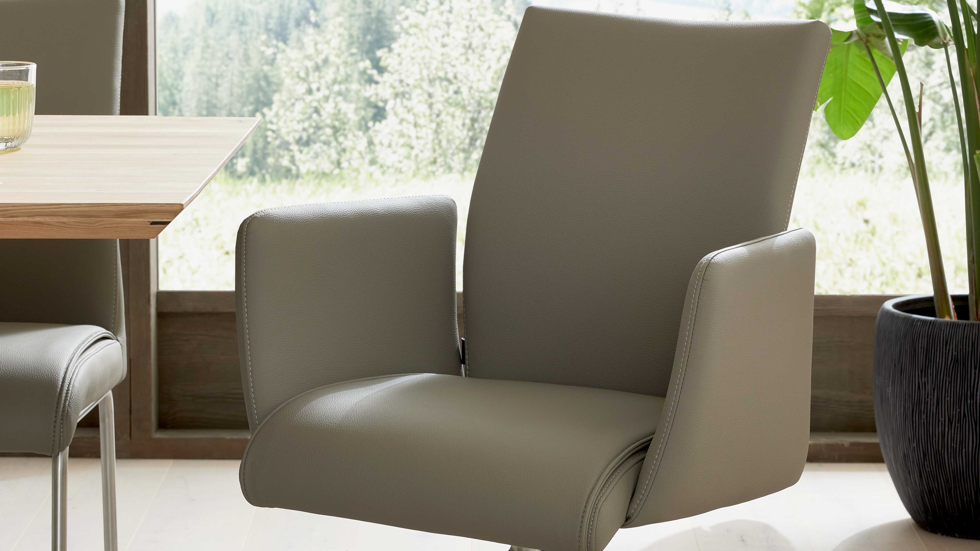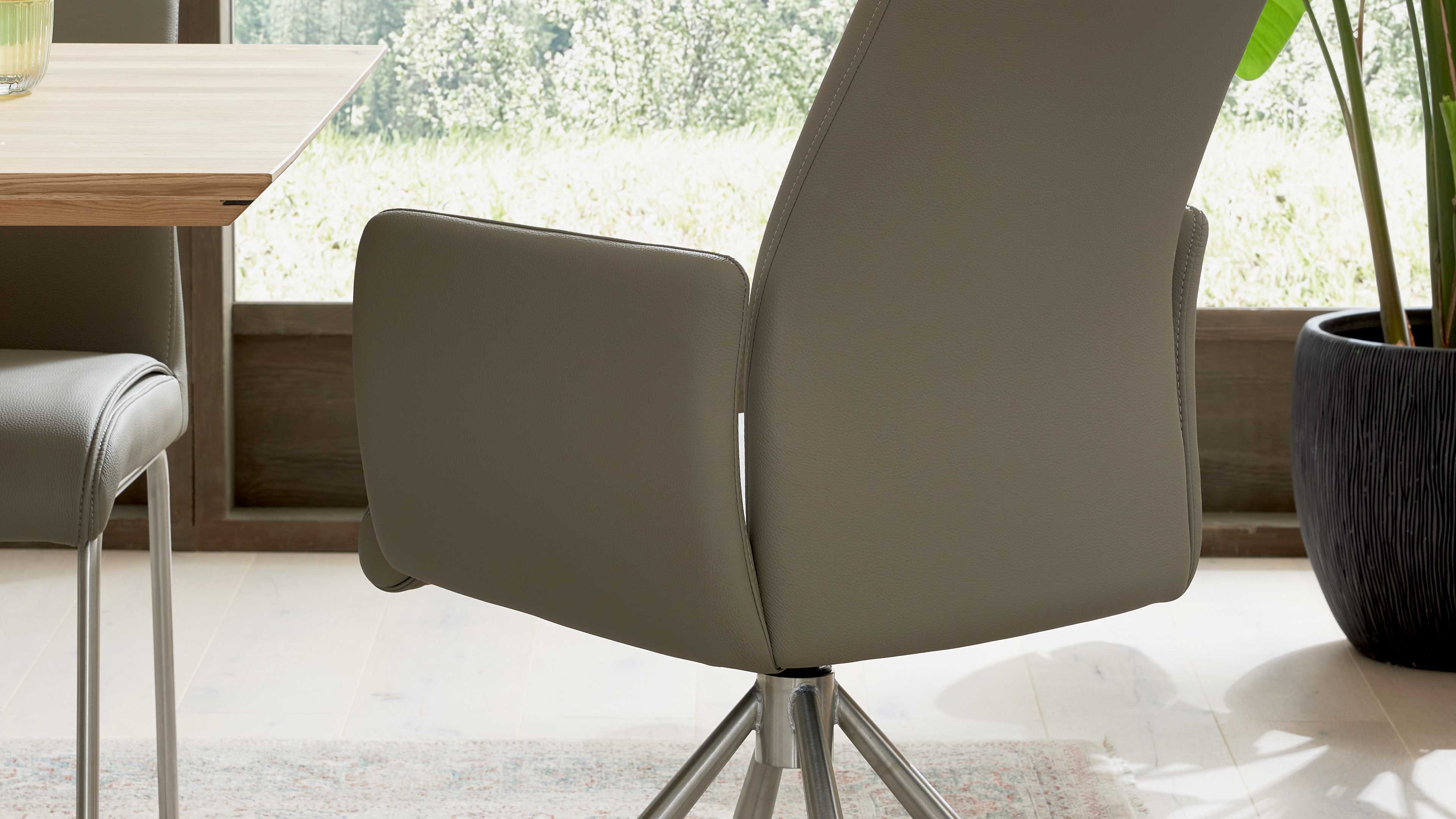 Auch bei der Sitzschale hast du Optionen: vier Varianten – wahlweise mit oder ohne Armlehnen – geben dir die Freiheit, genau den Komfort und die Form zu wählen, die zu deinem Essbereich passt. Dazu kommen zwölf attraktive Bezugsmöglichkeiten in robuster Mikrofaser oder hochwertigem LEA-TEX in Lederoptik, sodass du deinen Wunschstuhl farblich und haptisch perfekt abstimmen kannst.