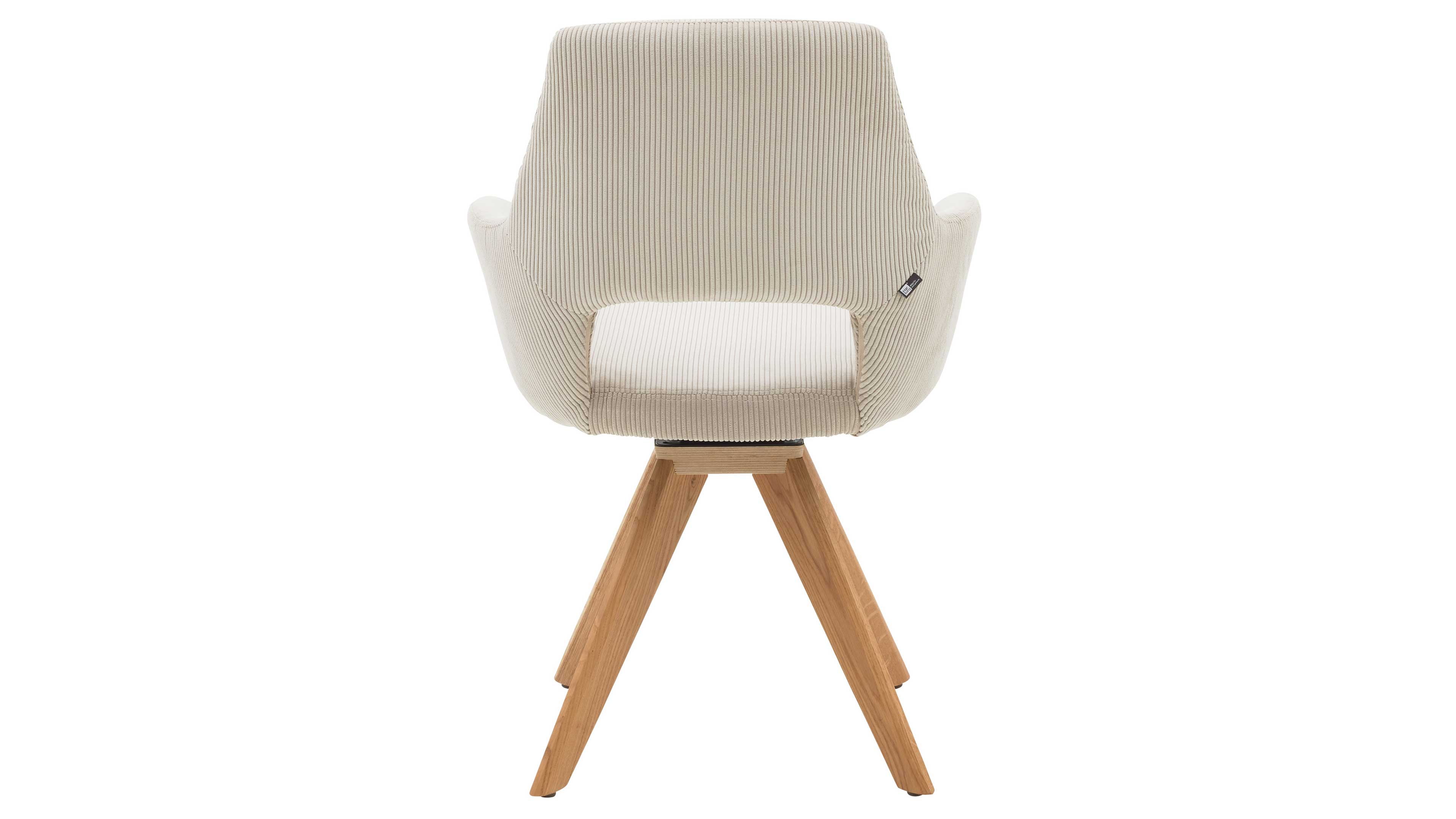 Drehbarer Polsterstuhl mit Armlehnen in cremefarbenem Cordstoff und stabilem Holzfuß