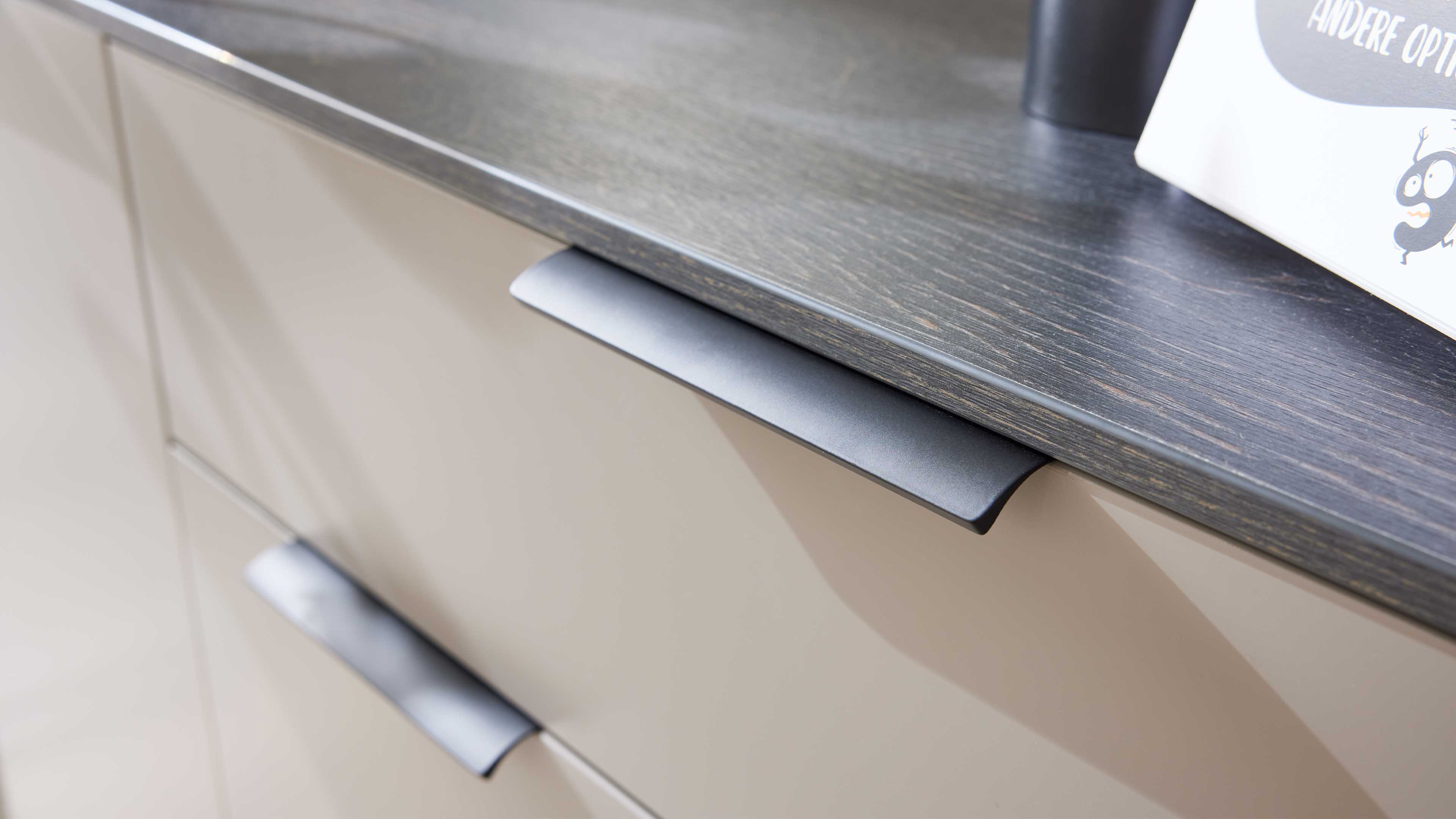 Die Kombination aus graubeigem Mattlack, Räuchereiche-Nachbildung und mattschwarzen Metallelementen verleiht dem Ensemble eine warme, moderne Ausstrahlung mit kontrastreicher Tiefe – perfekt für ein stilvolles Zuhause mit klarer Linie.