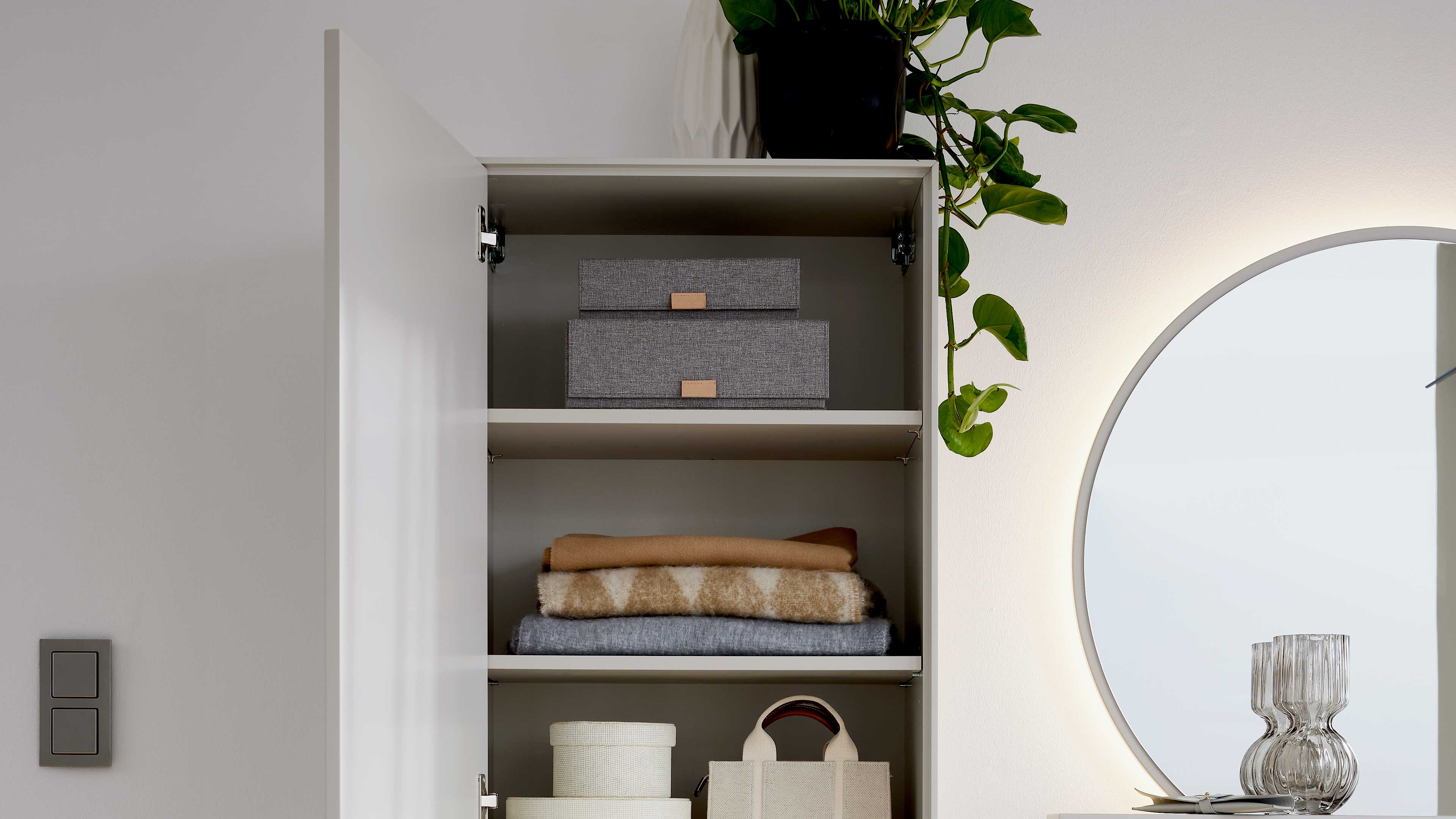 Garderobe in hellem Design mit Hängekommoden, Wandpaneel, Ablage und rundem Spiegel