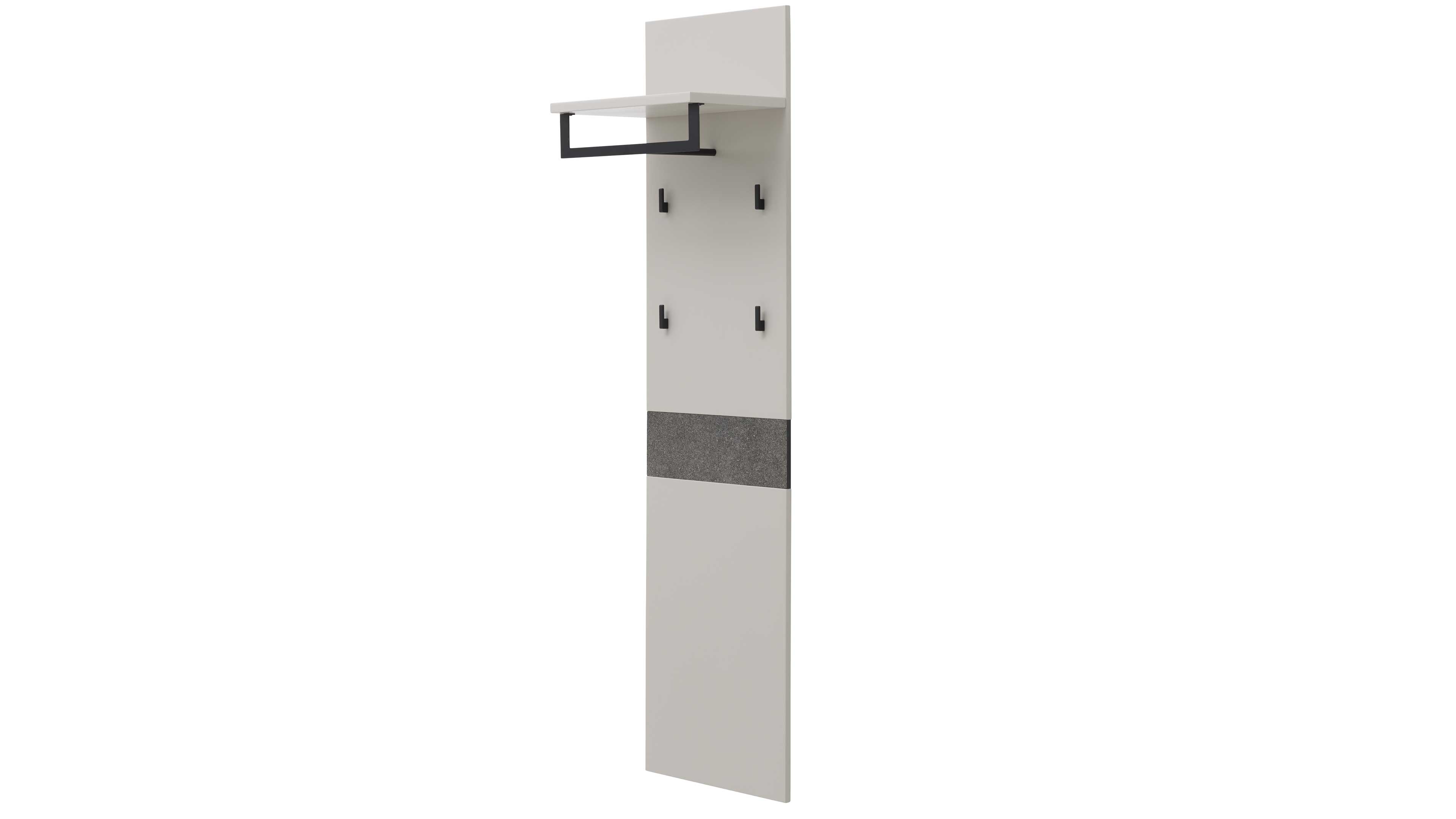 Das Set wird durch die Wandgarderobe mit Ablageboden, Kleiderstange und vier Kleiderhaken vervollständigt. Maße: ca. 45 x 173 x 32 cm (B/LxHxT) – kompakt und dennoch vielseitig nutzbar.