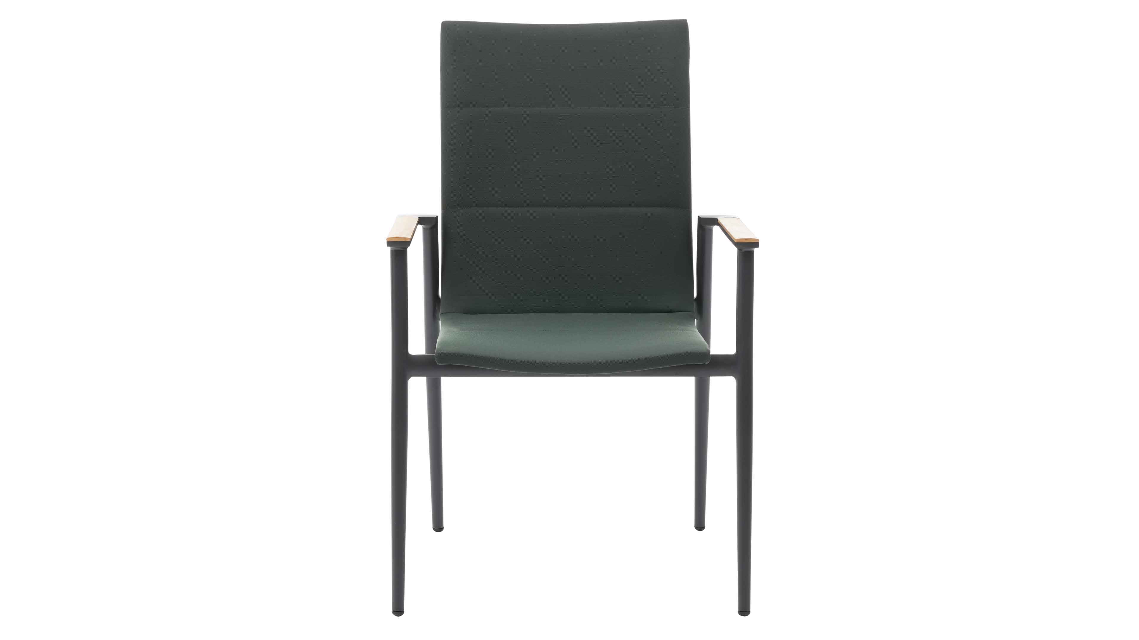 Gartenstuhl mit Aluminiumgestell und textiler Bespannung in Dunkelgrün mit Armlehnen in Teak-Optik