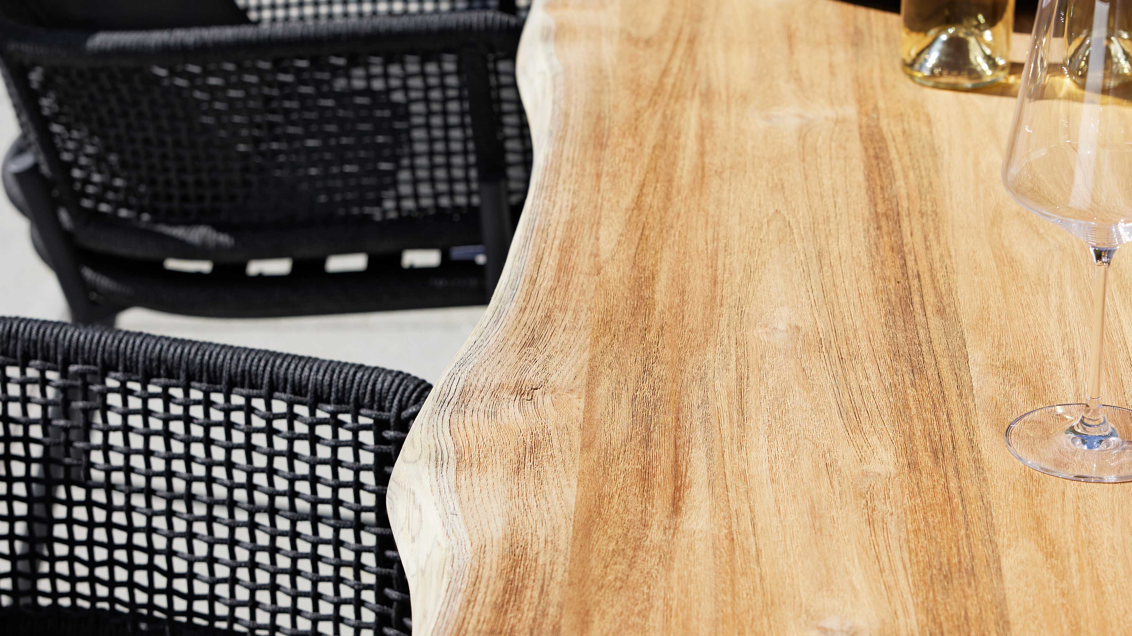 Outdoor-Esstisch mit modernem X-Gestell und Teakholzplatte mit Baumkante