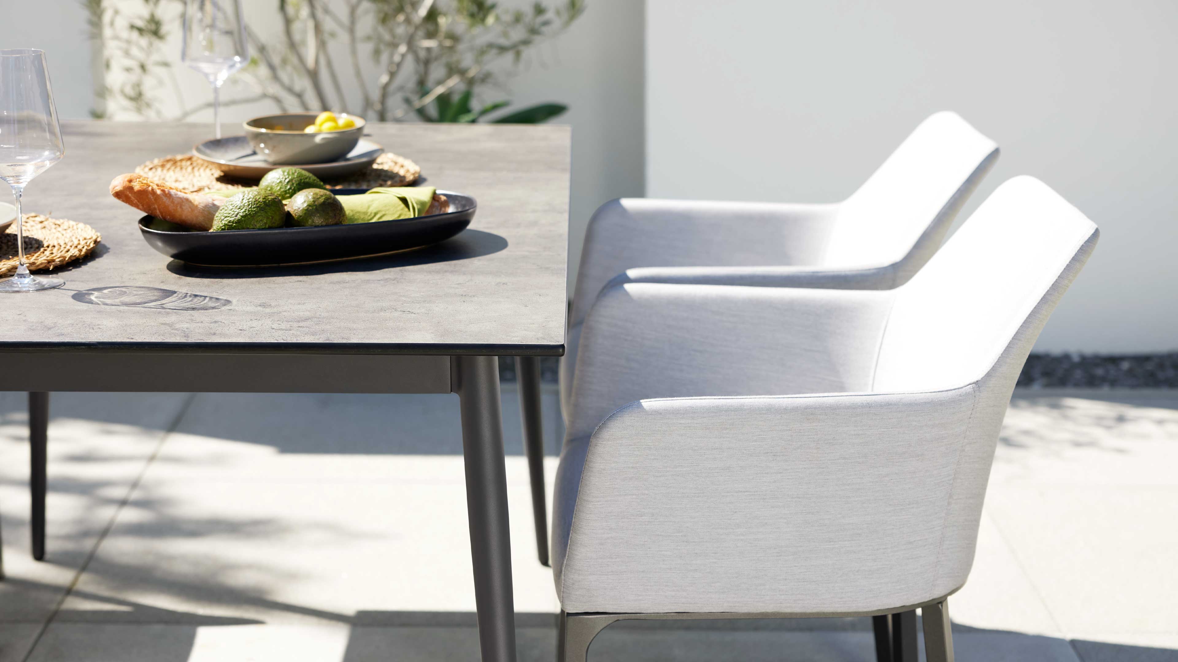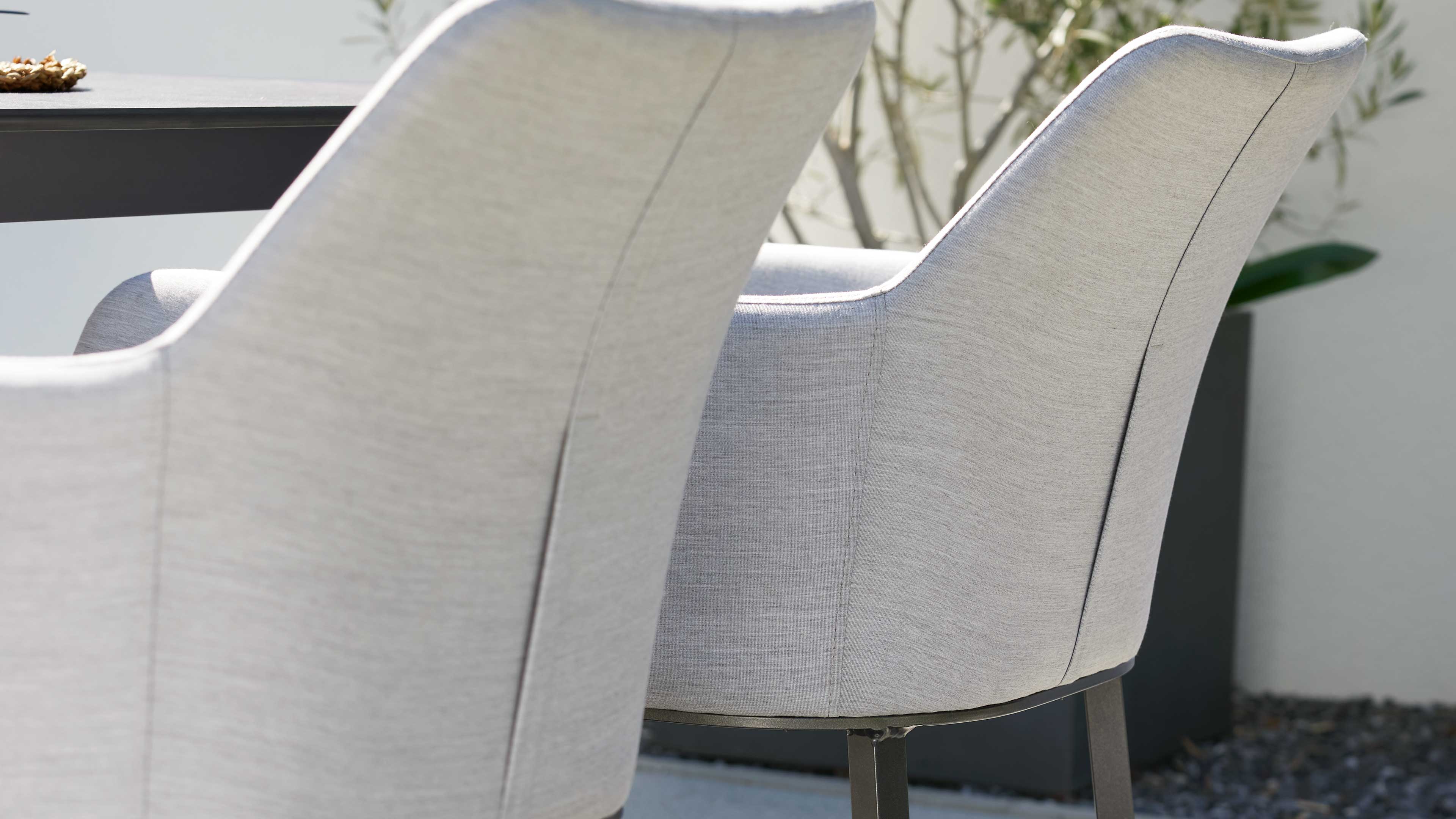 Dazu kommen vier Armlehnstühle mit hellgrauem Solution Dyed Acrylbezug und anthrazitfarben pulverbeschichtetem Aluminiumgestell. Die Stühle messen ca. 62 x 81 x 62 cm (BxHxT), bieten eine Sitzhöhe von ca. 46 cm und punkten mit PU-Schaumpolsterungen in Sitz und Rücken, ergänzt durch eine schützende Imprägnierung. Die Konstruktion macht sie zum komfortablen Diningstuhl und Gartensessel in einem. Besonders praktisch: Die Stühle werden fertig montiert geliefert.