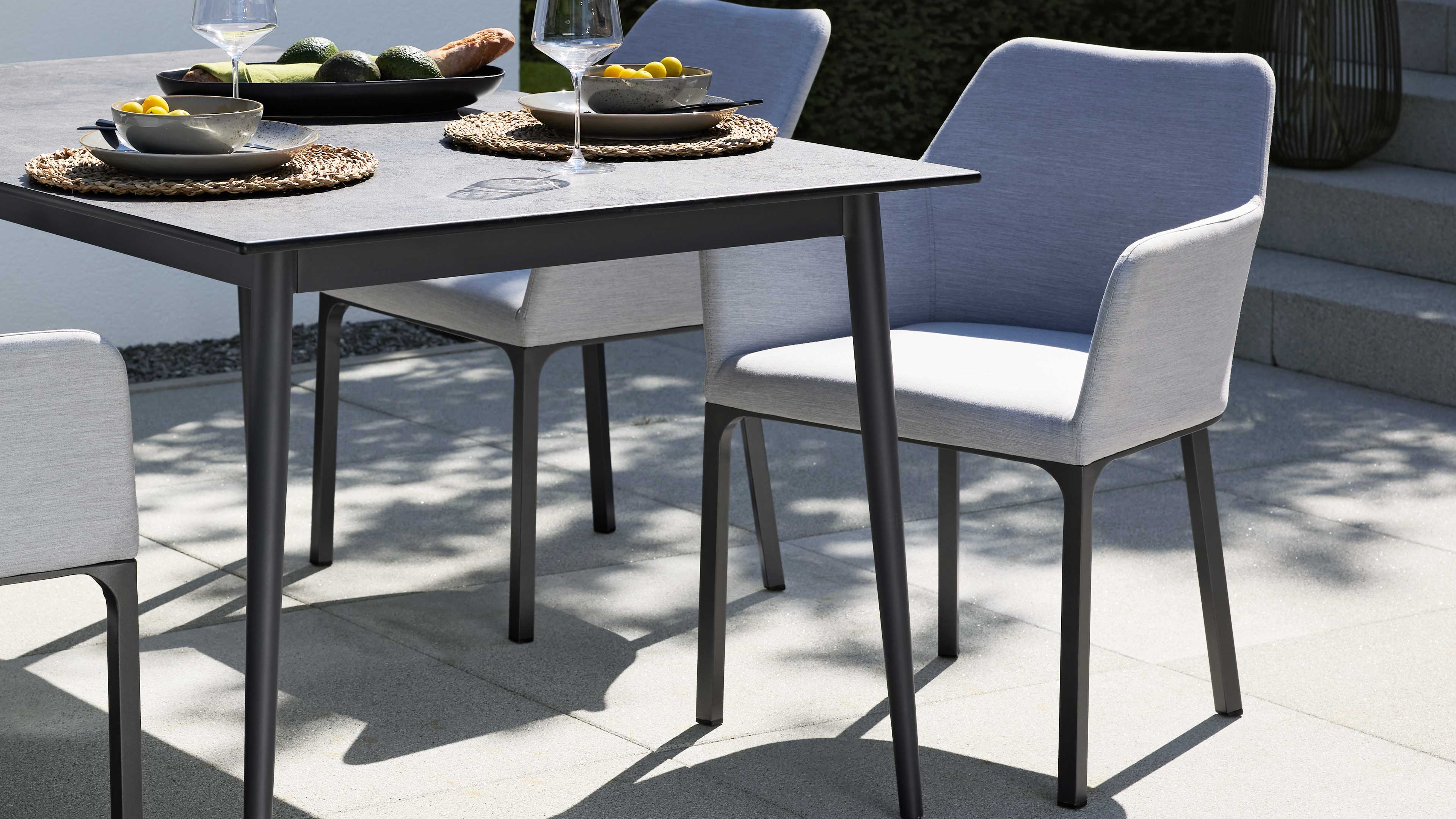 Kombiniere das Set mit passenden Accessoires wie Outdoor-Teppichen oder Kissen, um deinen Essbereich gemütlich zu gestalten. Plane ausreichend Bewegungsfläche rund um den Tisch ein, damit du und deine Gäste bequem sitzen und aufstehen könnt. Die moderne Materialkombination aus HPL, Aluminium und hochwertigem Solution Dyed Bezug fügt sich in verschiedenste Gartenstile ein – von modern bis natürlich.