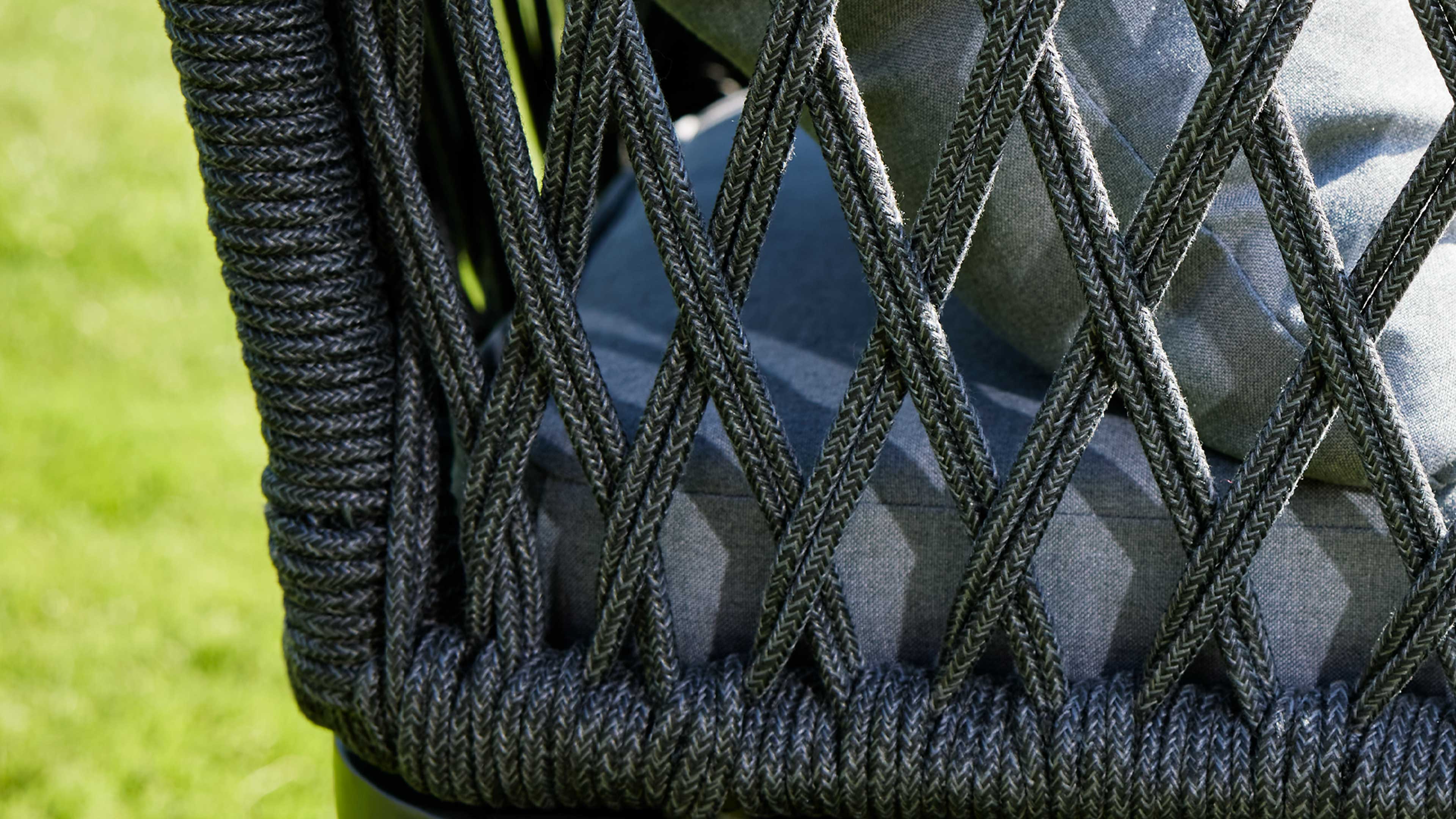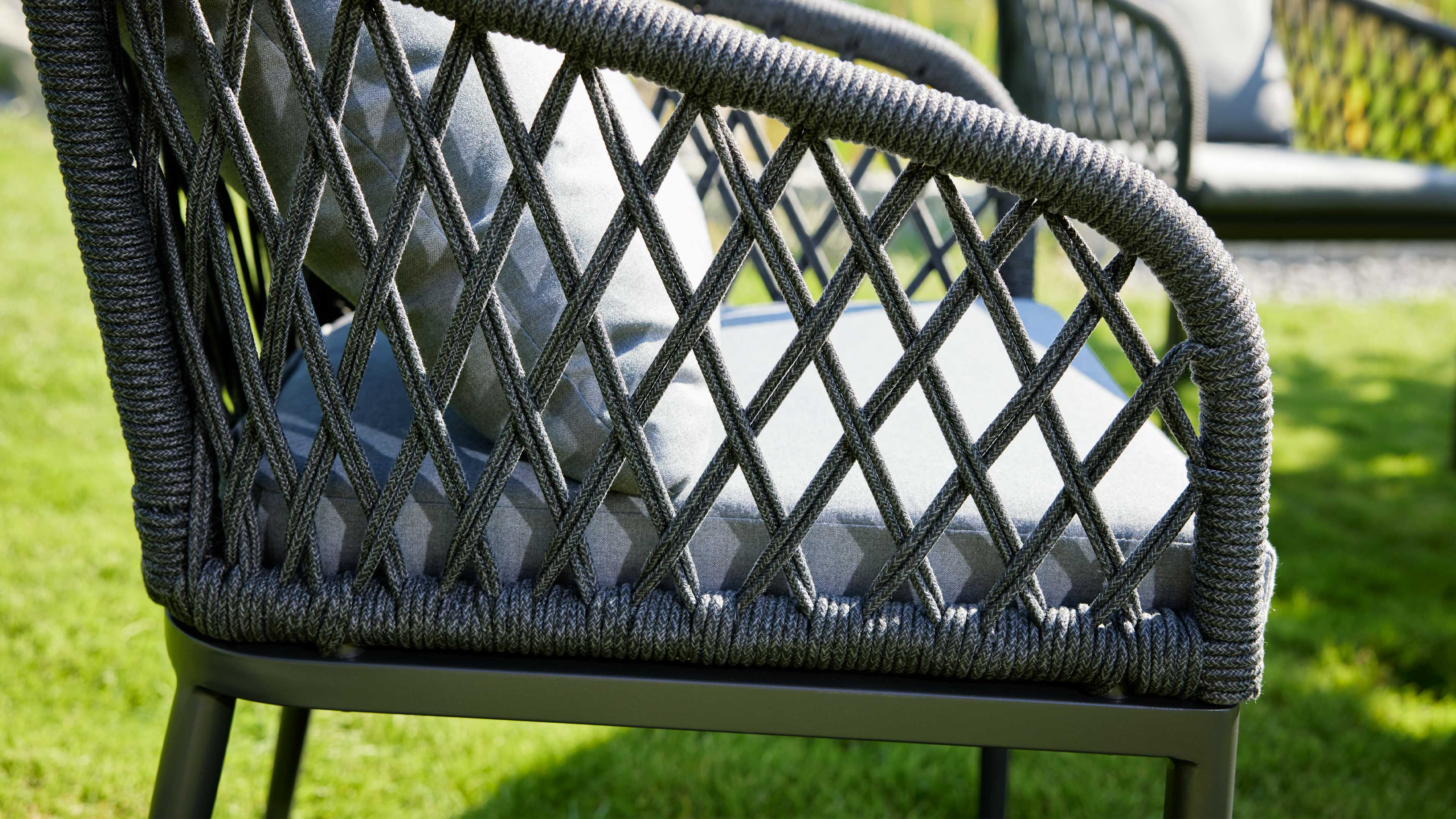 Dazu erhältst du vier Diningsessel, gestaltet mit grauem Kordelgeflecht in Rautenoptik und einem anthrazitfarben pulverbeschichteten Aluminiumgestell. Das Kordelmaterial besteht zu 100 % aus Polyester – witterungsbeständig, formstabil und strapazierfähig. Sitz- und Rückenkissen mit komfortabler PU-Schaumfüllung sowie die abnehmbaren dunkelgrauen Bezüge, die du bei 30 Grad waschen kannst, sorgen für ein bequemes Sitzgefühl. Mit ihren ca. 56 x 78 x 63 cm (BxHxT) und einer Sitzhöhe von ca. 47 cm bieten die Armlehnstühle ergonomischen Outdoor-Komfort. Praktisch für dich: Die Stühle werden fertig montiert geliefert.