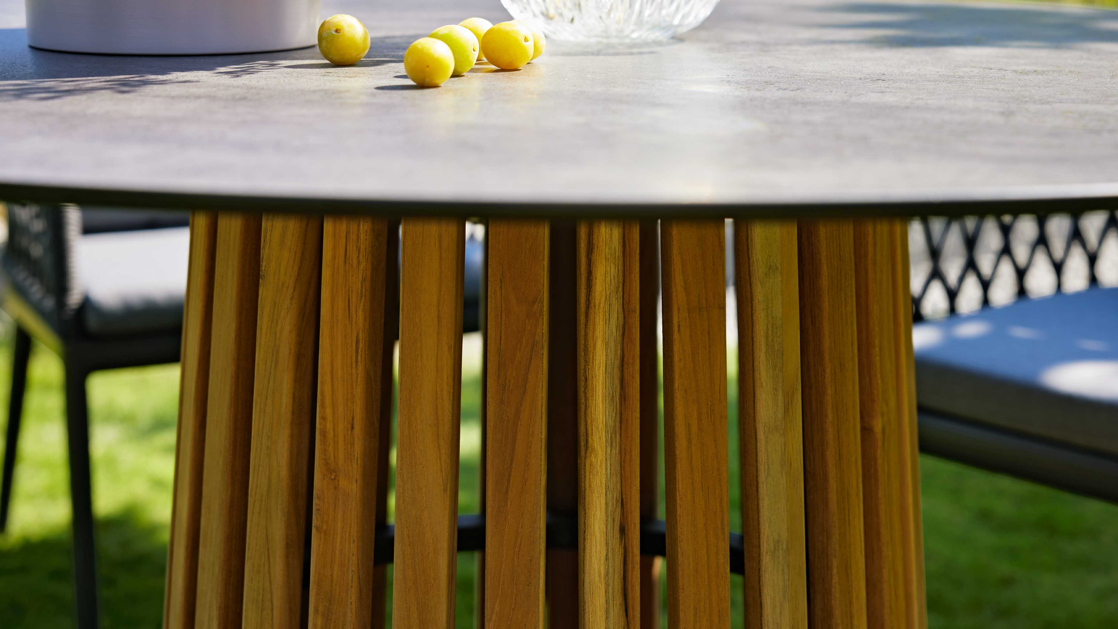 Die edle Facettenkante und die leicht gebürsteten Teakholzlamellen verleihen dem Tisch eine warme, natürliche Note. Das pulverbeschichtete Aluminiumgestell in Anthrazit sorgt für Stabilität und einen modernen Look. Mit einem Durchmesser von ca. 125 cm, einer Höhe von ca. 76 cm und einer Plattenstärke von ca. 13 mm fügt sich der Tisch harmonisch in verschiedenste Gartenkonzepte ein. Du kannst ihn in zwei Größen und vier attraktiven Farbvarianten wählen.
