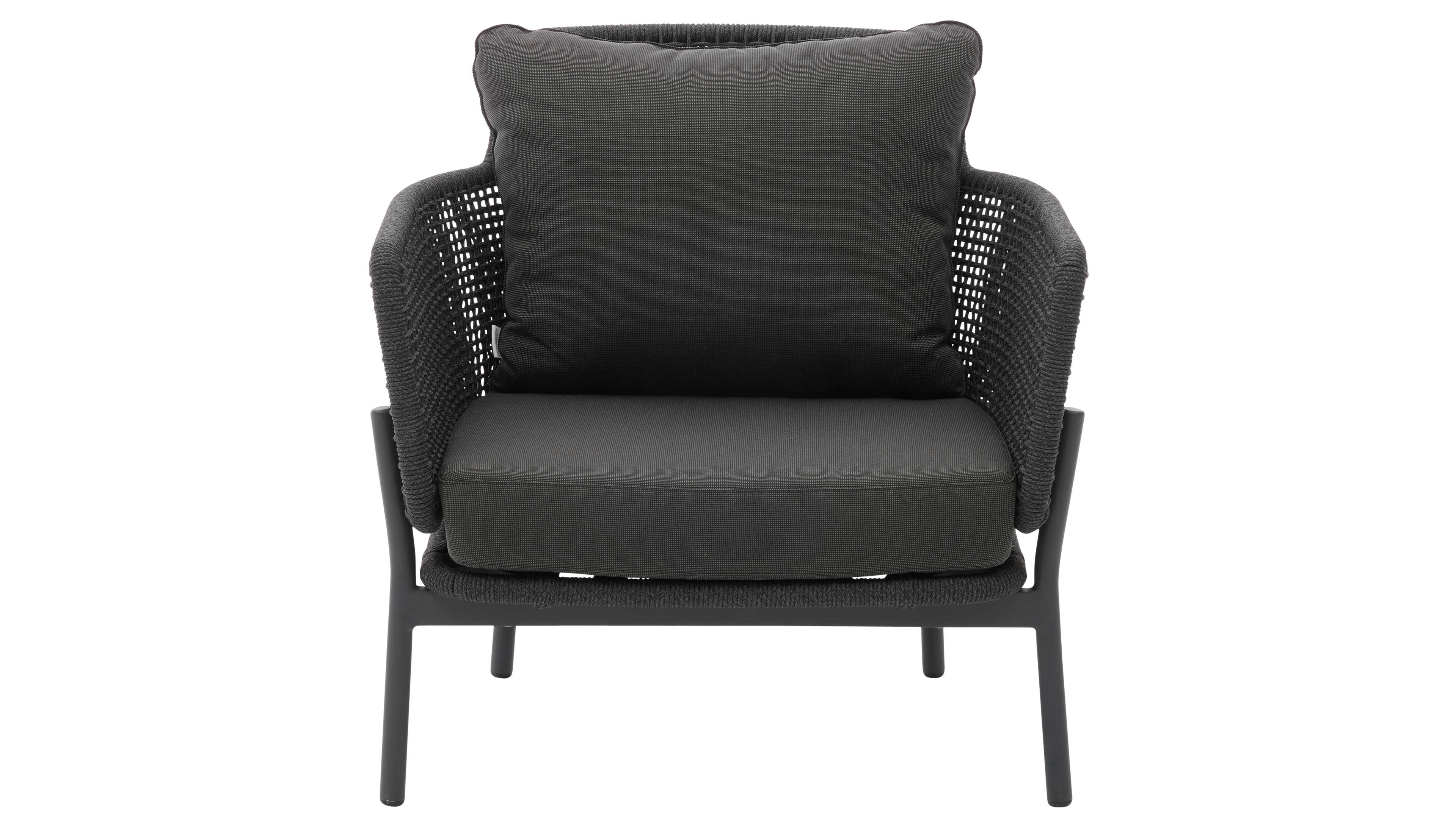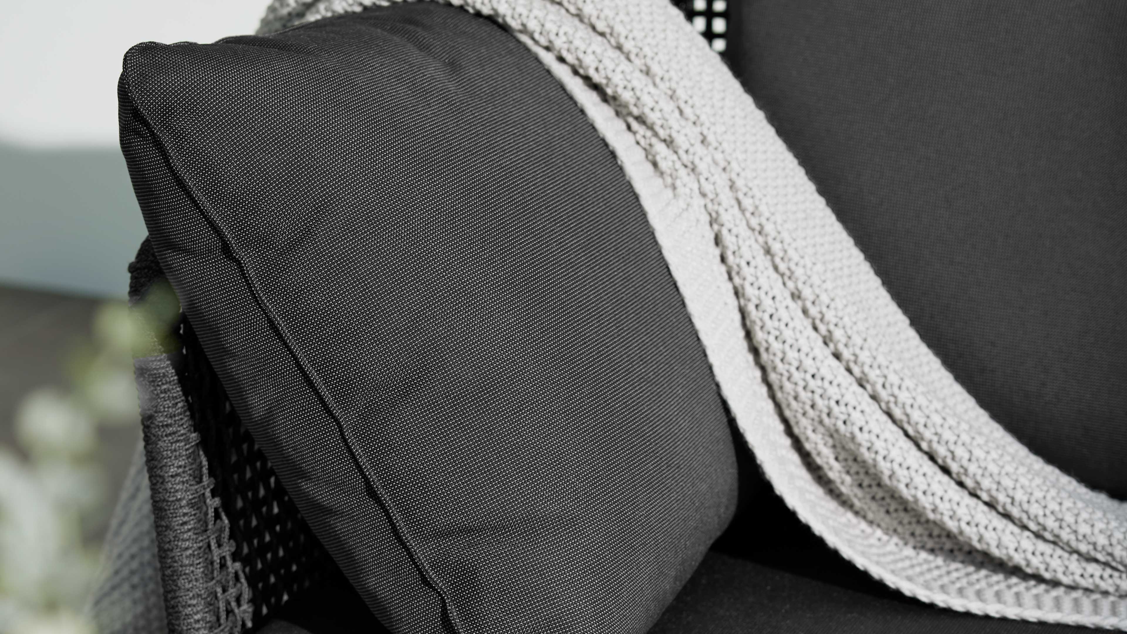 Mit seinem Kordelgeflecht, den dunklen Bezügen und dem klaren Aluminiumgestell passt der Sessel ideal zu modernen, natürlichen oder skandinavisch inspirierten Outdoor-Bereichen. Kombiniere ihn mit Pflanzen, hellen Outdoor-Kissen oder leichten Teppichen, um eine warme, einladende Atmosphäre zu schaffen.