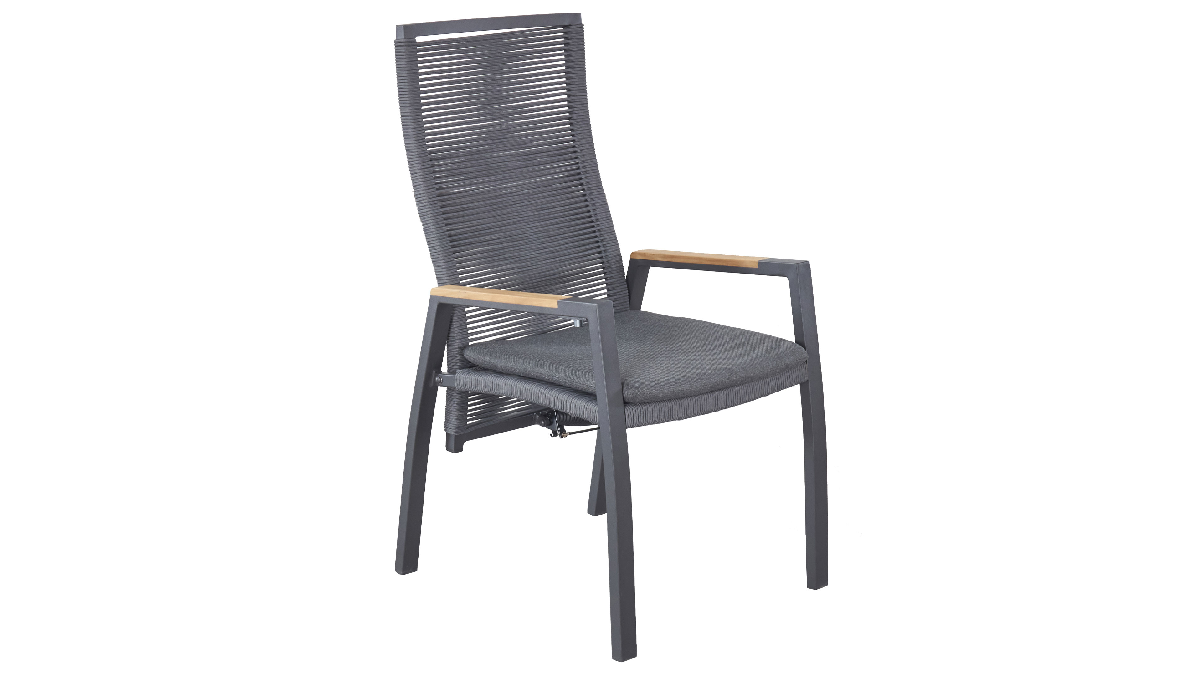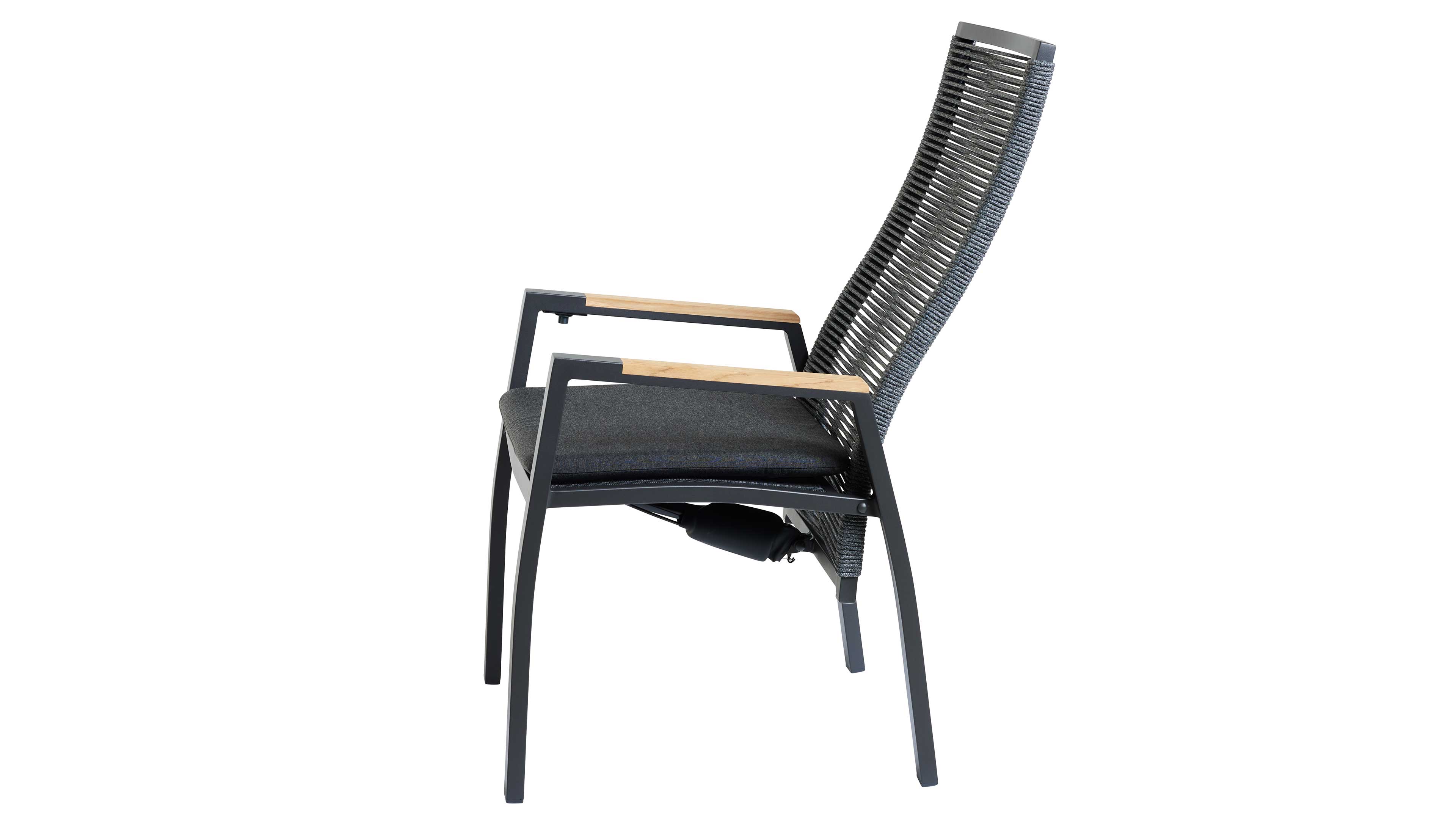 Stufenlos verstellbarer Gartenstuhl mit moderner Seilbespannung, komfortablem Sitzpolster und edlen Teakholz-Armlehnen