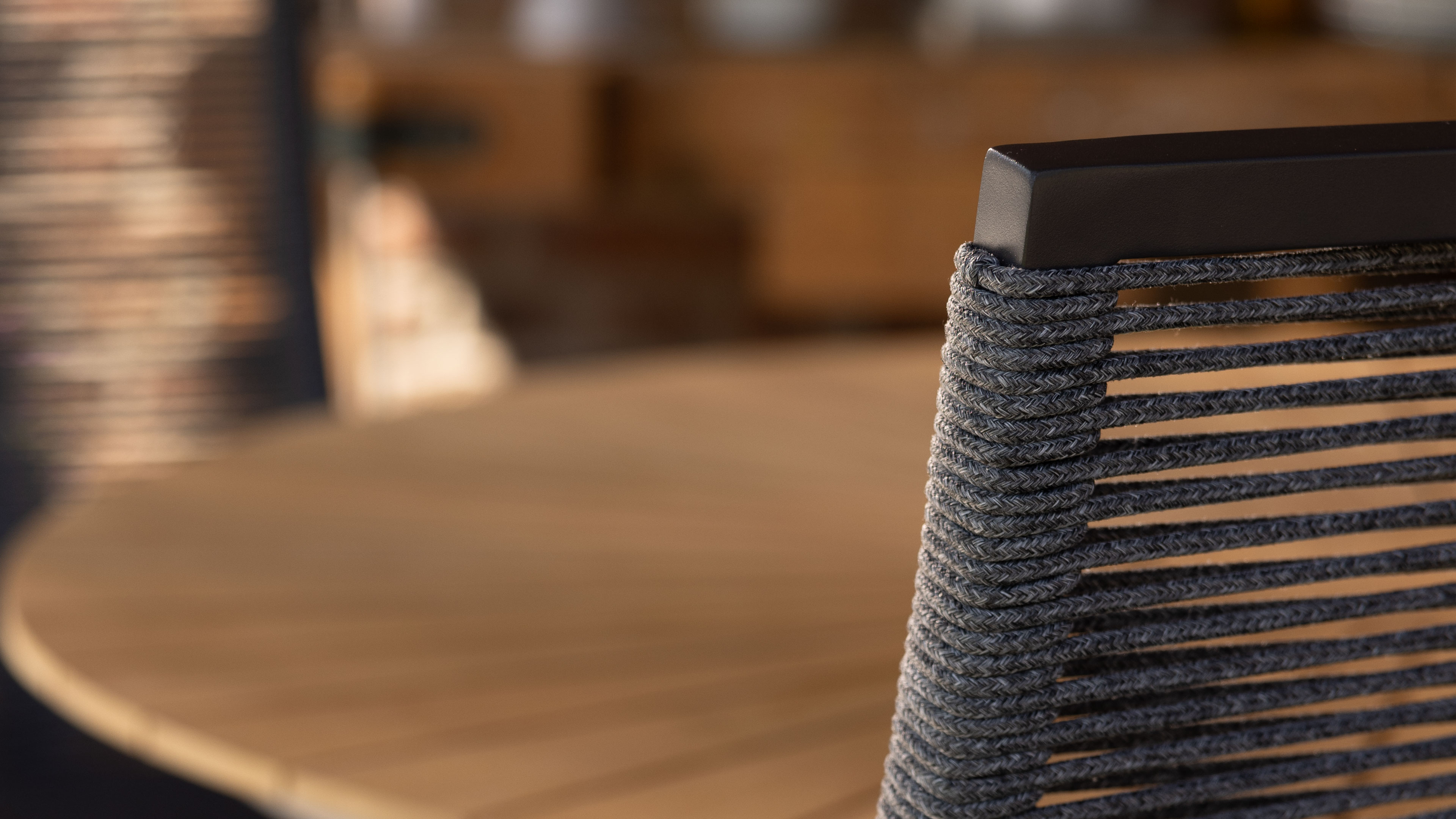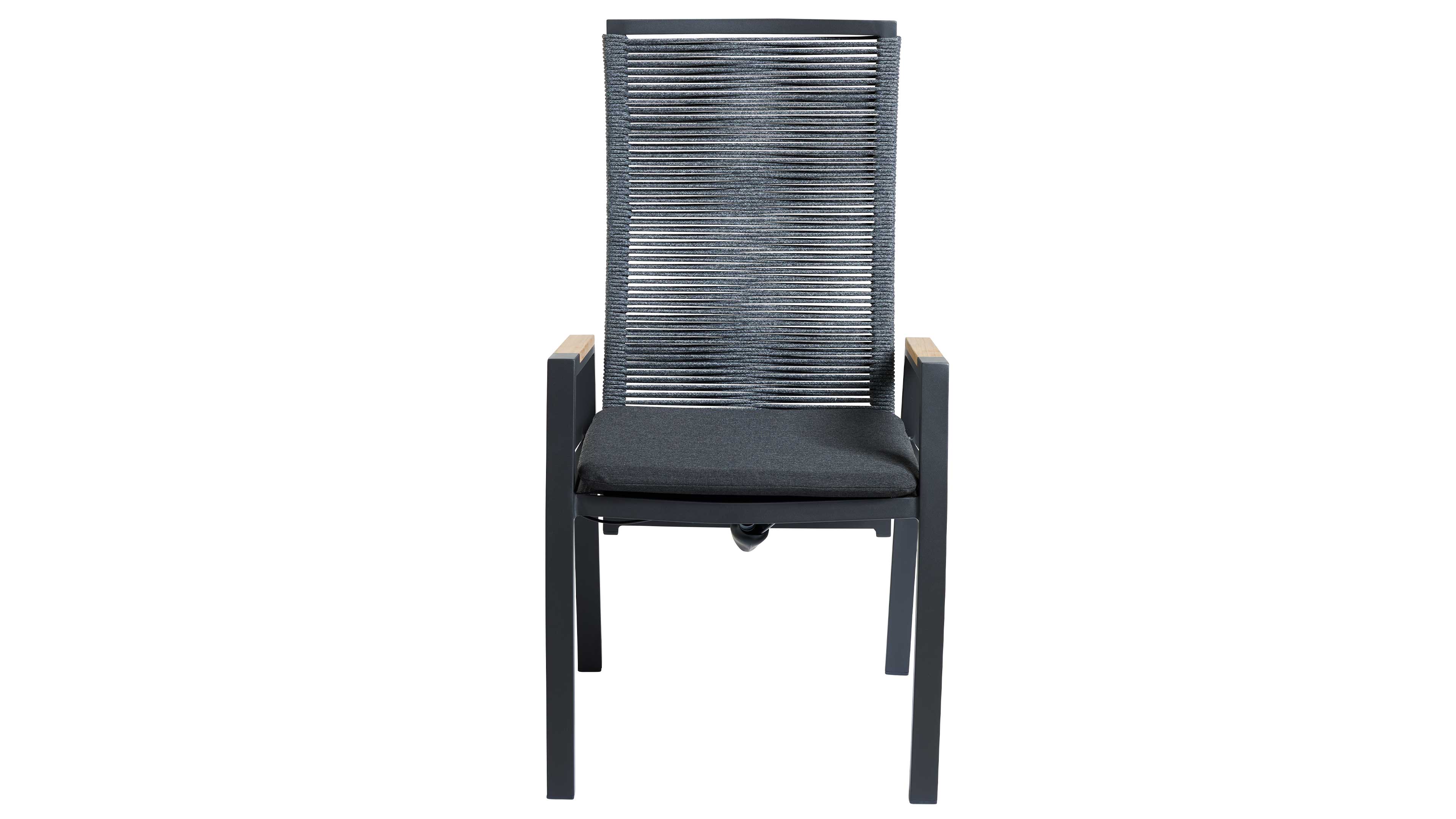 Der Positionsstuhl aus der Interliving Gartenmöbel Serie 7011 kombiniert moderne Funktionalität mit hochwertigem Materialmix und natürlicher Eleganz. Die stilvolle Verbindung aus anthrazitfarbener Rope- und TEXTILENE®-Bespannung, einem pulverbeschichteten Aluminiumgestell und edlen Teakholzeinlagen in den Armlehnen macht diesen Outdoor-Armlehnstuhl zu einem echten Blickfang für Terrasse, Balkon oder Garten.